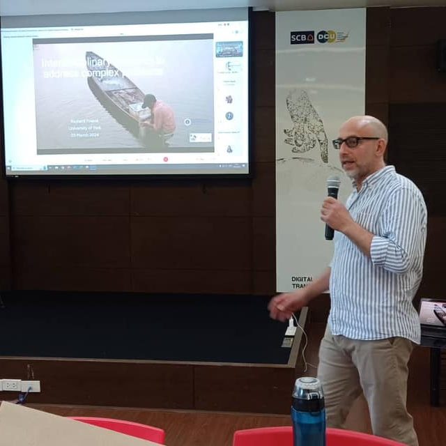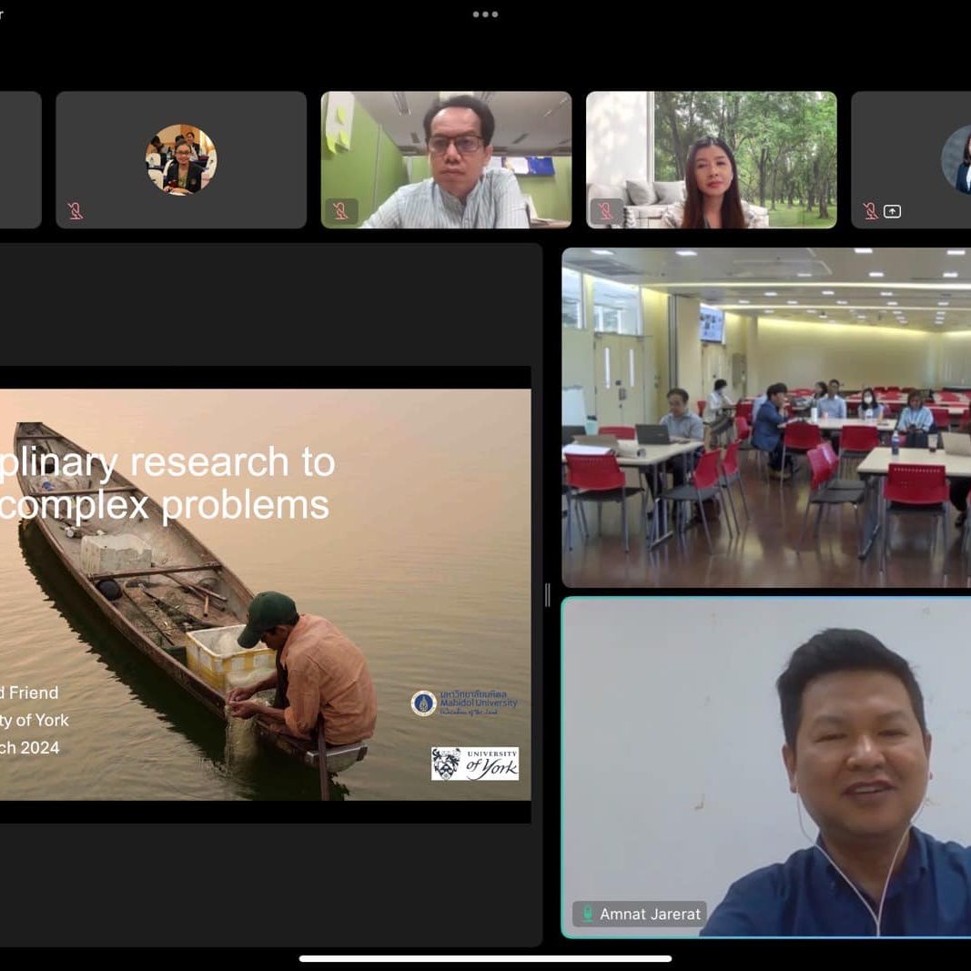 On March 29, 2024, Asst. Prof. Dr. Amnat Jarerat, Assistant to the Vice President for Kanchanaburi Campus, presided over the meeting to proceed with “Mahidol – York Interdisciplinary Living Research Excellence Center” with the University of York, United Kingdom, under the Mahidol University Scholarship for International Collaboration Development, Fiscal Year 2024, by International Relations Division, Mahidol University. The meeting was led by Dr. Jutamas Kaewsuk, Head of the Environmental Engineering and Disaster Management Program and project leader, along with lecturers from Kanchanaburi Campus, Dr. Richard M. Friend from the Department of Environment and Geography, University of York, Dr. Marc Voelker from Institute for Population and Social Research (IPSR), and a research team from Amnat Charoen Campus and Nakhon Sawan Campus, Mahidol University. The purpose of this meeting is to announce the objectives and implementation plan of the aforementioned project at the Nillakan Meeting Room, Lecture Hall, Mahidol University Kanchanaburi Campus, and via online meeting.