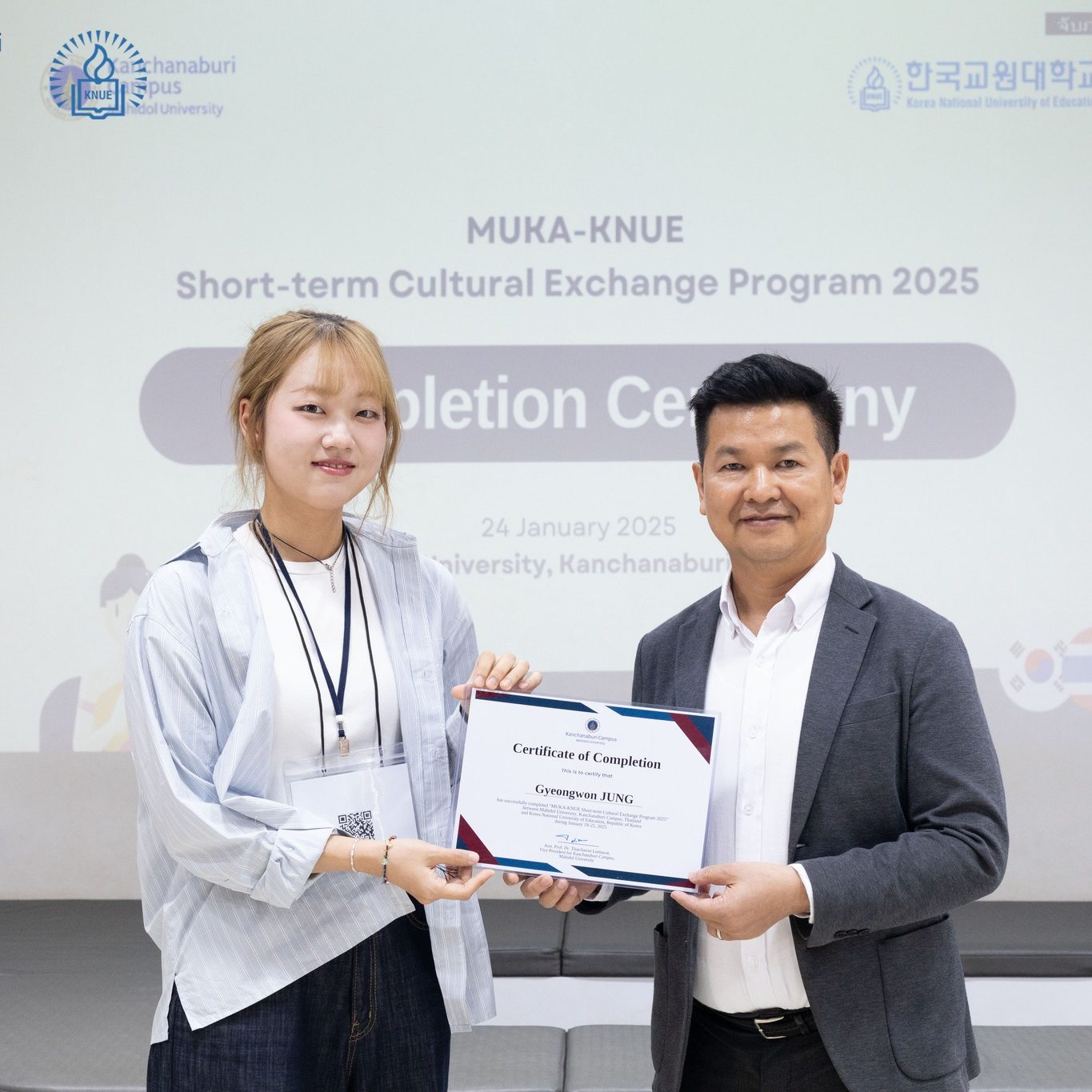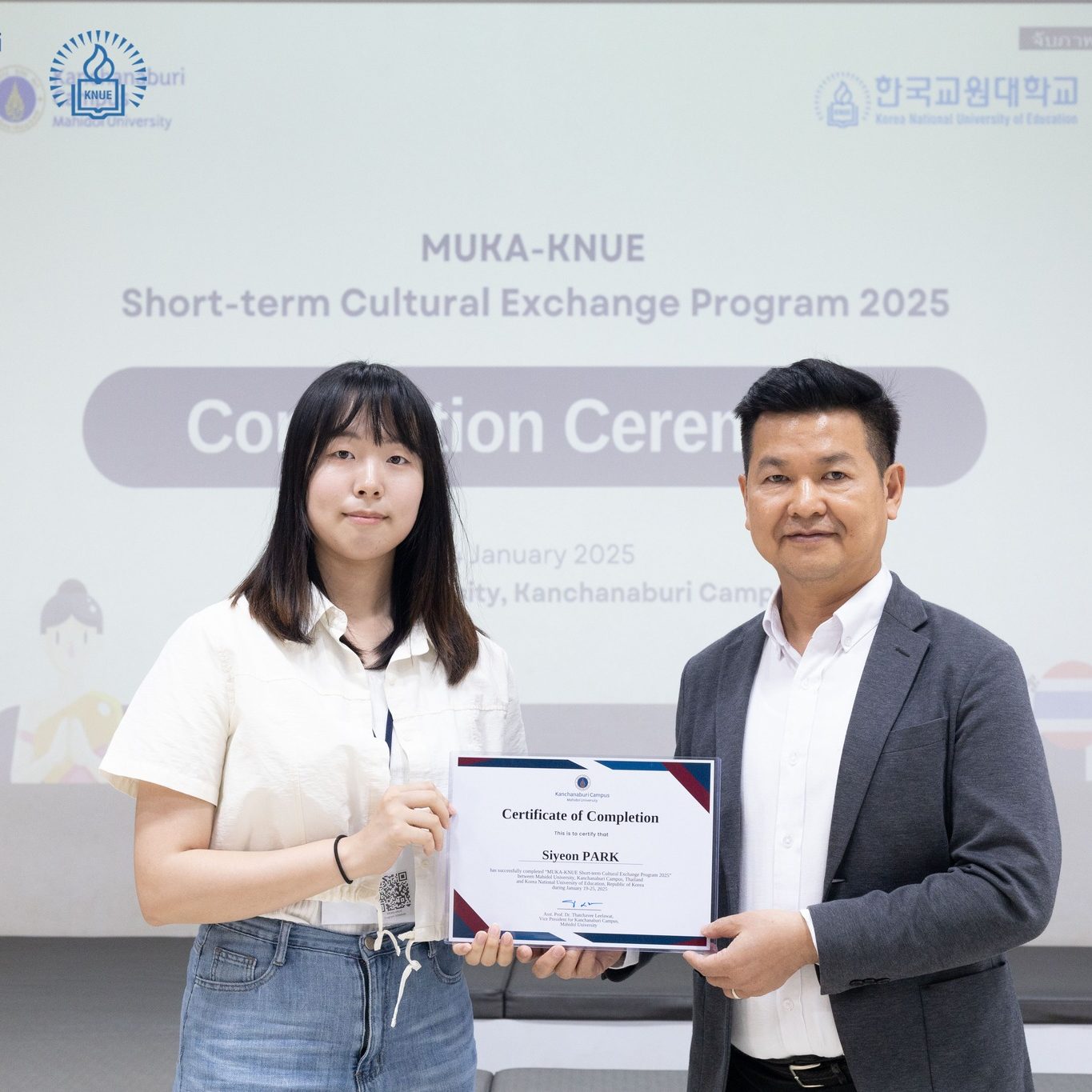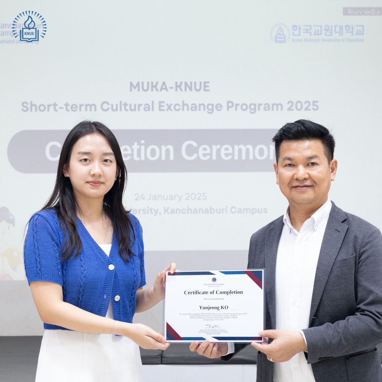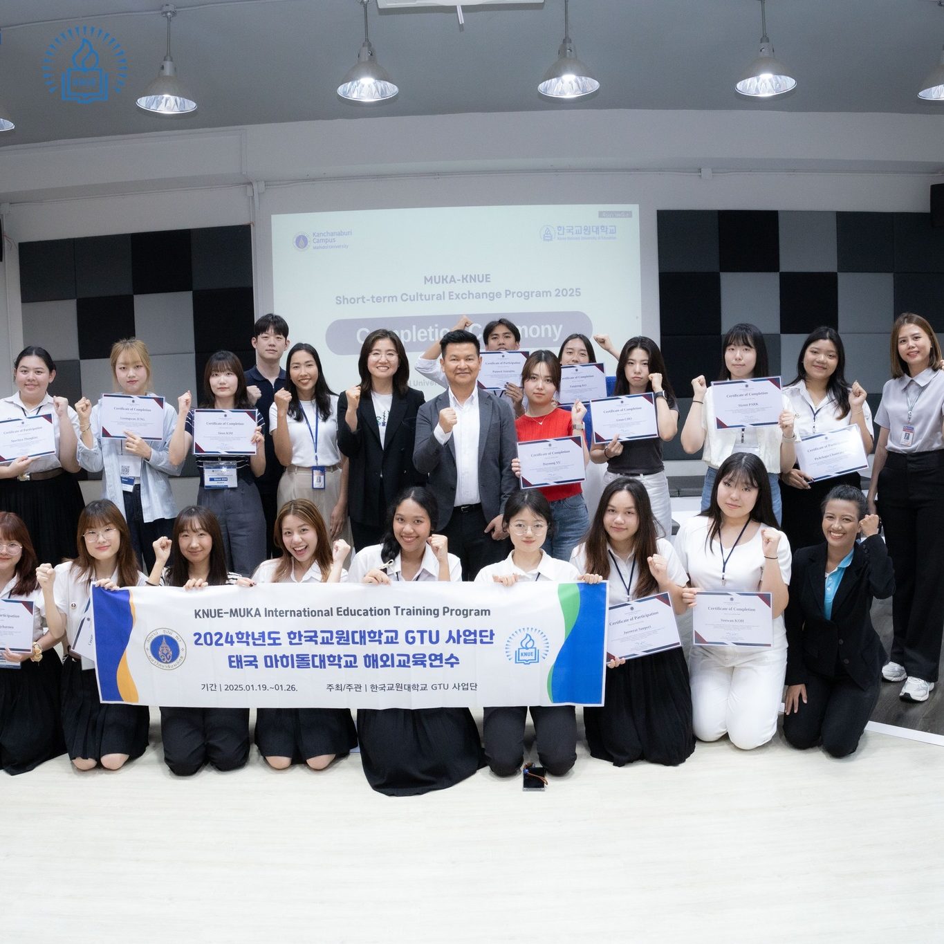 On January 24, 2025, Asst. Prof. Dr. Amnat Jarerat, Assistant to the President for Kanchanaburi Campus, presided over the completion ceremony for students who participated in the “MUKA-KNUE Short-term Cultural Exchange Program 2025.” and delivered the closing remarks, commended the students from Korea National University of Education, Republic of Korea, and Kanchanaburi Campus students who joined the program.
