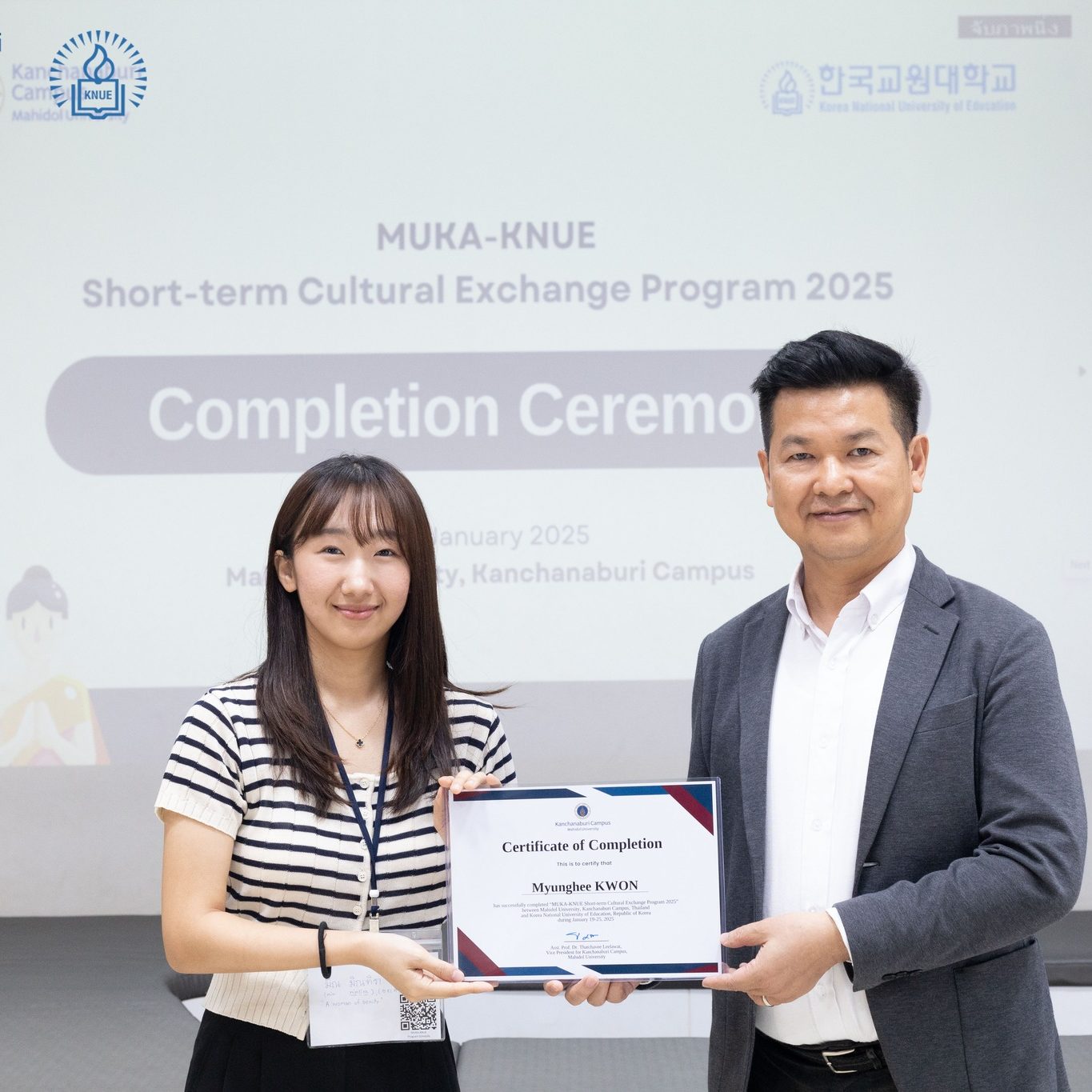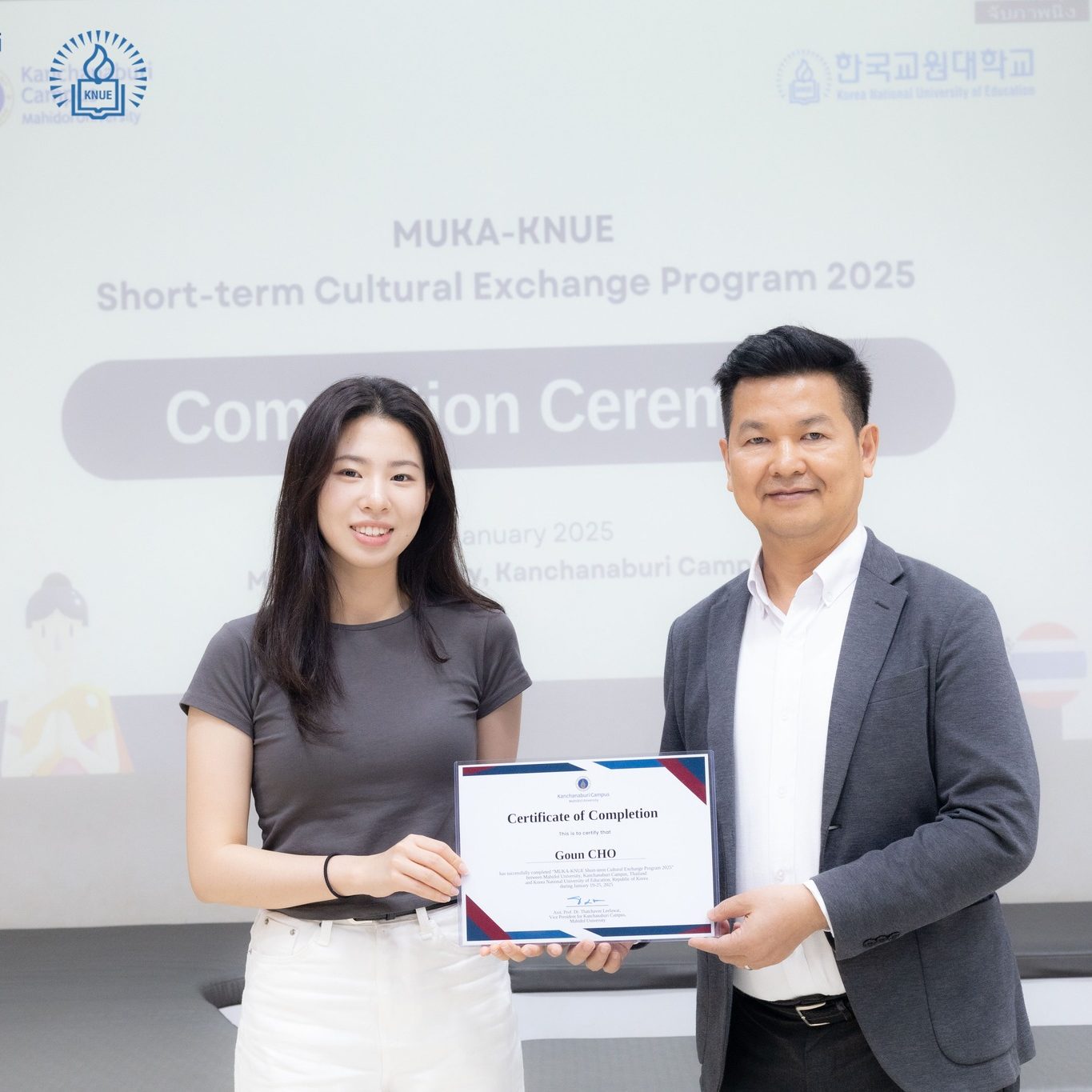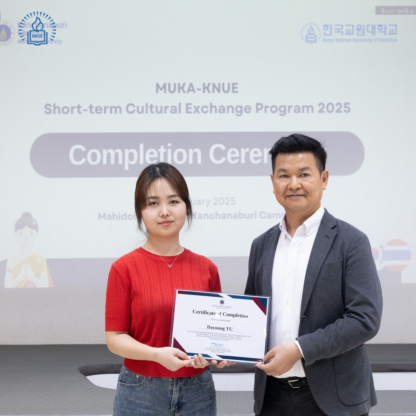 On January 24, 2025, Asst. Prof. Dr. Amnat Jarerat, Assistant to the President for Kanchanaburi Campus, presided over the completion ceremony for students who participated in the “MUKA-KNUE Short-term Cultural Exchange Program 2025.” and delivered the closing remarks, commended the students from Korea National University of Education, Republic of Korea, and Kanchanaburi Campus students who joined the program.