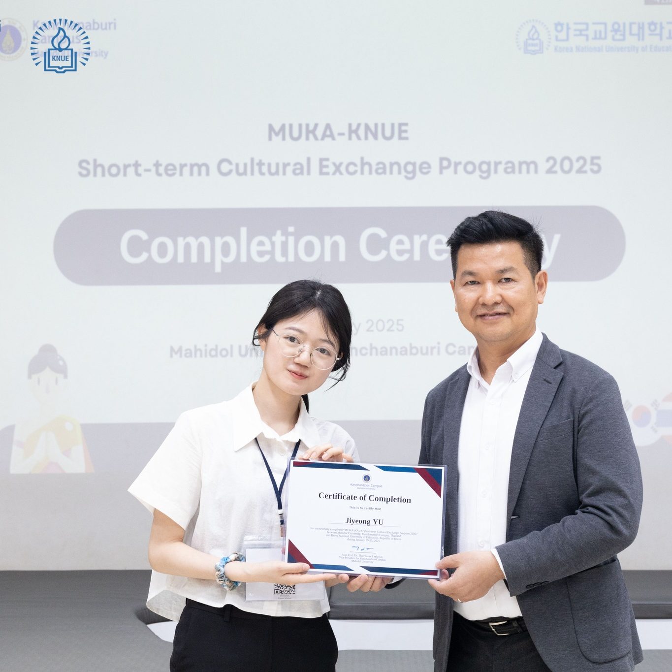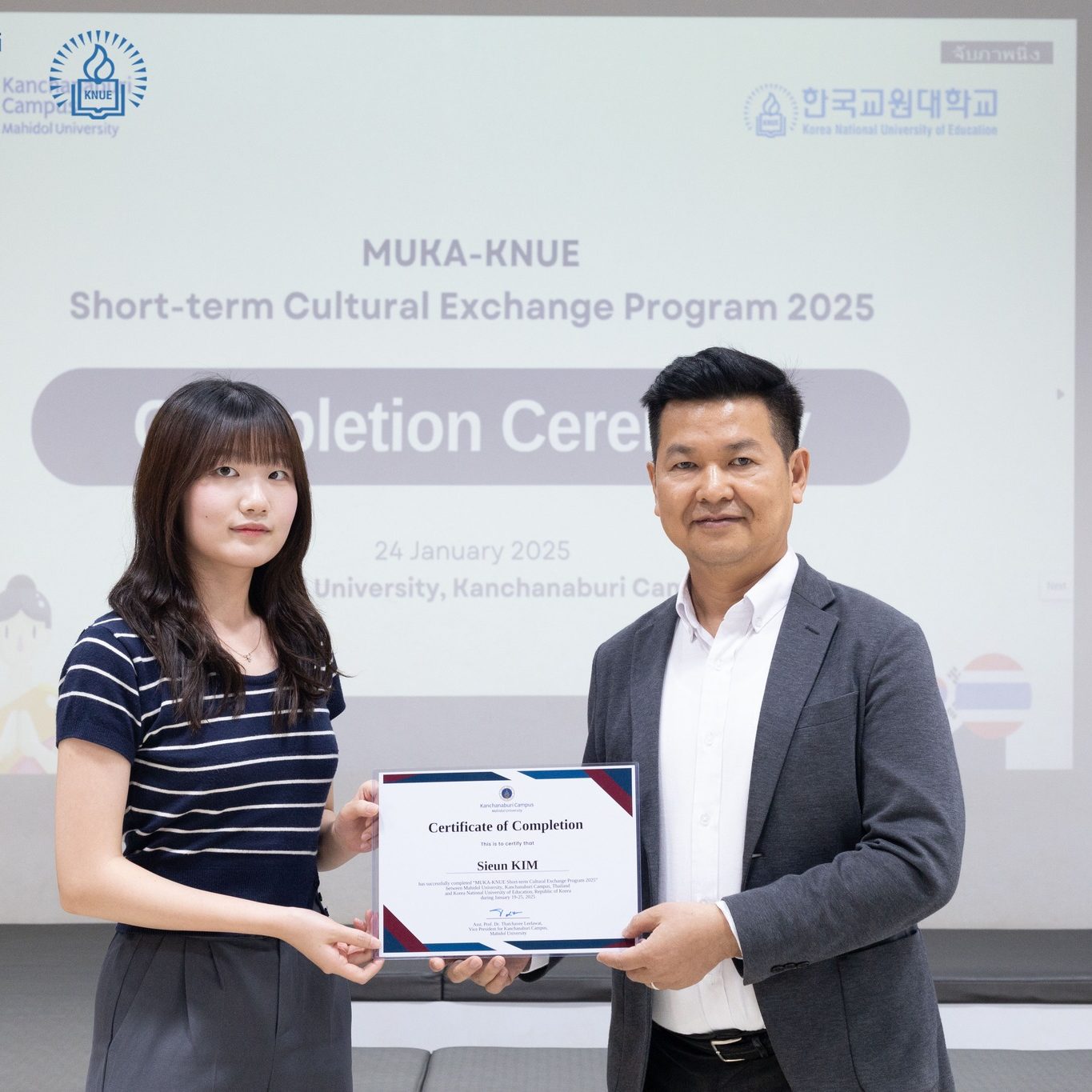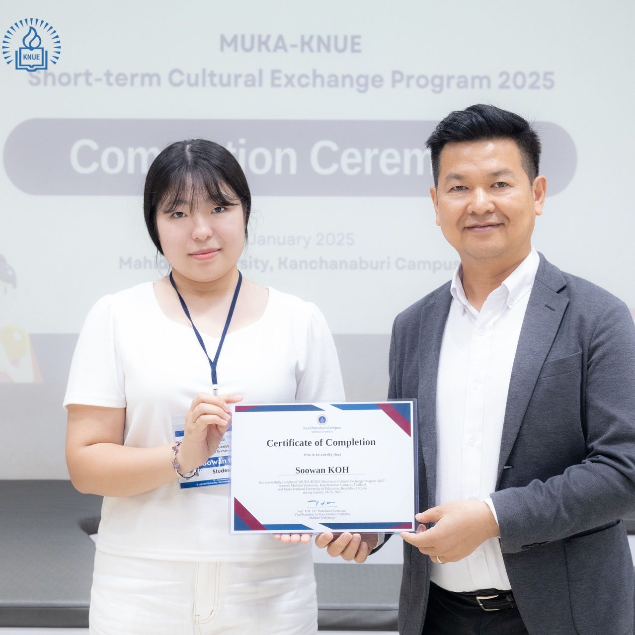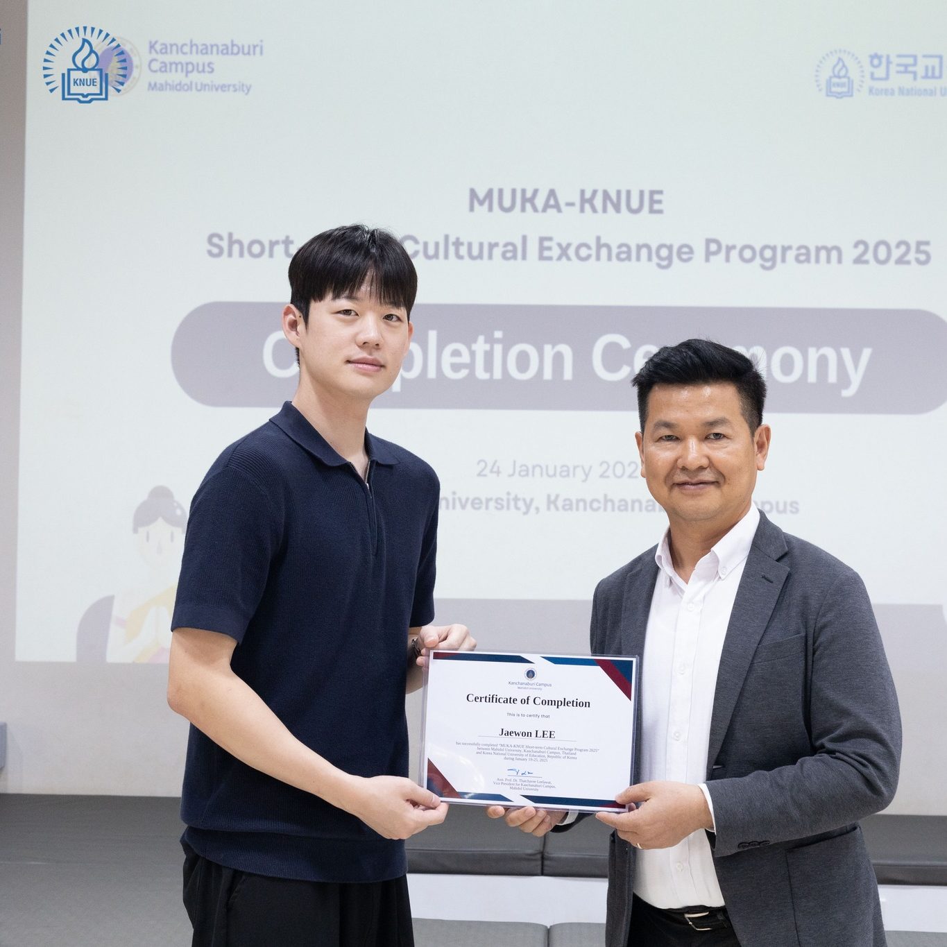 On January 24, 2025, Asst. Prof. Dr. Amnat Jarerat, Assistant to the President for Kanchanaburi Campus, presided over the completion ceremony for students who participated in the “MUKA-KNUE Short-term Cultural Exchange Program 2025.” and delivered the closing remarks, commended the students from Korea National University of Education, Republic of Korea, and Kanchanaburi Campus students who joined the program.