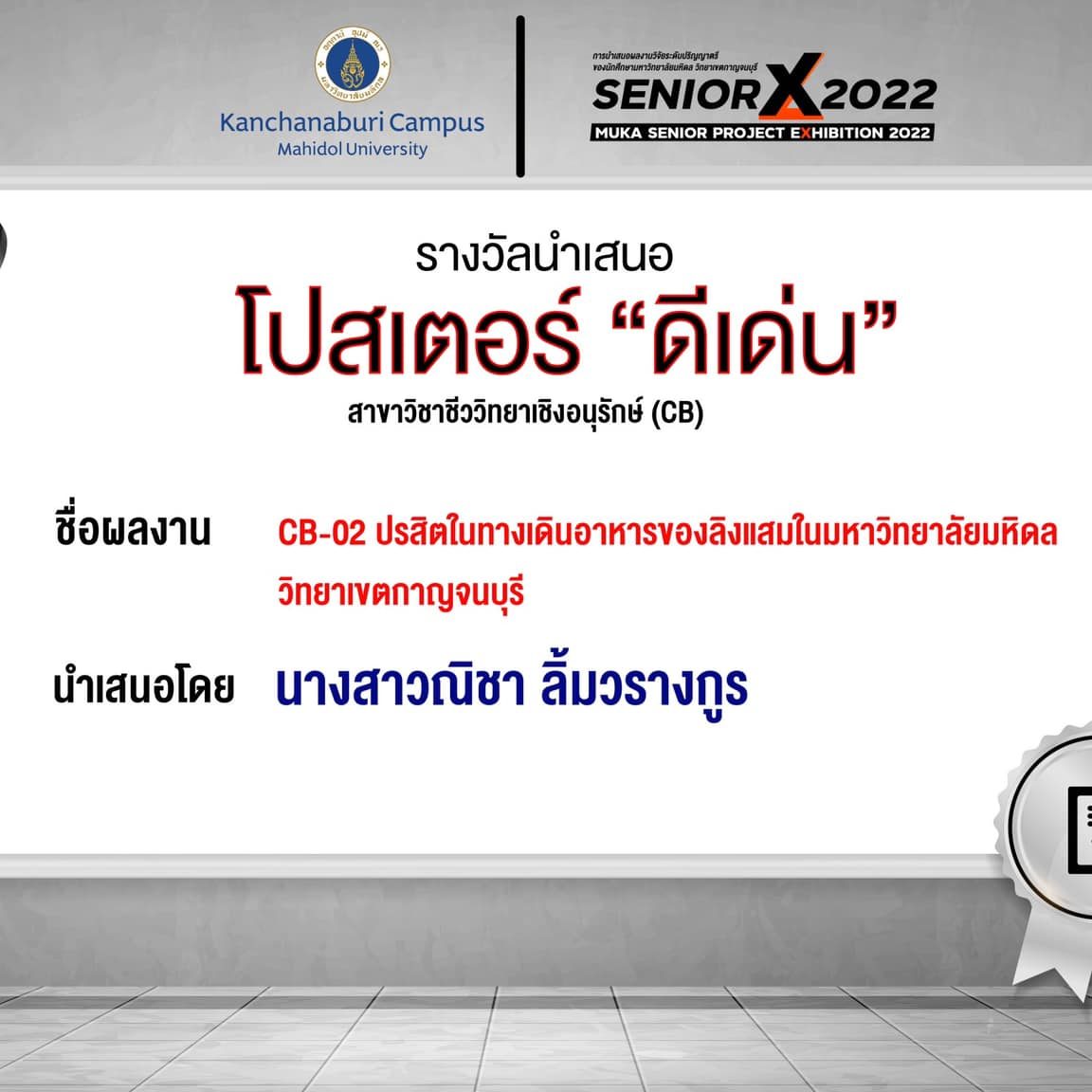 CB02 Gastrointestinal parasites of long-tailed macaque (Macaca fascicularis) at Mahidol University Kanchanaburi campus By Miss.Nicha Limwarangkoon