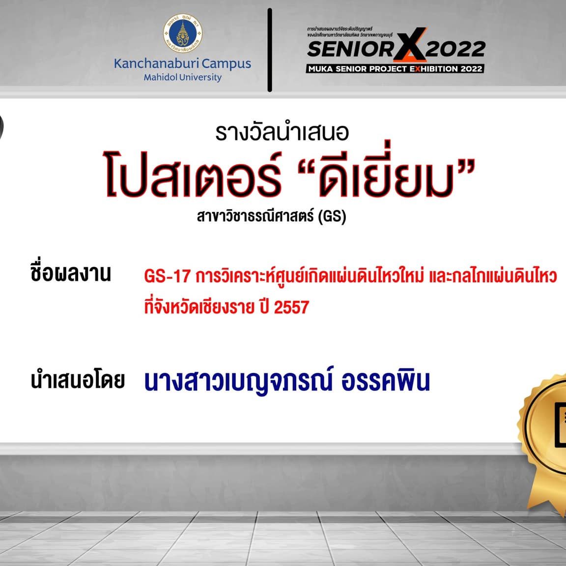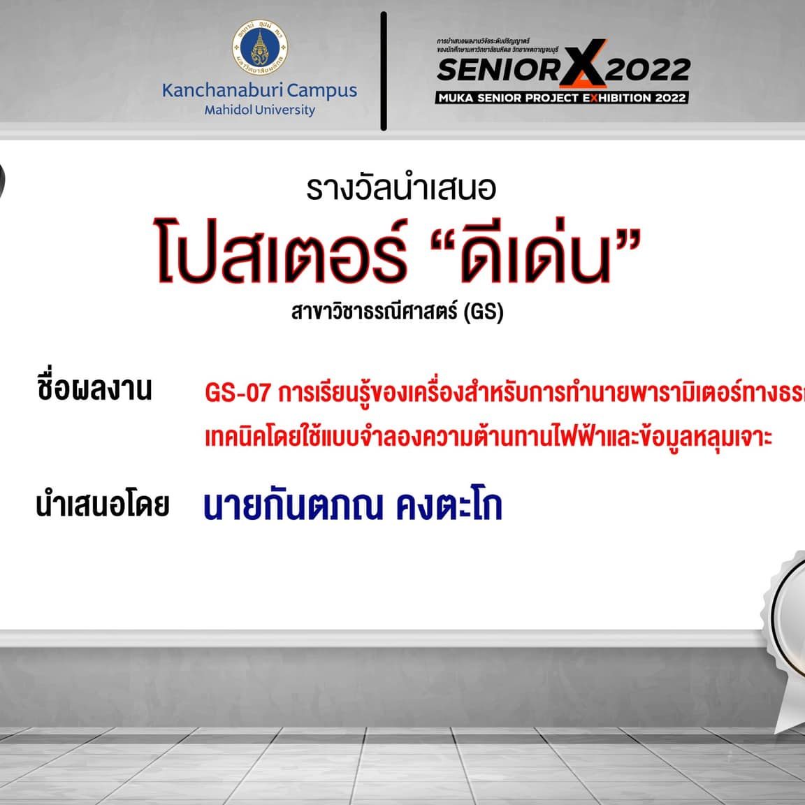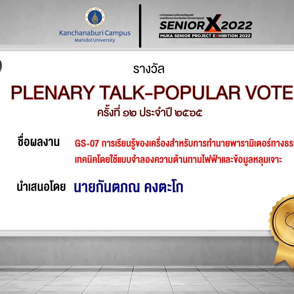 Plenary talk popular vote: GS07 Machine learning algorithms for predicting geotechnical parameters using electrical resistivity model and borehole data By Mr.Kantapon Kongtago