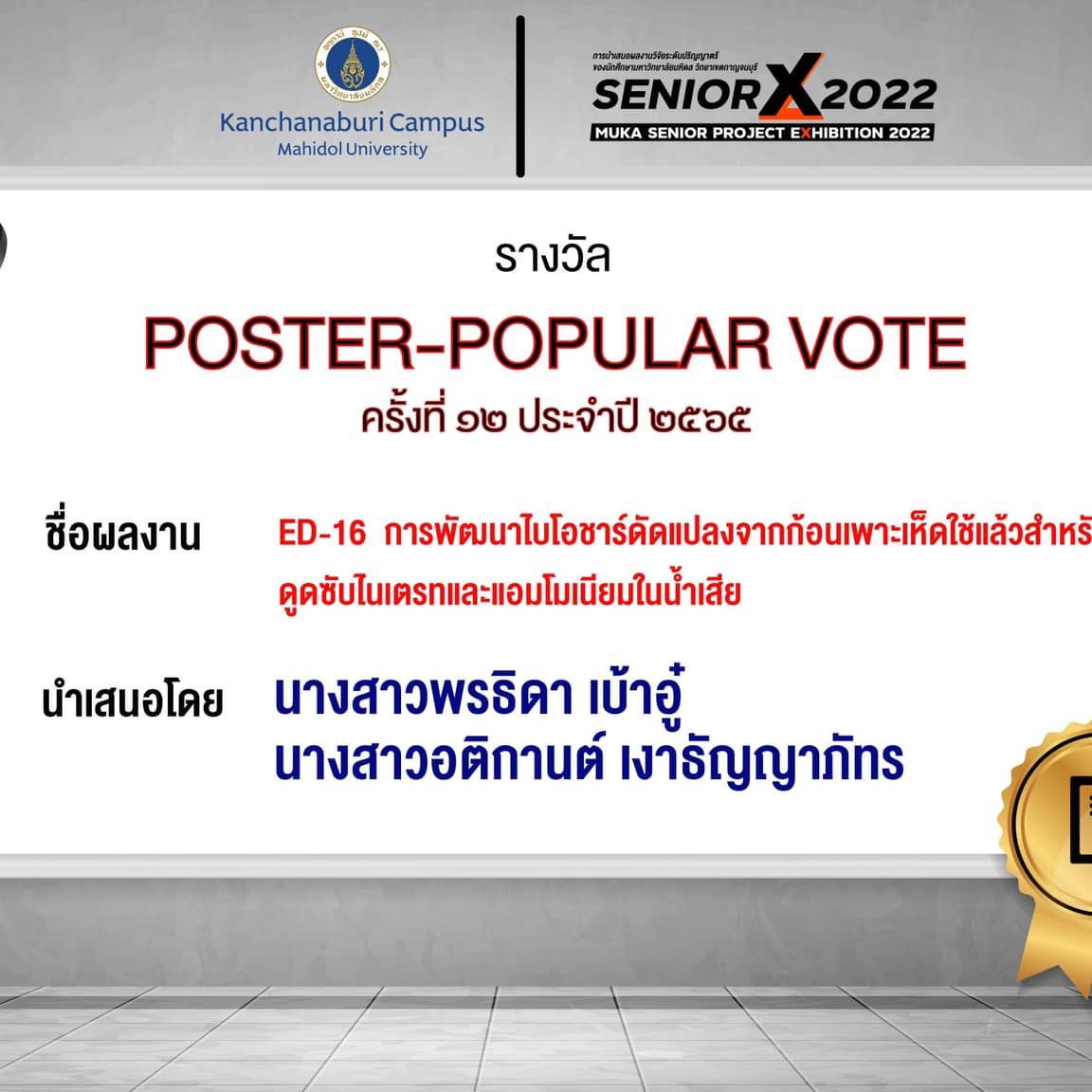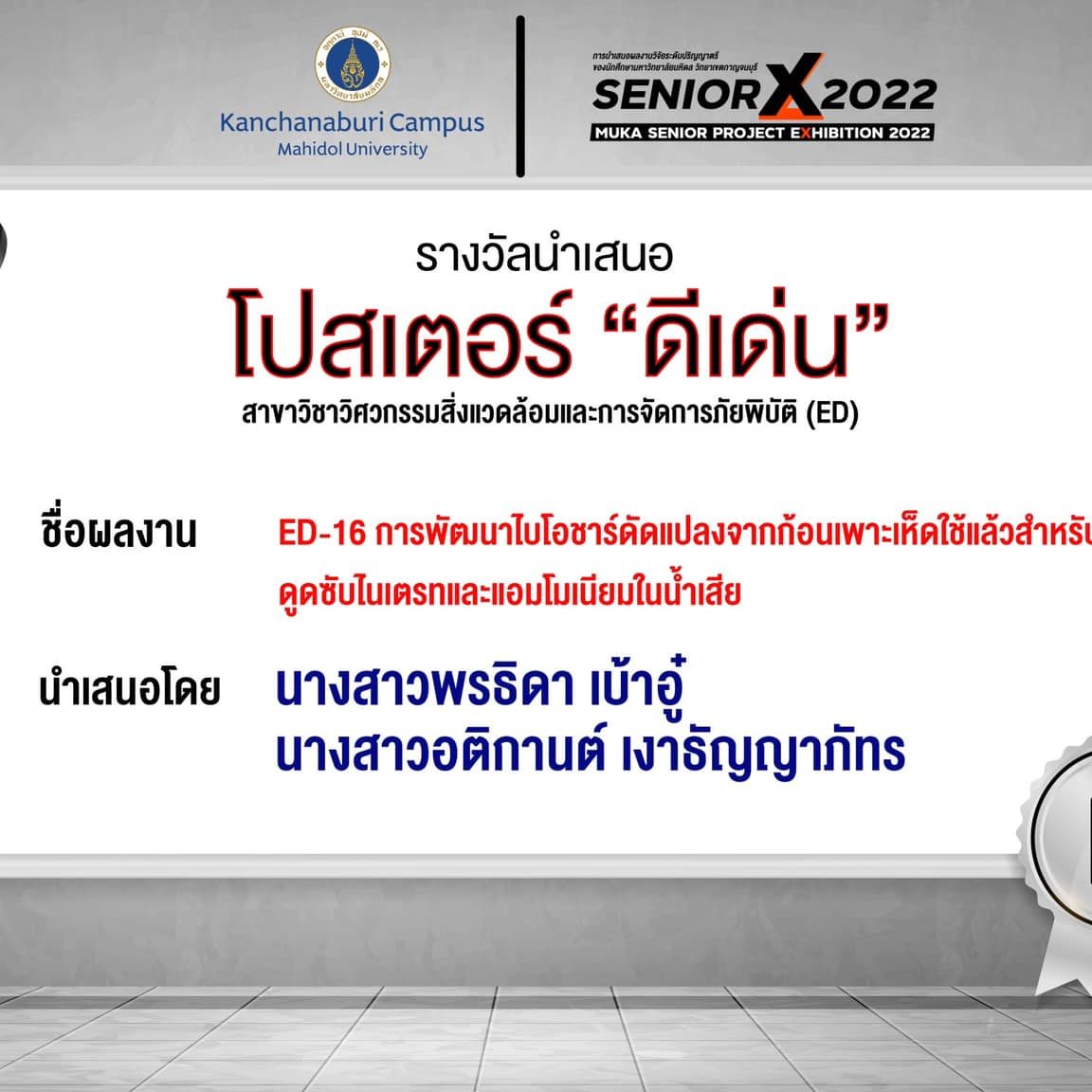 Poster-Popular vote: ED16 Development of modified biochar derived from spent mushroom substrate for adsorption of nitrate and ammonium in wastewater By Miss.Porntia BaoAu and Miss.Atikarn kgaothanyapat