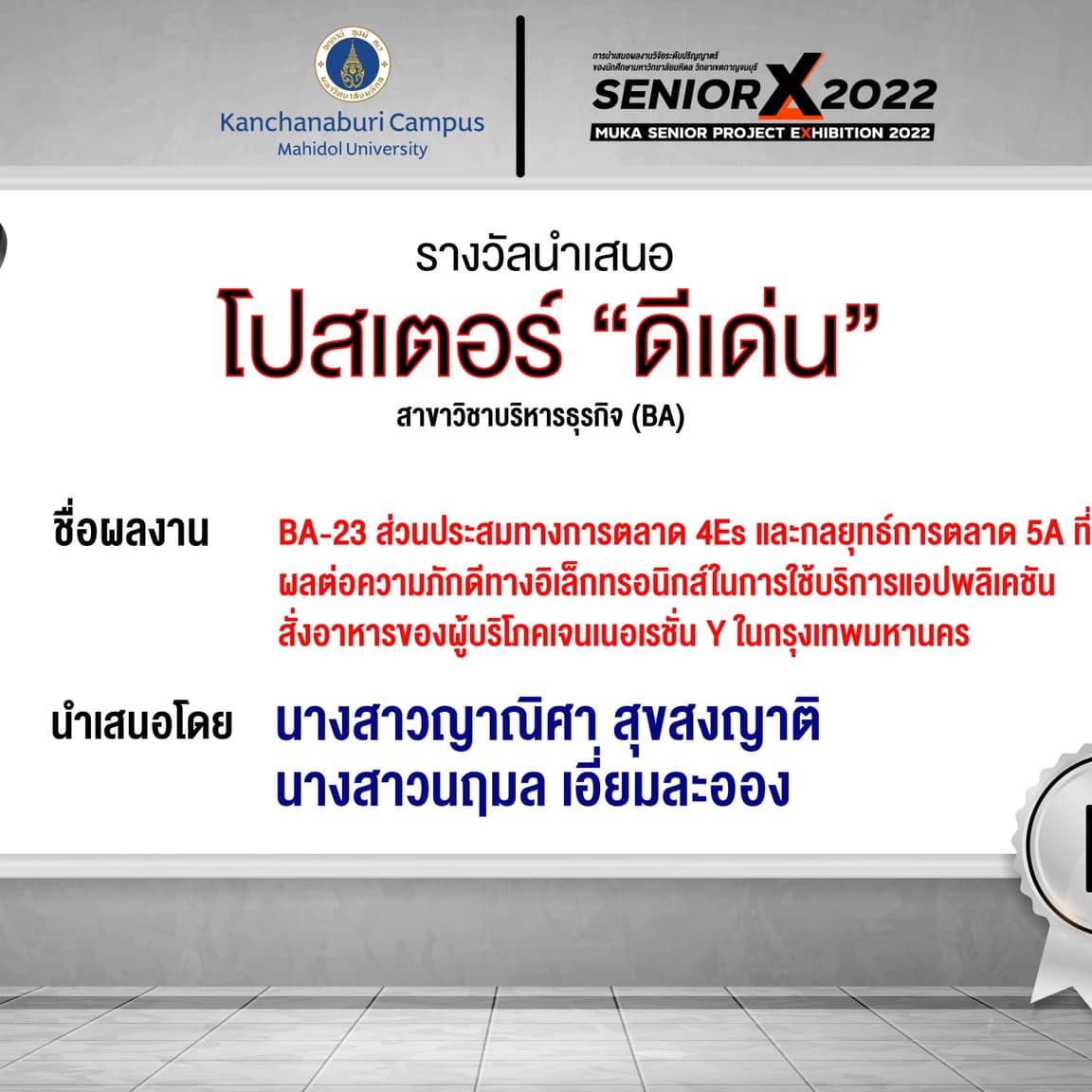 Congratulations to the winners of this year’s “MUKA Senior Project Exhibition” and best wishes to all our graduating seniors.