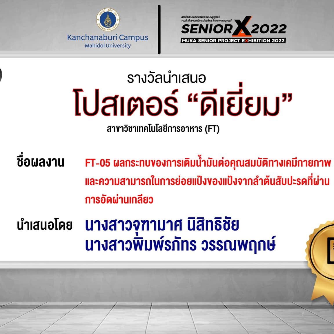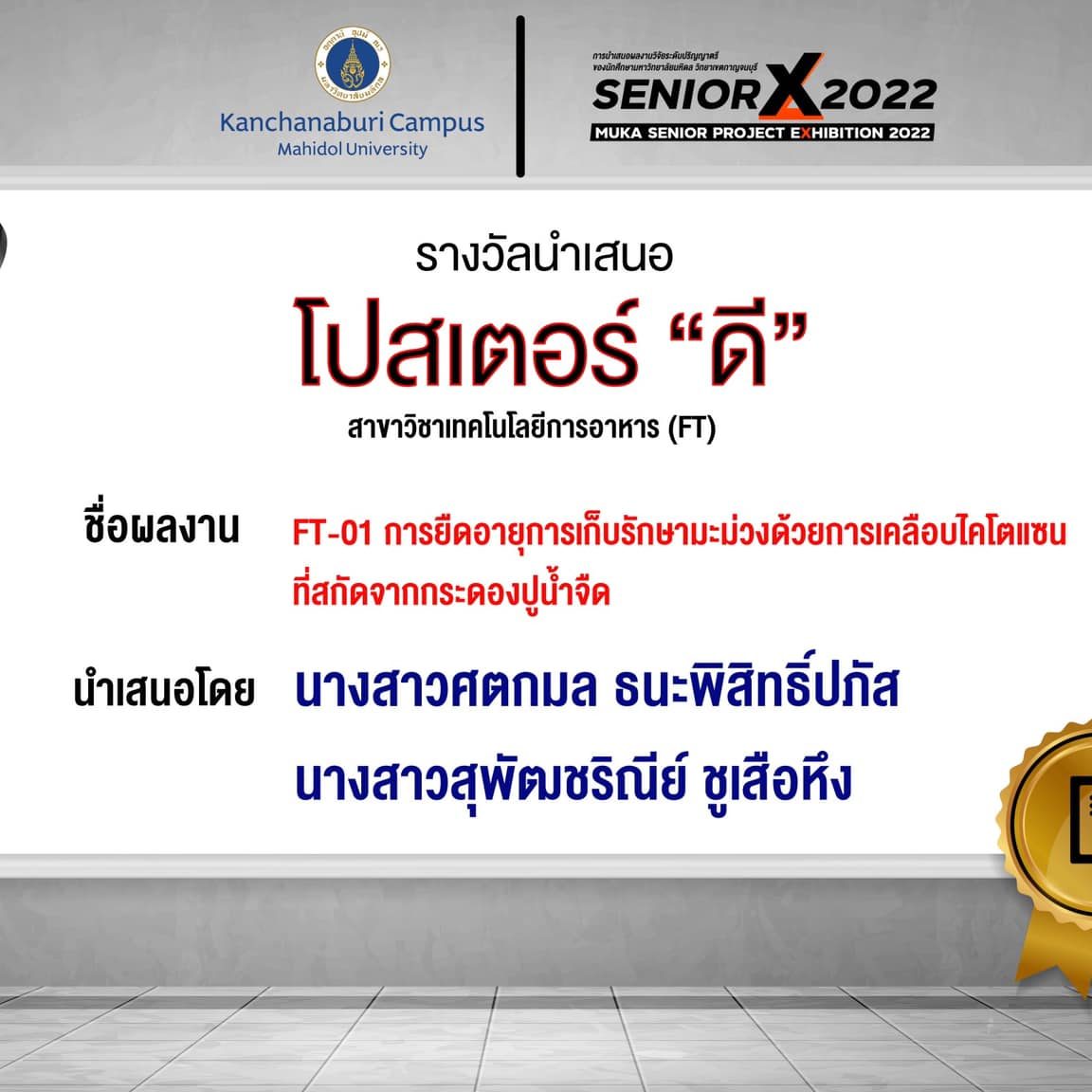 FT01 Extending the Shelf-Life of Mango Fruit with Chitosan Coating Extracted from Freshwater Crab Shell By Miss.Satakamol Thanapitpapas and Miss.Supatcharinee Chusurheng