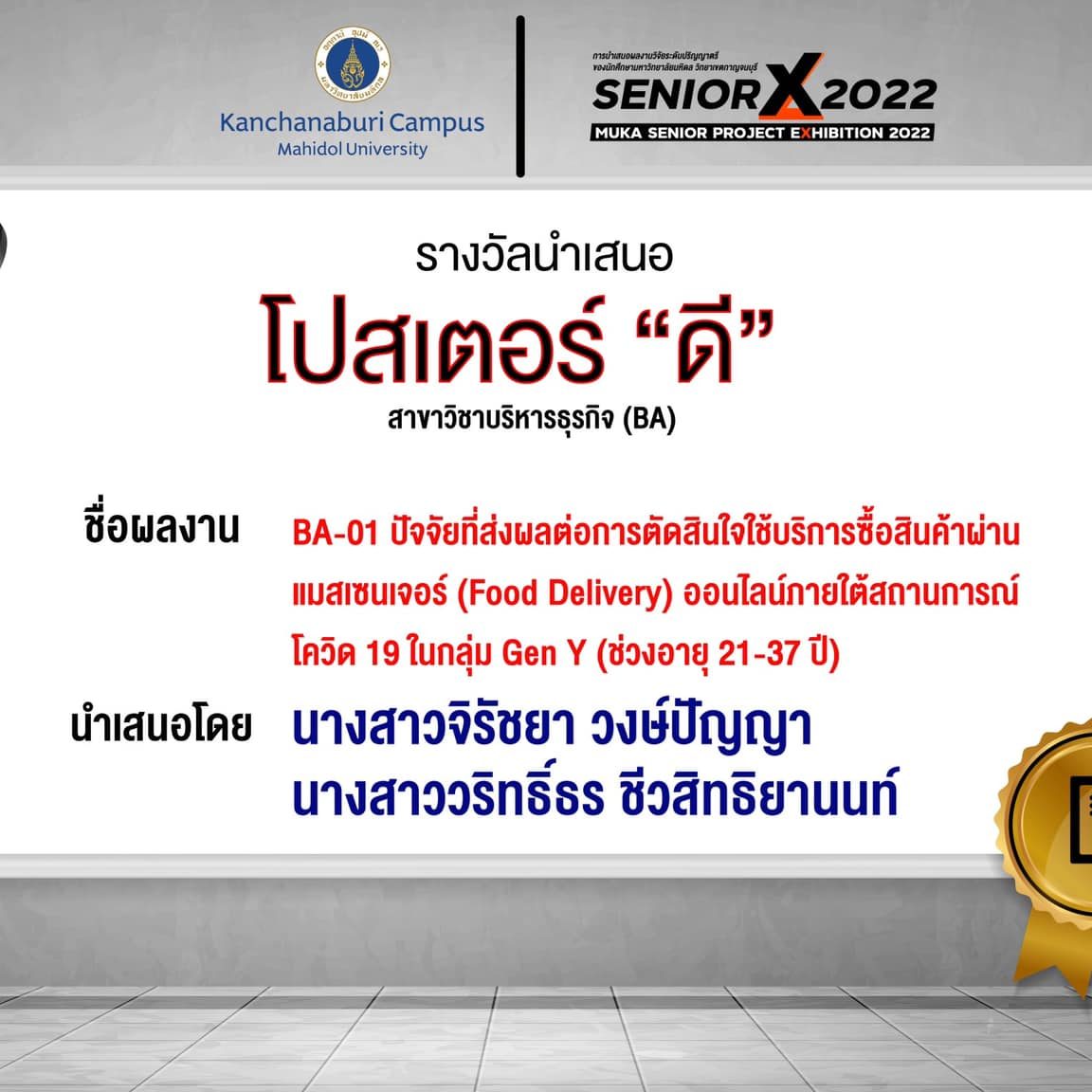 BA01 Factors affecting the decision to use the online shopping service via messenger (Food Delivery) under the situation of COVID-19 in the GEN Y group (Aged 21-37 years) BY Miss.Jirachaya Wongpanya and Miss.Warittorn Chewasittiyanon