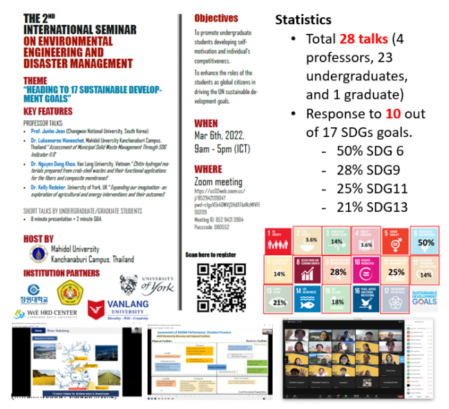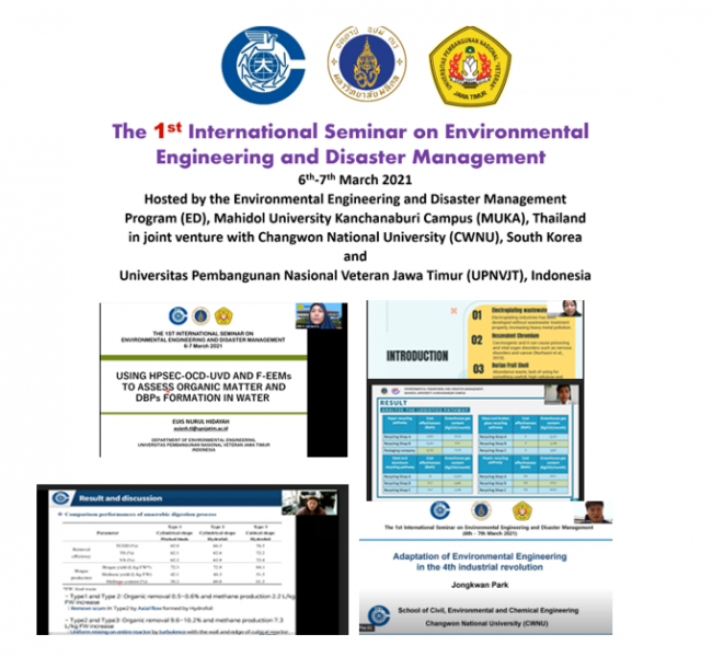 The International Seminar on Environmental Engineering and Disaster Management was launched in 2021. The seminar has been scheduled at the end of the second semester. It was hosted by the Environmental Engineering and Disaster Management Program, Mahidol University Kanchanaburi Campus. Professors and students from Changwon National University, South Korea, and Universitas Pembangunan Nasional Veteran Jawa Timur (UPNVJT), Indonesia, participated in this seminar.