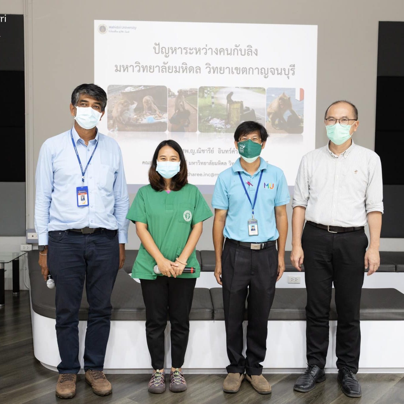 On August 3, 2022, Mr. Krid Khaobang, assistant to the Vice President for Kanchanaburi Campus in Operation and Environment, presided over the discussion on “Human-monkey conflict and good practice in solving problems” organized by the Mobile Health Unit, Faculty of Veterinary Medicine, Mahidol University. The event was honored by Dr. Nicharee Inkham, D.V.M., Faculty of Veterinary Medicine, Mahidol University and Asst. Prof. Dr. Pornchai Sanyathitiseree, Department of Large Animal and Wildlife Clinical Science, Faculty of Veterinary Medicine, Kasetsart University, as the honor guest speakers for this discussion.