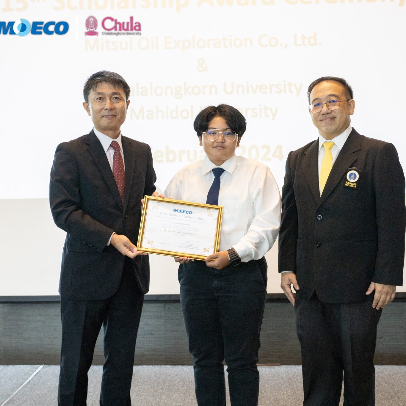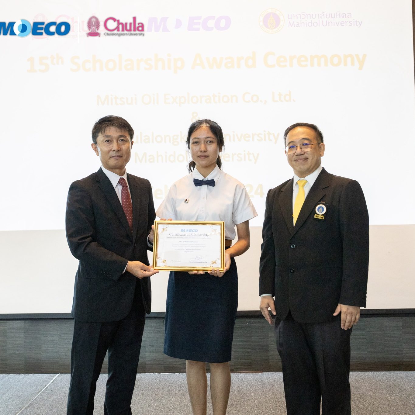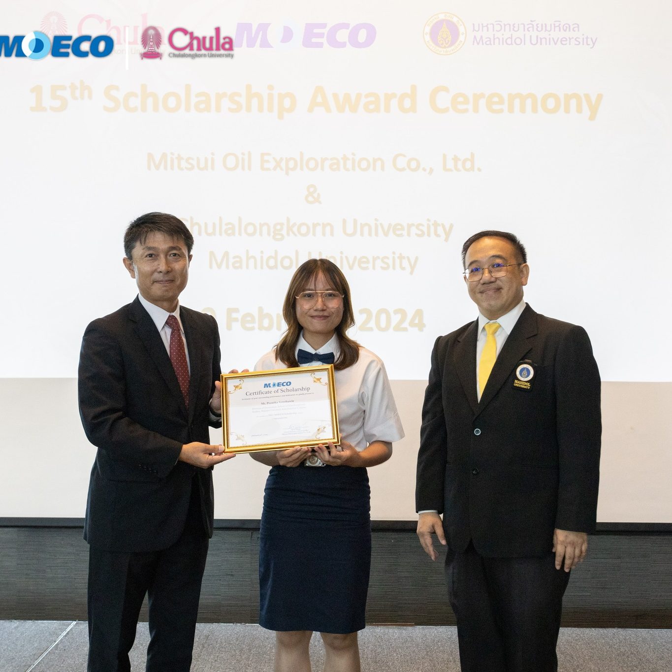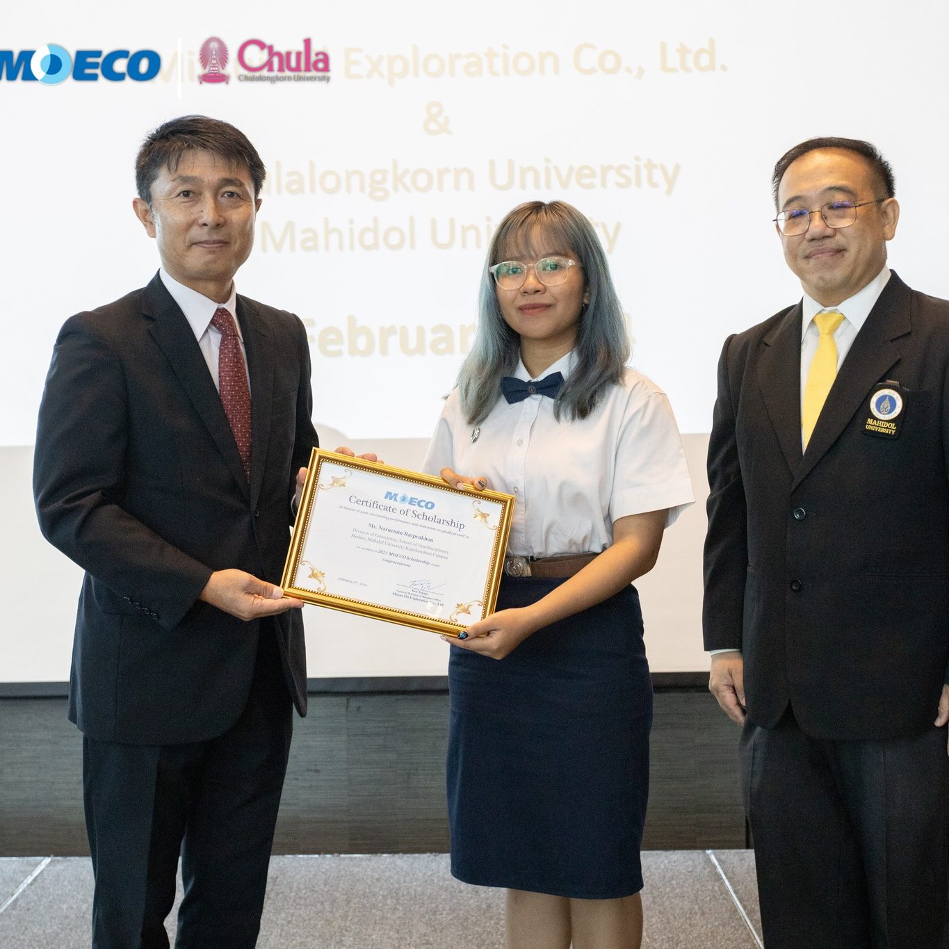 On February 9, 2024, Asst. Prof. Dr. Watcharra Chintakovid, Assistant to the Vice President for Kanchanaburi Campus in Education, along with faculty members from the Geoscience Division, participated in the scholarship award ceremony, conducted by executives and personnel from Mitsui Oil Exploration Co.,Ltd (MOECO) led by Mr. Ken Takagi, General Manager of Bangkok Office, Mr. Hiroki Yamanishi, Deputy General Manager, Mr. Kittiwat Thaweecharoen, Government & Public Affairs Manager, and Mr. Chaiyan Chaikiturajai Technical Manager. In this regard, four students of the Geoscience Division, Mahidol University Kanchanaburi Campus, received MOECO Scholarship 2024 as follows: