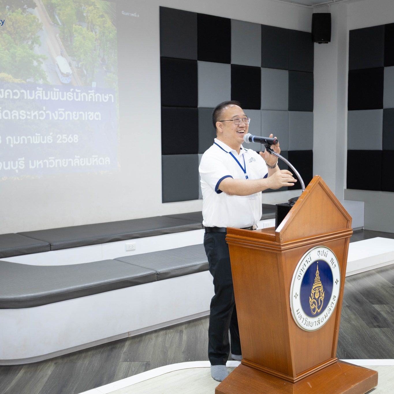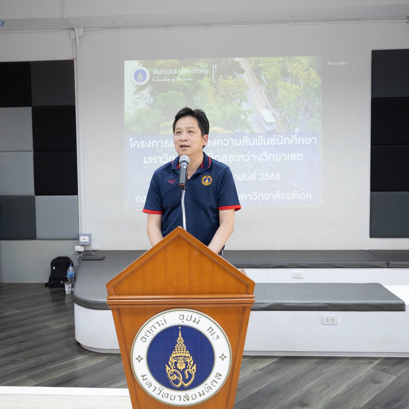 On February 22, 2025, Asst. Prof. Dr. Watcharra Chintakovid, Assistant to the Vice President for Kanchanaburi Campus in Education, delivered a welcome speech to Assoc. Prof. Chatchai Kunavisarut, Vice President for Student Affairs and Alumni of Mahidol University, who presided over the opening ceremony of the “Mahidol University Inter-campus Student Relationship Enhancement Project.” The event was attended by university executives and staff from the Student Development Division, Student Affairs Division, Mahidol University.