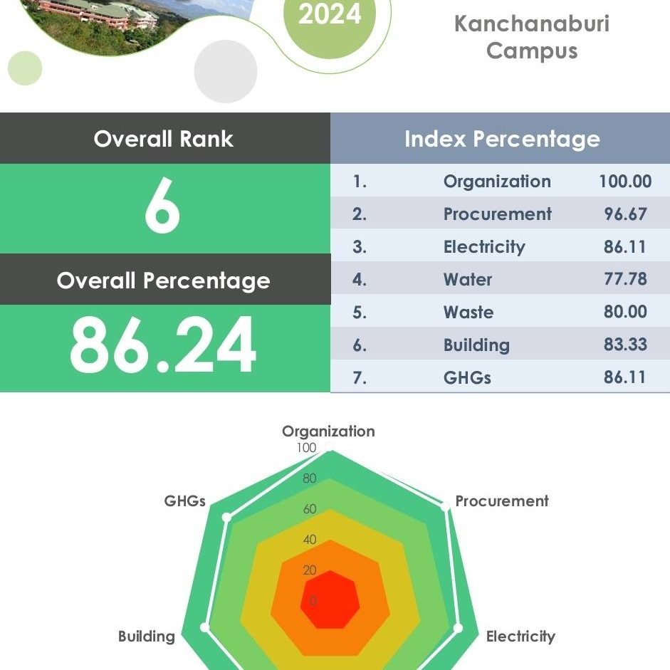 In the MU Green Ranking 2024, the Kanchanaburi Campus was ranked 6th, earning a total score of 86.24%, placing it in the “Very Good” level. This recognition reflects the campus’s commitment to environmental management across various dimensions, as well as its dedication to advancing environmentally friendly practices in alignment with Mahidol University’s policy toward creating a sustainable society and environment.