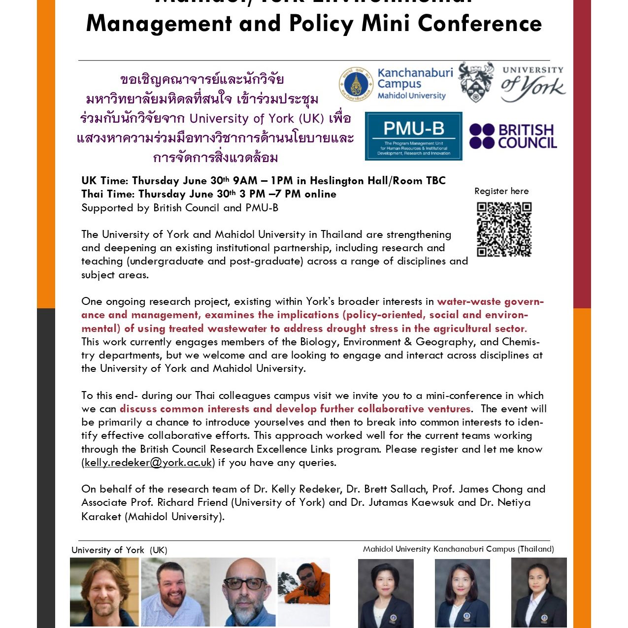 On June 30, 2022, researchers from Mahidol University Kanchanaburi Campus met with researchers from the University of York, UK to introduce themselves and their expertise, exchange interest in issues related to agriculture. water resource management and environmental management. At present, Mahidol University Kanchanaburi Campus and the University of York, UK have a joint research project on “Leveraging research into sustainable energy and agricultural practices in the face of changing climate,” supported by the British Council and The Program Management Unit for Human Resources and Institutional Development Research and Innovation, Thailand. The Mini-Conference activities will help drive the expansion of the network of cooperation between researchers from both institutions. Important research issues that have received interest include: