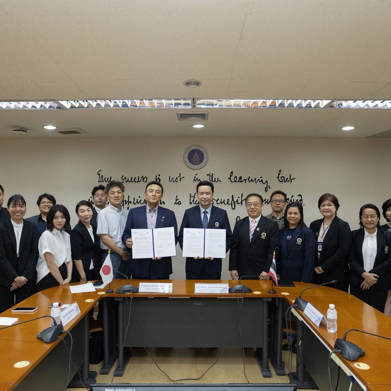On May 13, 2025, Asst. Prof. Dr. Thatchavee Leelawat, Vice President for Kanchanaburi Campus, signed a Memorandum of Understanding (MoU) with Mr. Akihiko Matsuoka, President of T-MEC Co., Ltd., Japan. The ceremony also featured Asst. Prof. Dr. Watcharra Chintakovid, Assistant to the Vice President for Education at Kanchanaburi Campus, who co-signed as a witness. The event was attended by executives and faculty members from Kanchanaburi Campus, Ehime University, and Iyo Bank.
