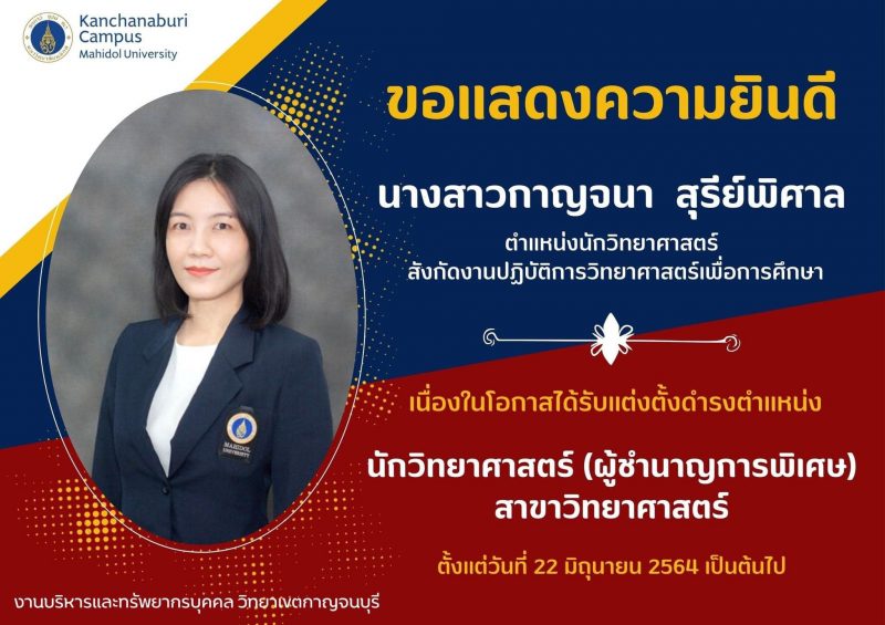 ขอแสดงความยินดีกับนางสาวกาญจนา สุรีย์พิศาล พนักงานมหาวิทยาลัย ตำแหน่ง นักวิทยาศาสตร์ สังกัดงานปฏิบัติการวิทยาศาสตร์เพื่อการศึกษา เนื่องในโอกาสได้รับแต่งตั้งให้ดำรงตำแหน่ง นักวิทยาศาสตร์ (ผู้ชำนาญการพิเศษ) สาขาวิทยาศาสตร์