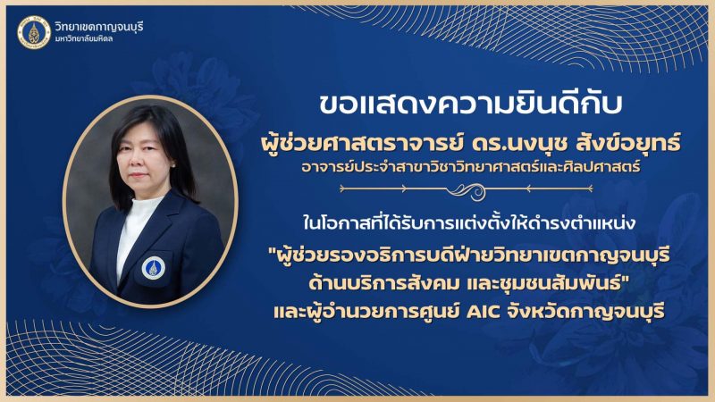 ขอแสดงความยินดีกับ ผู้ช่วยศาสตราจารย์ ดร.นงนุช สังข์อยุทธ์ อาจารย์ประจำสาขาวิชาวิทยาศาสตร์และศิลปศาสตร์ ในโอกาสได้รับการแต่งตั้งให้ดำรงตำแหน่ง “ผู้ช่วยรองอธิการบดีฝ่ายวิทยาเขตกาญจนบุรี ด้านบริการสังคมและชุมชนสัมพันธ์” และ “ผู้อำนวยการศูนย์ AIC จังหวัดกาญจนบุรี”