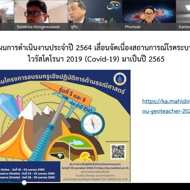 วันอังคารที่ 7 ธันวาคม 2564 อาจารย์ ดร.สุทัศชา หงษ์ศรีสวัสดิ์ อาจารย์ประจำสาขาวิชาธรณีศาสตร์ ผู้รับผิดชอบโครงการอบรมครูเชิงปฏิบัติการด้านธรณีศาสตร์ ภายใต้บันทึกข้อตกลงความร่วมมือกับสถาบันส่งเสริมการสอนวิทยาศาสตร์และเทคโนโลยี (สสวท.) ในการพัฒนาศักยภาพของครูผู้สอนวิทยาศาสตร์และเทคโนโลยี ได้ประชุมกับผู้บริหาร สสวท. ผ่านระบบออนไลน์ (WebeX Meeting) เพื่อรายงานผลการดำเนินงานโครงการอบรมครูเชิงปฏิบัติการด้านธรณีศาสตร์ ประจำปี 2563 และวางแผนการดำเนินงานโครงการฯ ประจำปี 2564 โดยมี ศาสตราจารย์ ดร.ชูกิจ ลิมป์จำนงค์ ผู้อำนวยการ สสวท. ดร.พรชัย อินทร์ฉาย รองผู้อำนวยการ สสวท. และคุณฤทัย เพลงวัฒนา ผู้อำนวยการสาขาฟิสิกส์และวิทยาศาสตร์โลก สสวท. เข้าร่วมประชุม