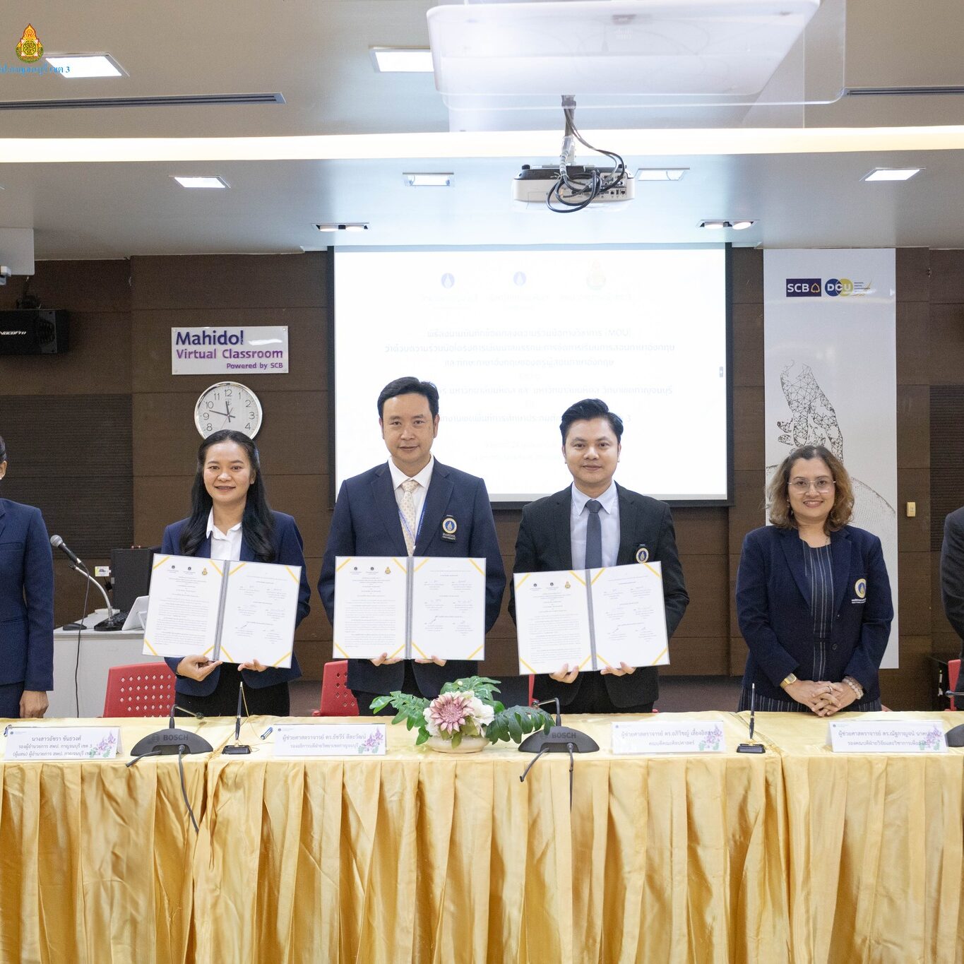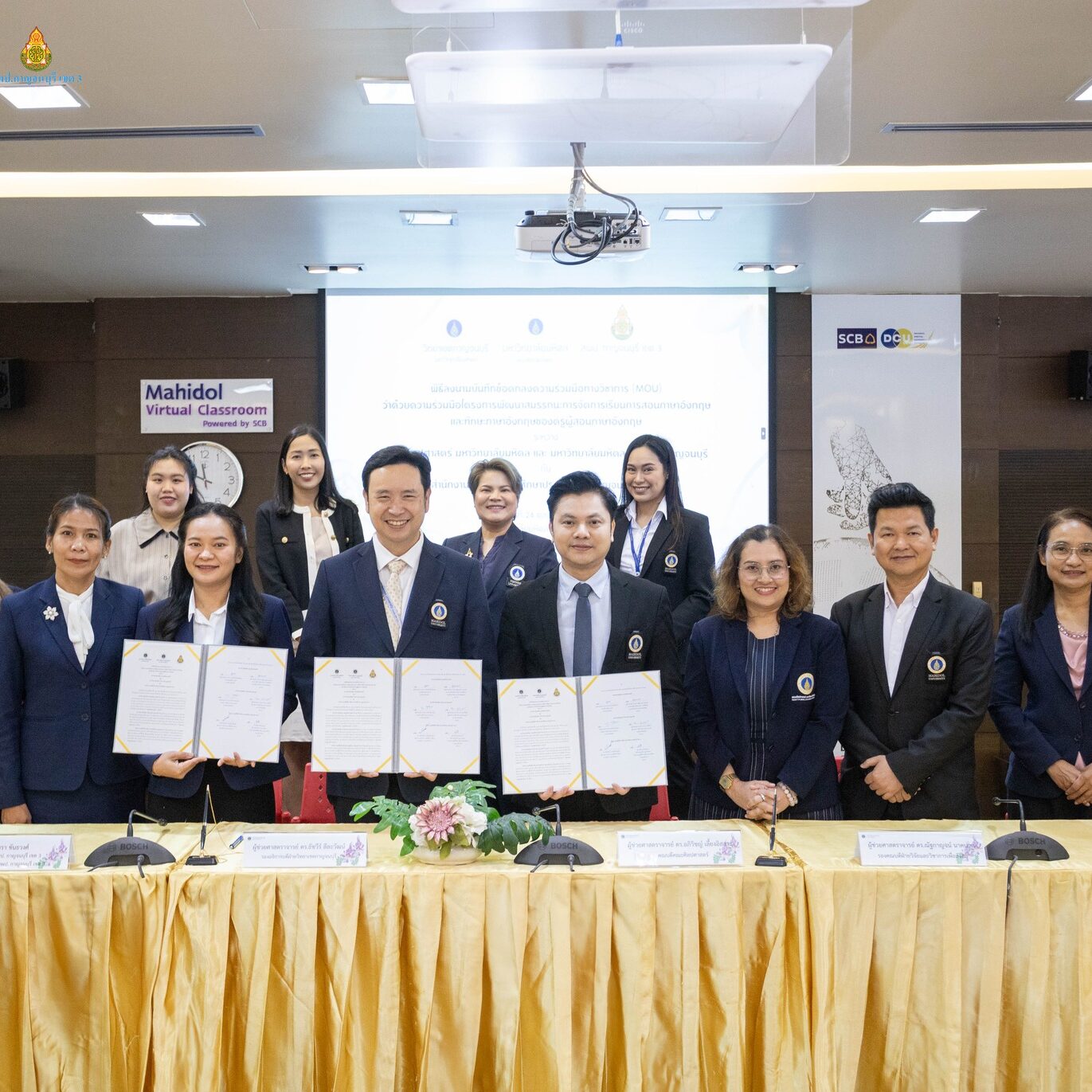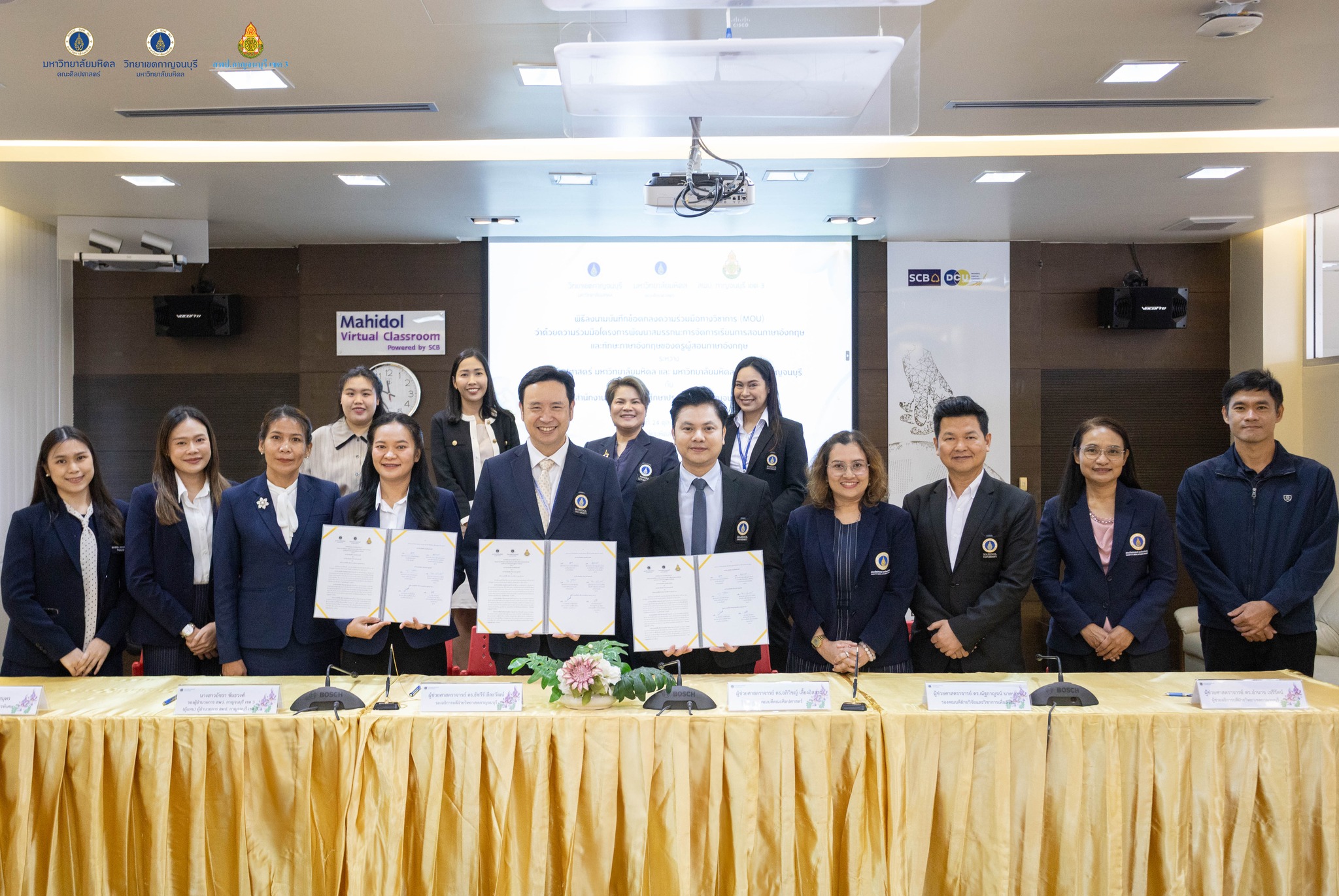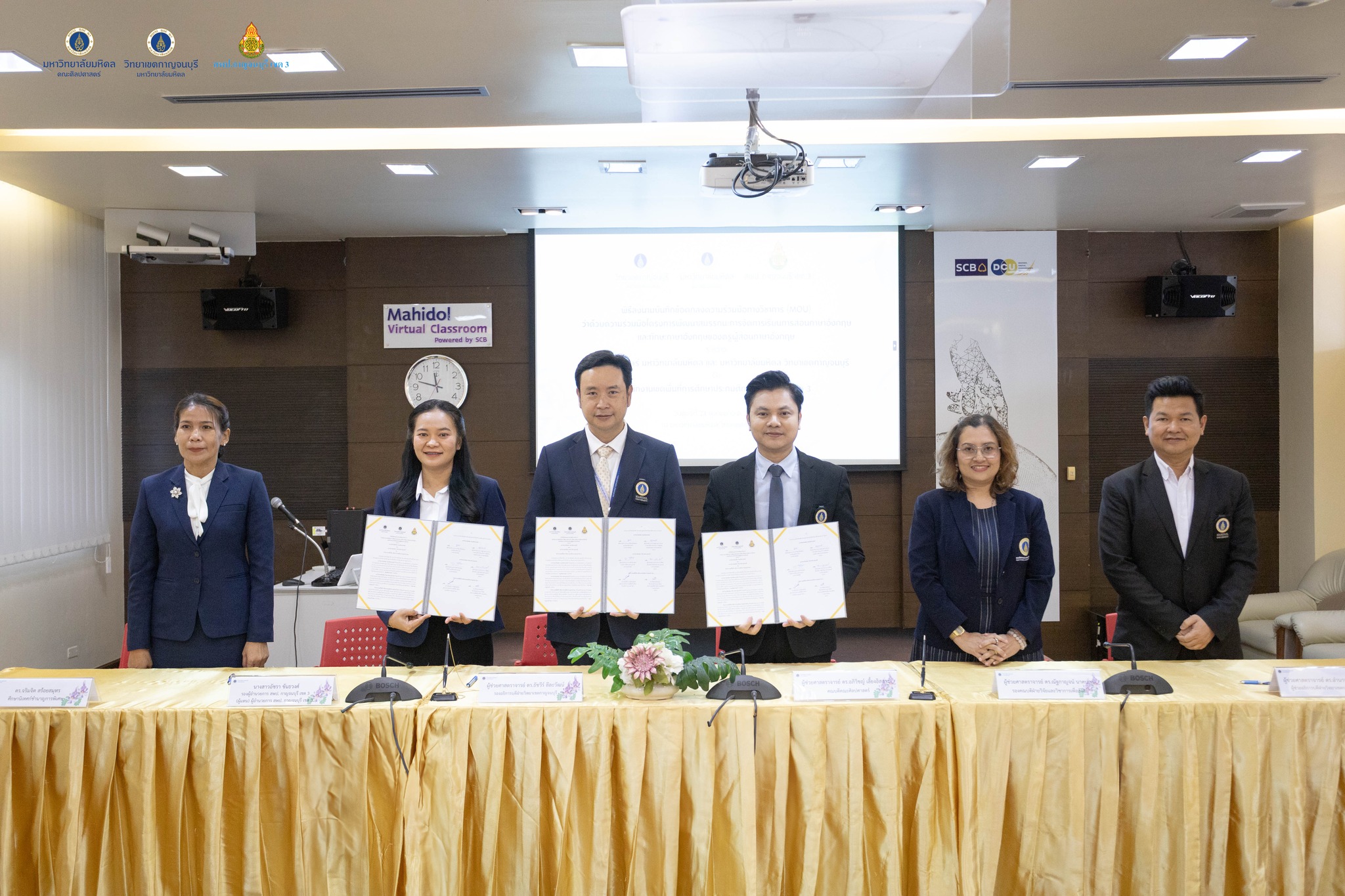 พิธีการลงนามบันทึกข้อตกลงความร่วมมือทางวิชาการ เพื่อยกระดับการจัดการเรียนการสอนภาษาอังกฤษในพื้นที่ ระหว่างคณะศิลปศาสตร์ มหาวิทยาลัยมหิดล และวิทยาเขตกาญจนบุรี มหาวิทยาลัยมหิดล ร่วมกับสำนักงานเขตพื้นที่การศึกษาประถมศึกษากาญจนบุรี เขต 3