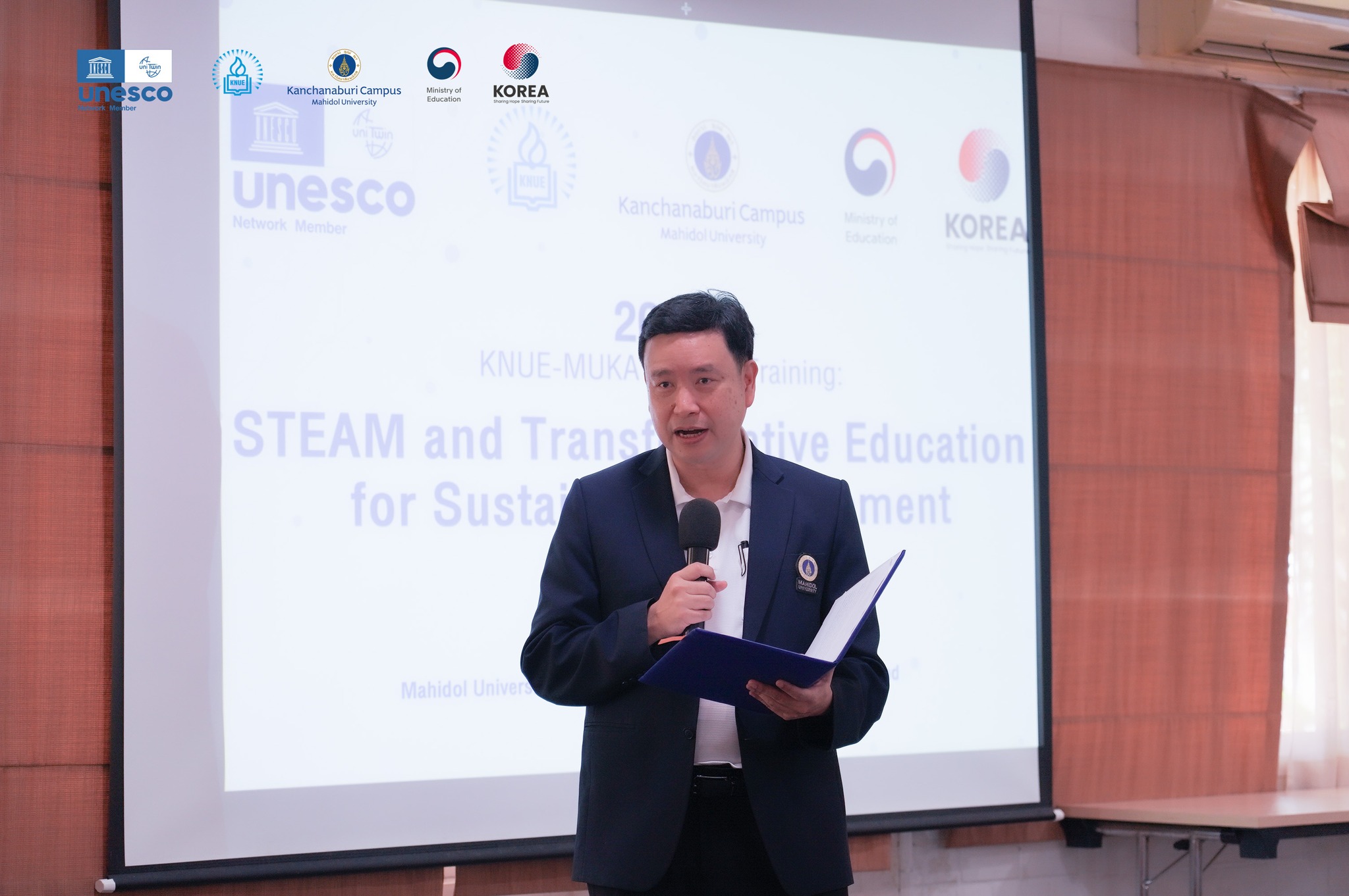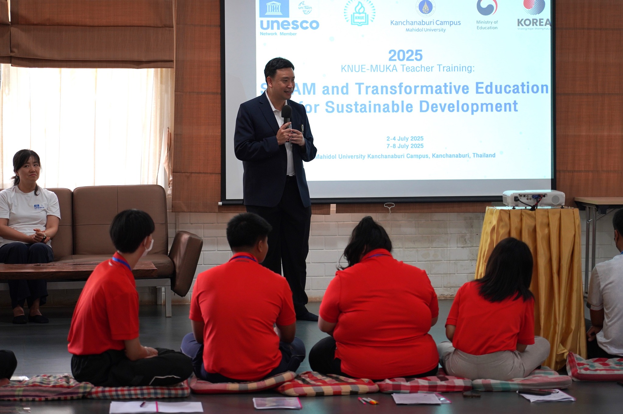 วันที่ 2 กรกฎาคม 2568 ผู้ช่วยศาสตราจารย์ ดร.ธัชวีร์ ลีละวัฒน์ รองอธิการบดีฝ่ายวิทยาเขตกาญจนบุรี พร้อมด้วย Prof. Dr. Young-Hoon Kim, Project Director of UNESSCO UNITWIN Program ร่วมเป็นประธานกล่าวเปิดโครงการอบรมเชิงปฏิบัติการระดับนานาชาติ 2025 KNUE-MUKA UNITWIN Teacher Training Program for Quality Teacher Education ในหัวข้อ “STEAM and Transformative Education for Sustainable Development” และโครงการพัฒนาศักยภาพครูในเครือข่าย KNUE-MUKA UNESCO-UNITWIN ประจำปี 2568 โดยมหาวิทยาลัยมหิดล วิทยาเขตกาญจนบุรี นำโดยอาจารย์ ดร.นิธิมา สุทะพินธ์ และอาจารย์ ดร.จุฑามาศ สุคนธปฏิภาค พร้อมคณาจารย์วิทยาเขตกาญจนบุรี ร่วมดำเนินงานร่วมกับ Korea National University of Education (KNUE) สาธารณรัฐเกาหลี นำโดย Prof. Jungjoo Sohn และ Prof. Taejin Choi เพื่อร่วมพัฒนาศักยภาพครูของโรงเรียนในจังหวัดกาญจนบุรีที่ร่วมเป็นเครือข่ายกับวิทยาเขตกาญจนบุรี โดยจัดขึ้นสำหรับครูสังกัดสำนักงานเขตพื้นที่การศึกษาประถมศึกษากาญจนบุรี ครูสังกัดสำนักงานเขตพื้นที่การศึกษามัธยมศึกษากาญจนบุรี ครูสังกัดการศึกษาเอกชนจังหวัดกาญจนบุรี และครูสังกัดสำนักงานส่งเสริมการปกครองท้องถิ่นจังหวัดกาญจนบุรี ในระหว่างวันที่ 2 – 4 กรกฎาคม 2568 ณ ศูนย์พัฒนาและฝึกอบรมวิมานดิน วิทยาเขตกาญจนบุรี