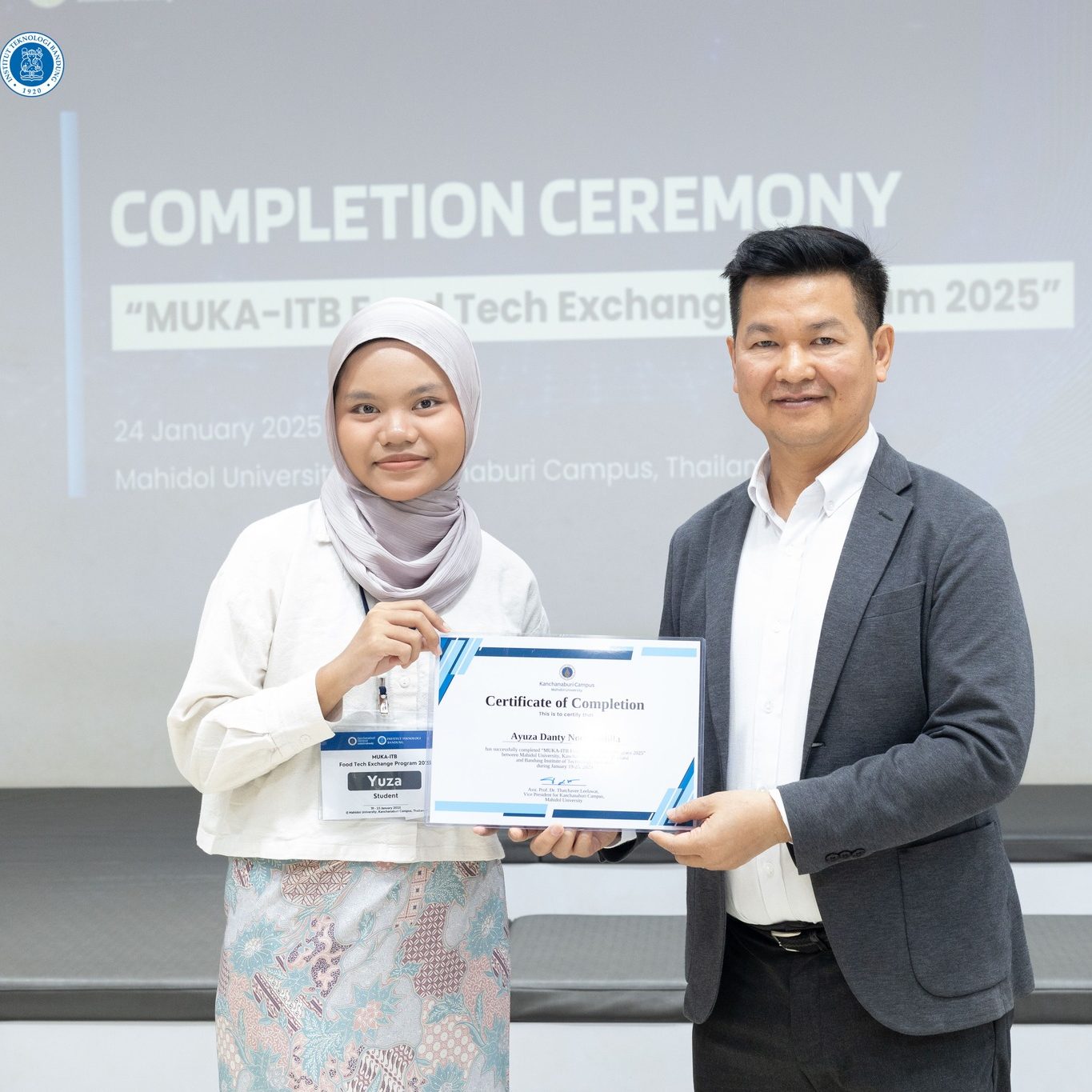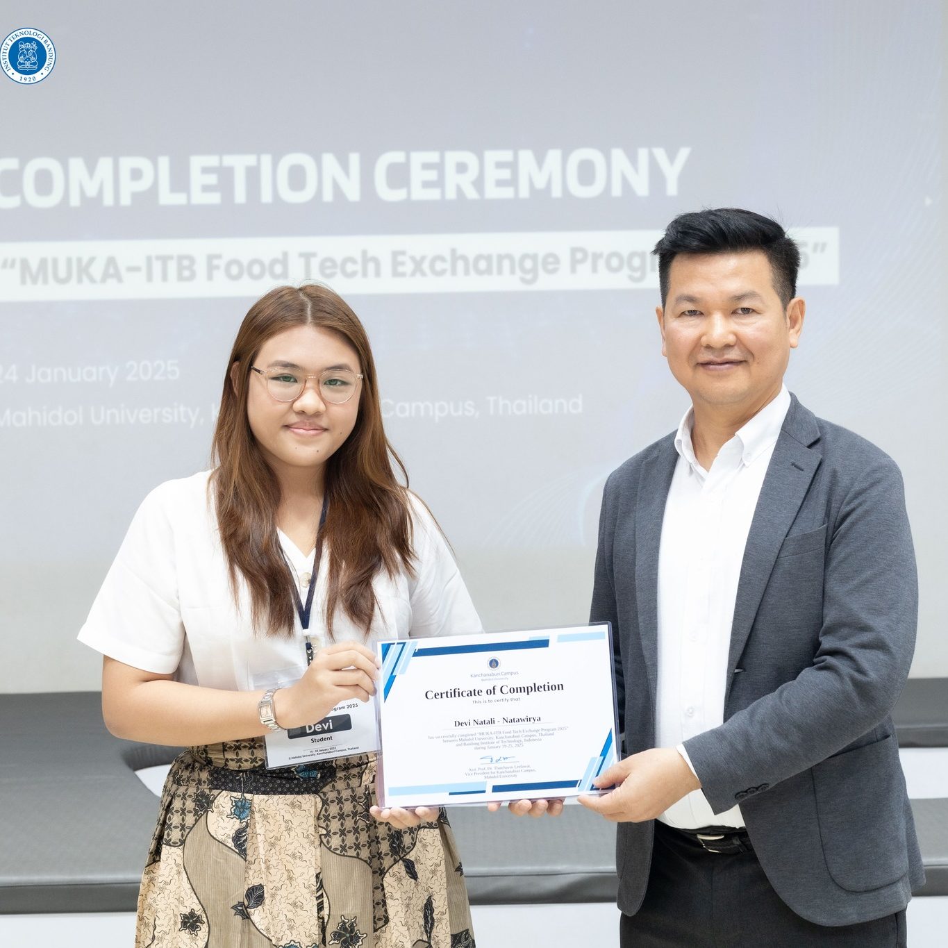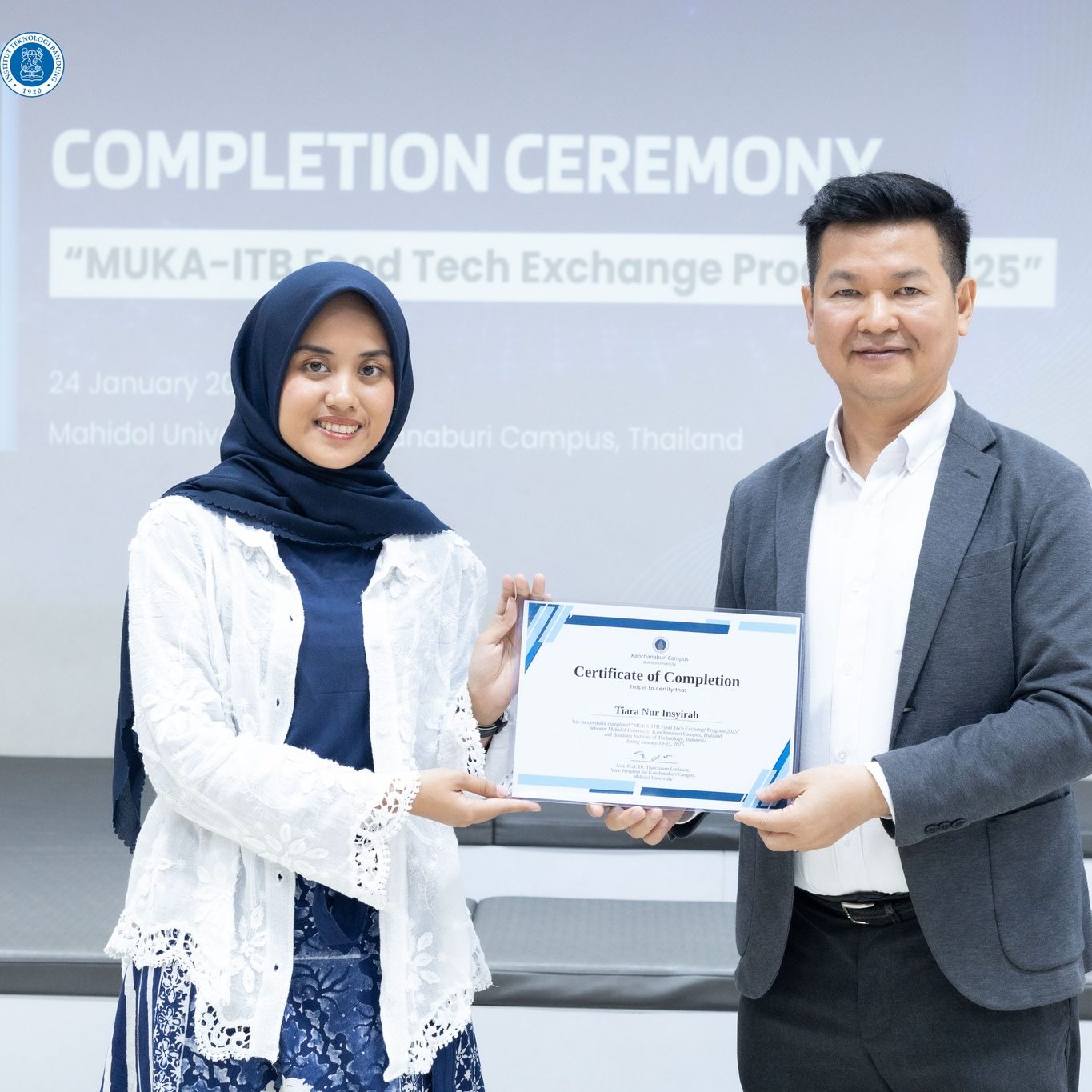วันที่ 24 มกราคม 2568 ผู้ช่วยศาสตราจารย์ ดร.อำนาจ เจรีรัตน์ ผู้ช่วยอธิการบดีฝ่ายวิทยาเขตกาญจนบุรี ให้เกียรติเป็นประธานมอบประกาศนียบัตรให้กับนักศึกษาแลกเปลี่ยนที่เข้าร่วมกิจกรรม “MUKA-Institute Teknologi Bandung Exchange Program 2025” พร้อมทั้งกล่าวปิดกิจกรรมและแสดงความชื่นชมนักศึกษาแลกเปลี่ยนจาก Bandung Institute of Technology สาธารณรัฐอินโดนีเซีย และนักศึกษาสาขาวิชาเทคโนโลยีการอาหารที่เข้าร่วมกิจกรรม ณ ห้อง Co-Working Space อาคารเรียนรวม วิทยาเขตกาญจนบุรี โดยกิจกรรมแลกเปลี่ยนดังกล่าวจัดขึ้นในระหว่างวันที่ 19-25 มกราคม 2568