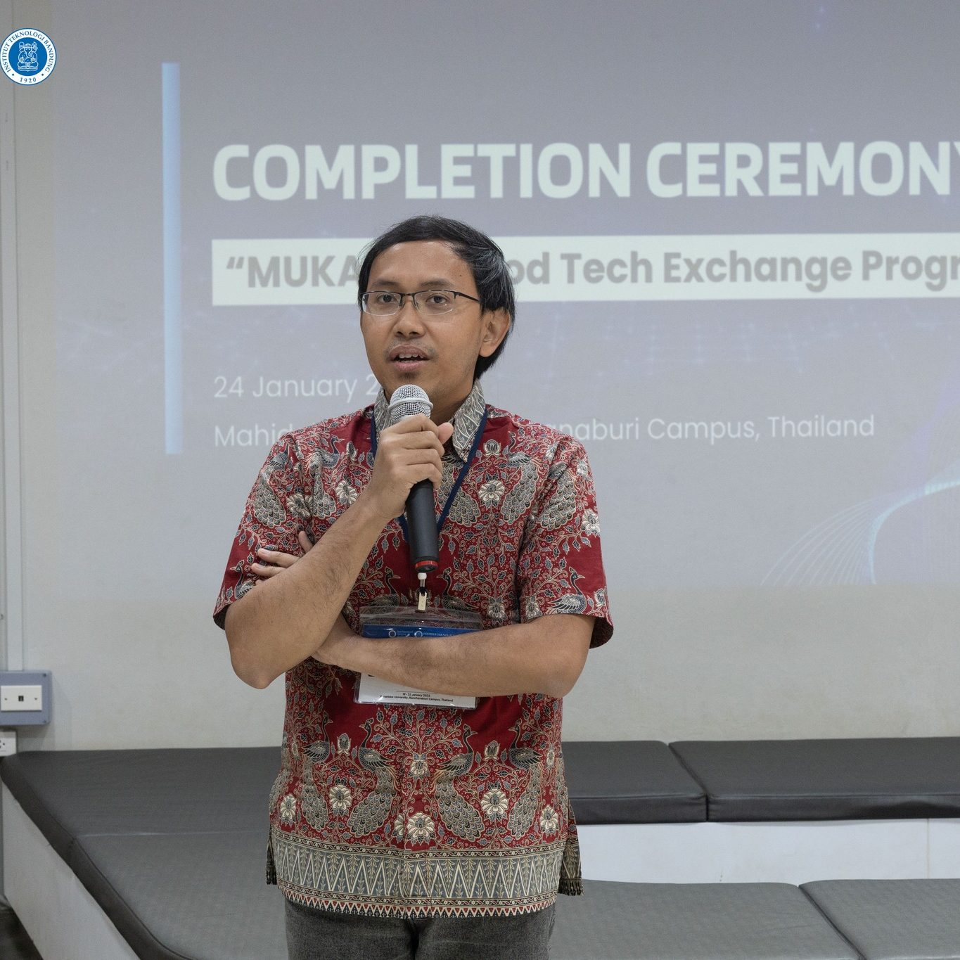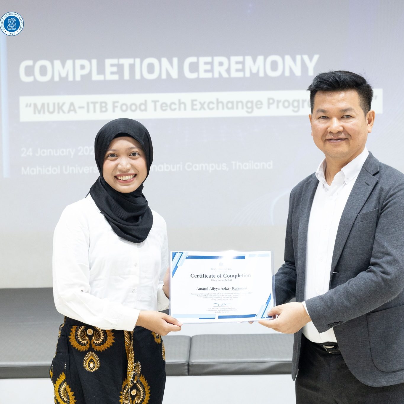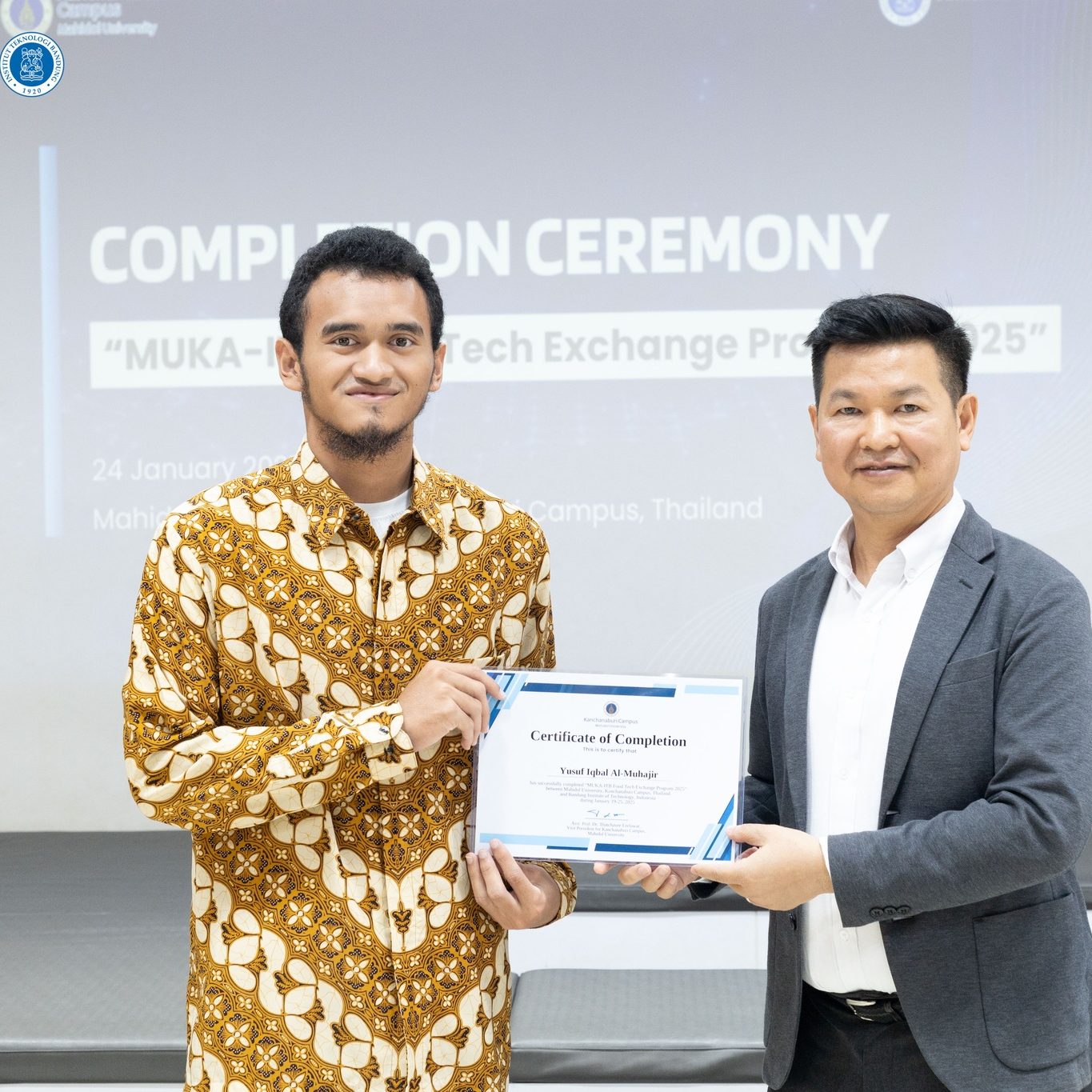 วันที่ 24 มกราคม 2568 ผู้ช่วยศาสตราจารย์ ดร.อำนาจ เจรีรัตน์ ผู้ช่วยอธิการบดีฝ่ายวิทยาเขตกาญจนบุรี ให้เกียรติเป็นประธานมอบประกาศนียบัตรให้กับนักศึกษาแลกเปลี่ยนที่เข้าร่วมกิจกรรม “MUKA-Institute Teknologi Bandung Exchange Program 2025” พร้อมทั้งกล่าวปิดกิจกรรมและแสดงความชื่นชมนักศึกษาแลกเปลี่ยนจาก Bandung Institute of Technology สาธารณรัฐอินโดนีเซีย และนักศึกษาสาขาวิชาเทคโนโลยีการอาหารที่เข้าร่วมกิจกรรม ณ ห้อง Co-Working Space อาคารเรียนรวม วิทยาเขตกาญจนบุรี โดยกิจกรรมแลกเปลี่ยนดังกล่าวจัดขึ้นในระหว่างวันที่ 19-25 มกราคม 2568