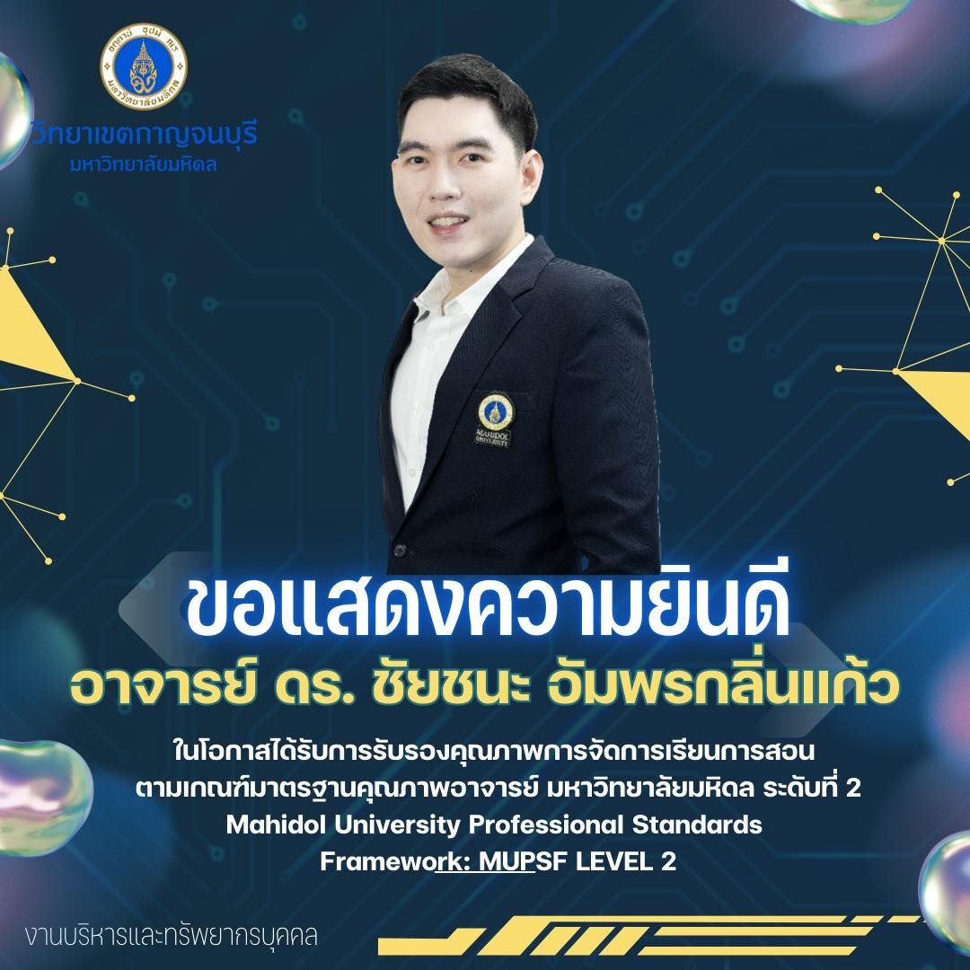 ขอแสดงความยินดีกับ อาจารย์ ดร.ชัยชนะ อัมพรกลิ่นแก้ว เนื่องในโอกาสได้รับการรับรองคุณภาพการจัดการเรียนการสอน ตามเกณฑ์มาตรฐานคุณภาพอาจารย์ มหาวิทยาลัยมหิดล ระดับที่ 2 (MUPSF LEVEL2)