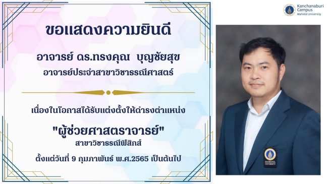 ขอแสดงความยินดีกับอาจารย์ ดร.ทรงคุณ บุญชัยสุข อาจารย์ประจำสาขาวิชาธรณีศาสตร์ เนื่องในโอกาสได้รับแต่งตั้งให้ดำรงตำแหน่ง “ผู้ช่วยศาสตราจารย์” สาขาวิชาธรณีฟิสิกส์