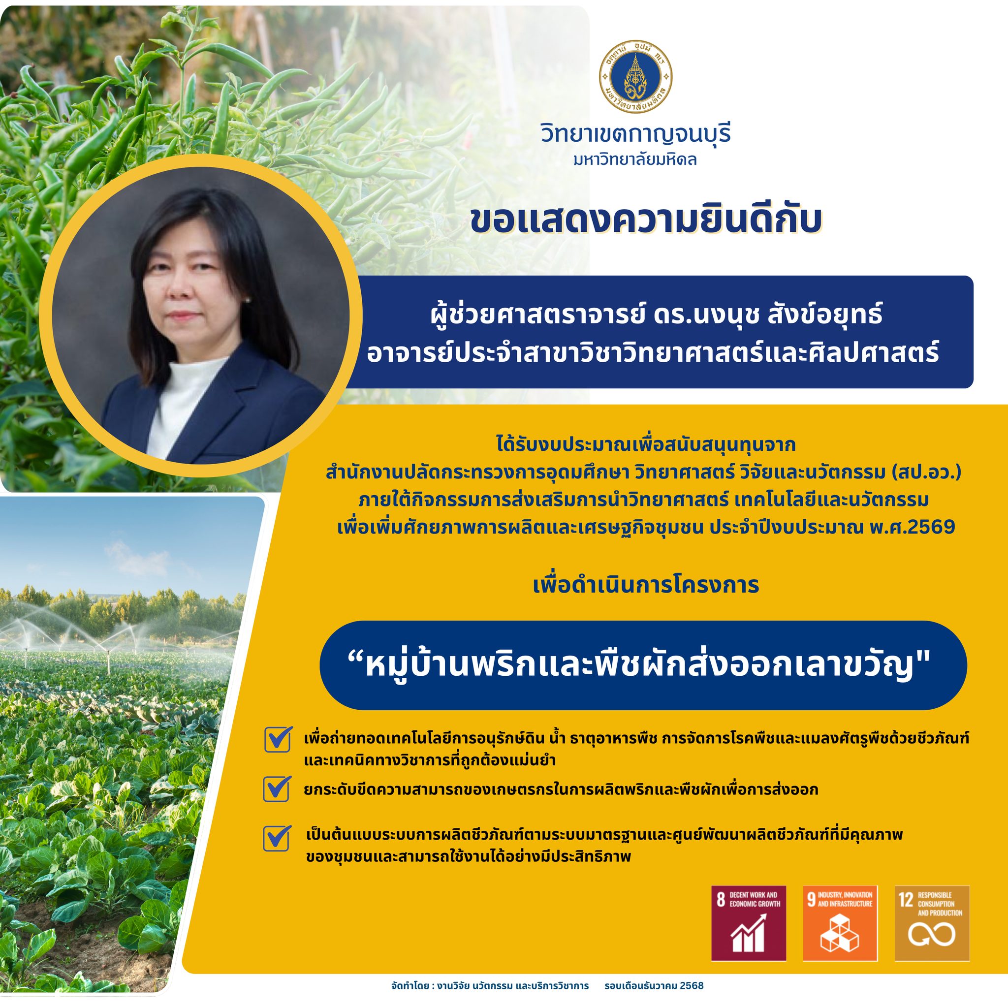1. ผู้ช่วยศาสตราจารย์ ดร.นงนุช สังข์อยุทธ์ ผู้ช่วยรองอธิการบดีฝ่ายวิทยาเขตกาญจนบุรี ด้านบริการสังคมและชุมชนสัมพันธ์ และอาจารย์ประจำสาขาวิชาวิทยาศาสตร์และศิลปศาสตร์ เนื่องในโอกาสได้รับงบประมาณเพื่อสนับสนุนการดำเนินการโครงการเพื่อเพิ่มศักยภาพการผลิตและเศรษฐกิจชุมชน (คลินิกเทคโนโลยี) จำนวน 1 โครงการ