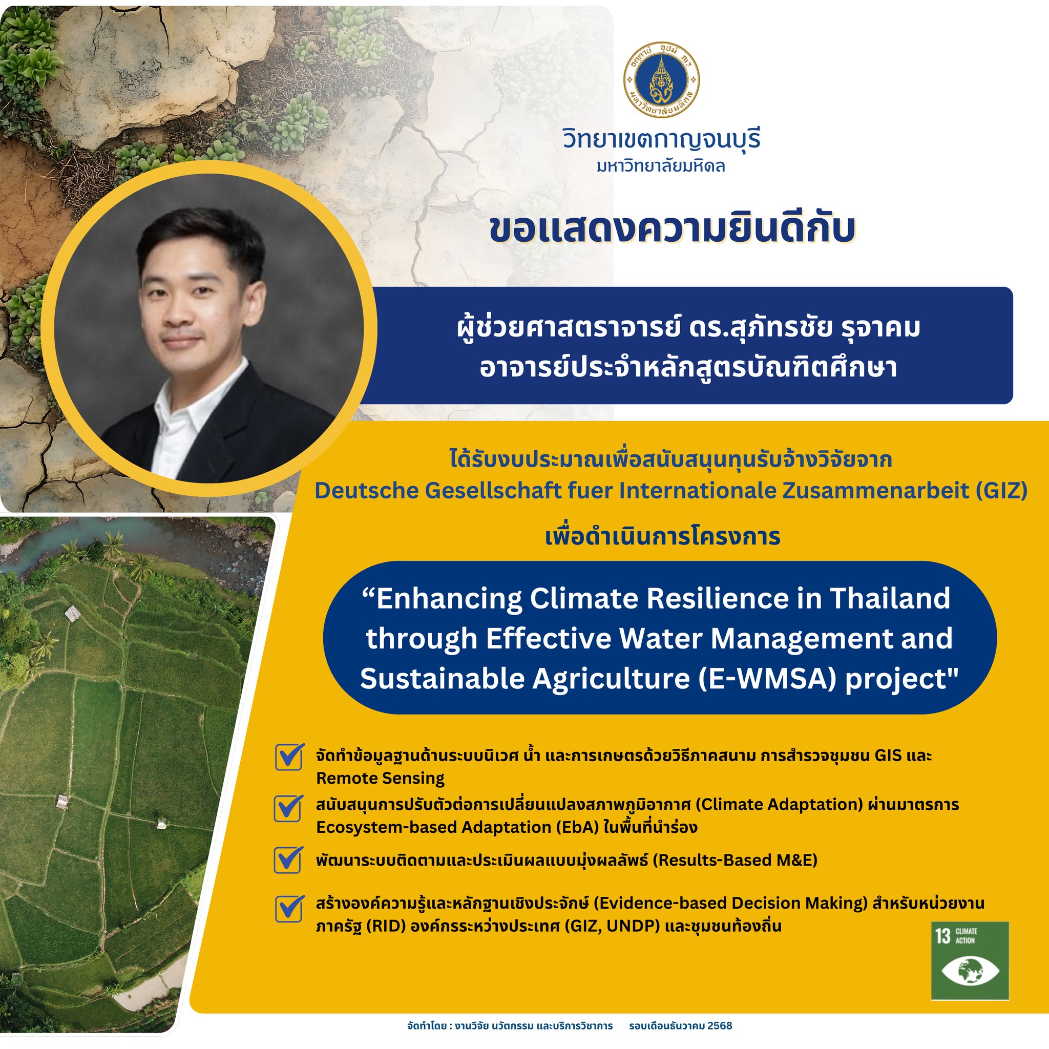 2. ผู้ช่วยศาสตราจารย์ ดร.สุภัทรชัย รุจาคม อาจารย์ประจำหลักสูตรบัณฑิตศึกษา เนื่องในโอกาสได้รับงบประมาณเพื่อสนับสนุนทุนรับจ้างวิจัย จำนวน 1 โครงการ