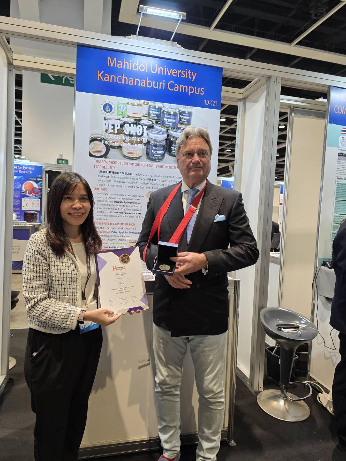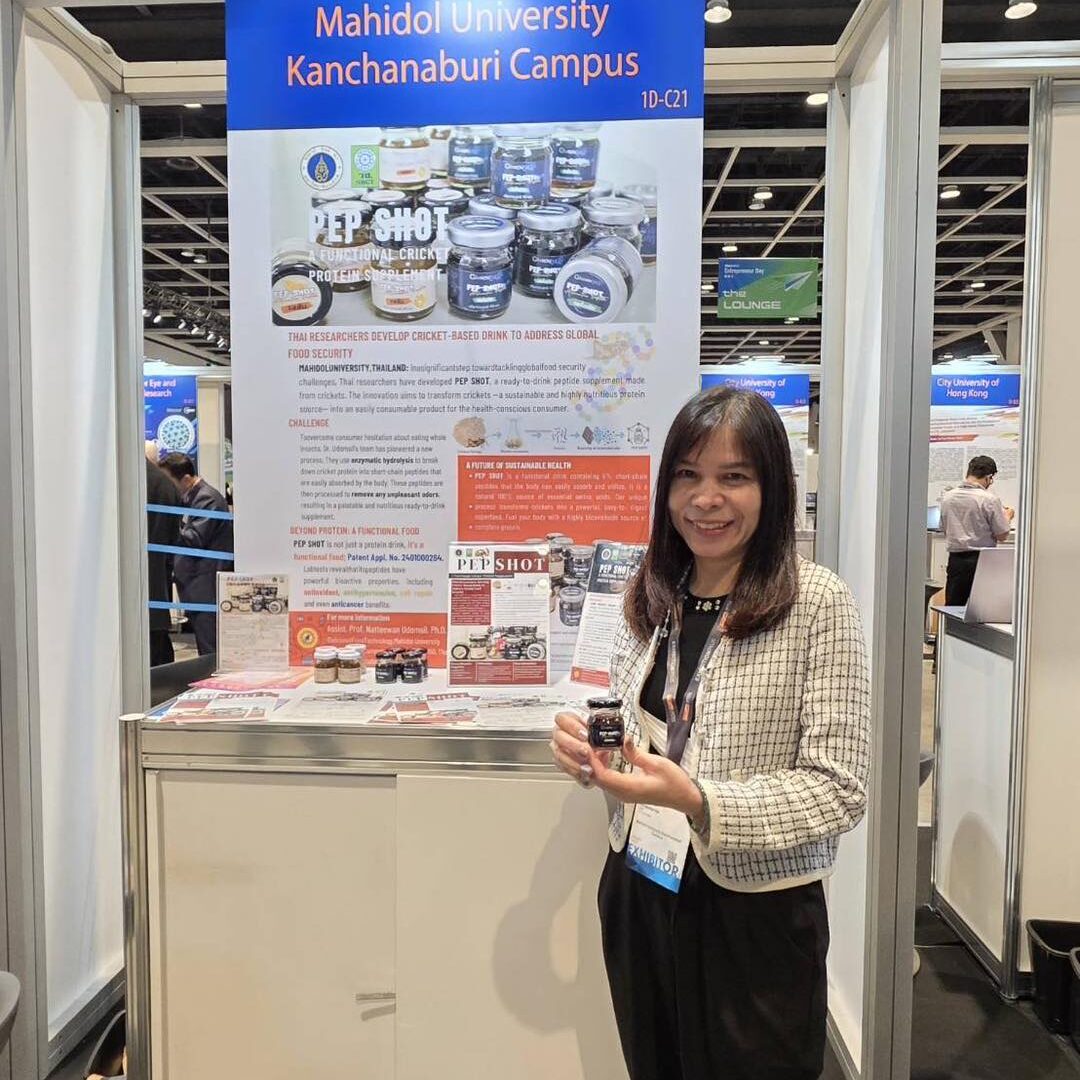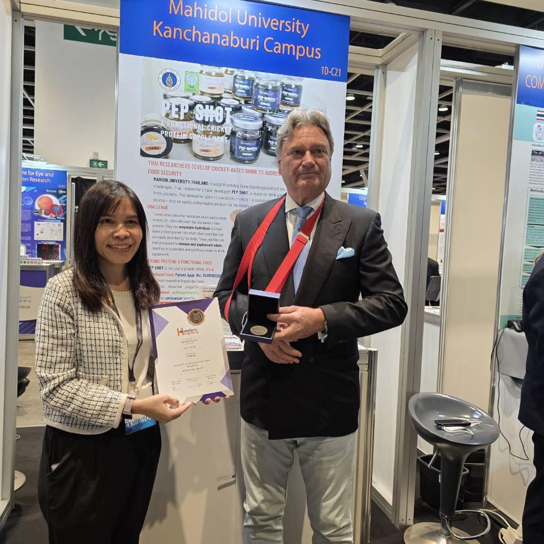 ขอแสดงความยินดีกับผู้ช่วยศาสตราจารย์ ดร.นัทธีวรรณ อุดมศิลป์ อาจารย์ประจำสาขาวิชาเทคโนโลยีการอาหาร เนื่องในโอกาสได้รับรางวัลเหรียญเงิน (Silver Medal) จากการนำผลงาน PEP SHOT: A Functional Cricket Protein Supplement เข้าร่วมประกวดในงาน The 5th Asia Exhibition of Innovations and Inventions Hong Kong (AEII) 2025 ณ Hong Kong Convention and Exhibition Centre เขตบริหารพิเศษฮ่องกงแห่งสาธารณรัฐประชาชนจีน ในระหว่างวันที่ 4-5 ธันวาคม 2568 โดยได้รับการสนับสนุนผลงานจากสำนักงานการวิจัยแห่งชาติ (วช.) ในการนำผลงานเข้าร่วมประกวด