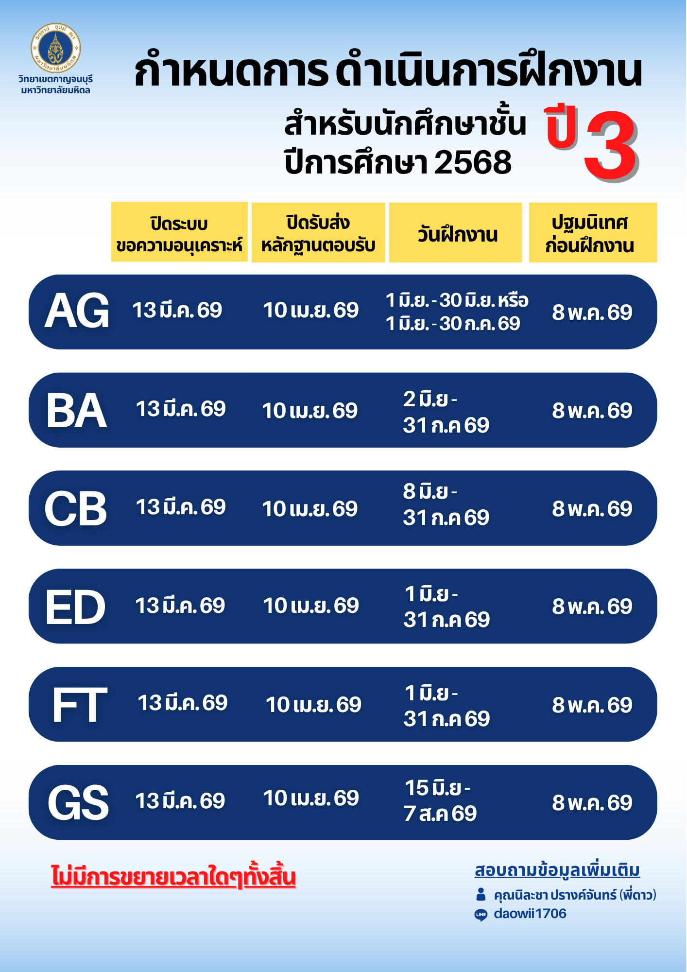 - กำหนดการฝึกงานสำหรับนักศึกษาชั้นปี 3 ปีการศึกษา 2568