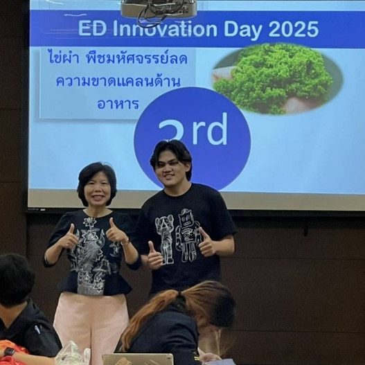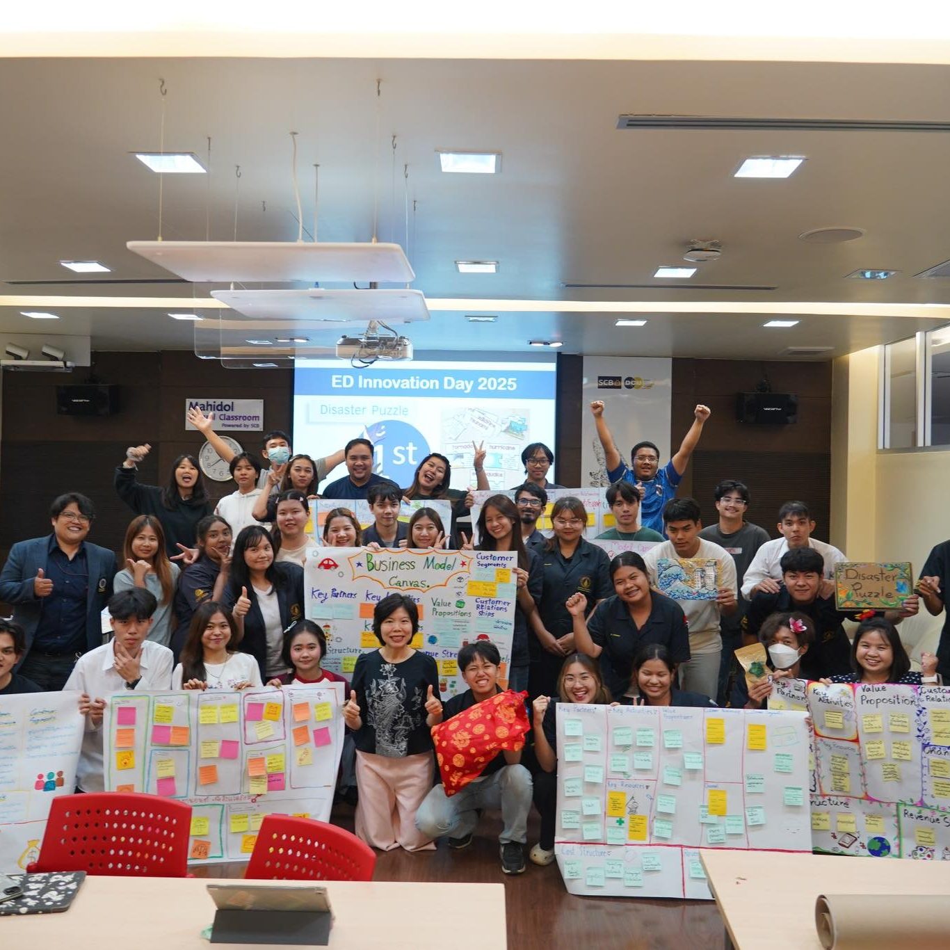 วันที่ 13 พฤษภาคม 2568 หลักสูตรวิศวกรรมสิ่งแวดล้อมและการจัดการภัยพิบัติ จัดกิจกรรม ED Innovation Day 2025 สำหรับนักศึกษาวิศวกรรมสิ่งแวดล้อมฯ ชั้นปีที่ 2 และ 3 โดยมีวัตถุประสงค์เพื่อพัฒนาทักษะการสื่อสารเชิงสร้างสรรค์ให้กับนักศึกษาระดับปริญญาตรี และสร้างแรงบันดาลใจให้กับนักศึกษาในการนำเสนอแนวคิดเชิงสร้างสรรค์เพื่อแก้ไขปัญหา กิจกรรมประกอบด้วยการฝึกปฏิบัติการพัฒนาแบบจำลองธุรกิจ (Business Model Canvas) การประกวดการนำเสนอนวัตกรรมเชิงธุรกิจ (commercial pitching) โดยได้รับเกียรติจากอาจารย์ ดร.สุภัทรชัย รุจาคม อาจารย์ประจำหลักสูตรบัณฑิตศึกษา เป็นวิทยากรและคณาจารย์หลักสูตรวิศวกรรมสิ่งแวดล้อมฯ ร่วมเป็นคณะกรรมการตัดสิน โดยมีจำนวนนักศึกษาเข้าร่วมกิจกรรมและนำเสนอผลงาน จำนวน 39 คน และจำนวนนวัตกรรมเข้าร่วมแข่งขันจำนวน 11 นวัตกรรม โดยมีผลงานที่ได้รับรางวัล ดังนี้