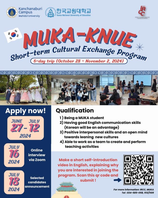กลับมาอีกครั้งกับโครงการแลกเปลี่ยนด้านศิลปวัฒนธรรมระยะสั้น ณ Korea National University of Education (KNUE) สาธารณรัฐเกาหลี ซึ่งปีนี้จะจัดขึ้นในระหว่างวันที่ 28 ตุลาคม – 2 พฤศจิกายน 2567 (6 วัน)
