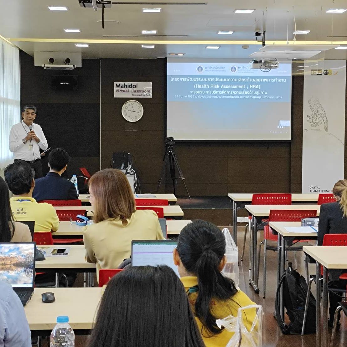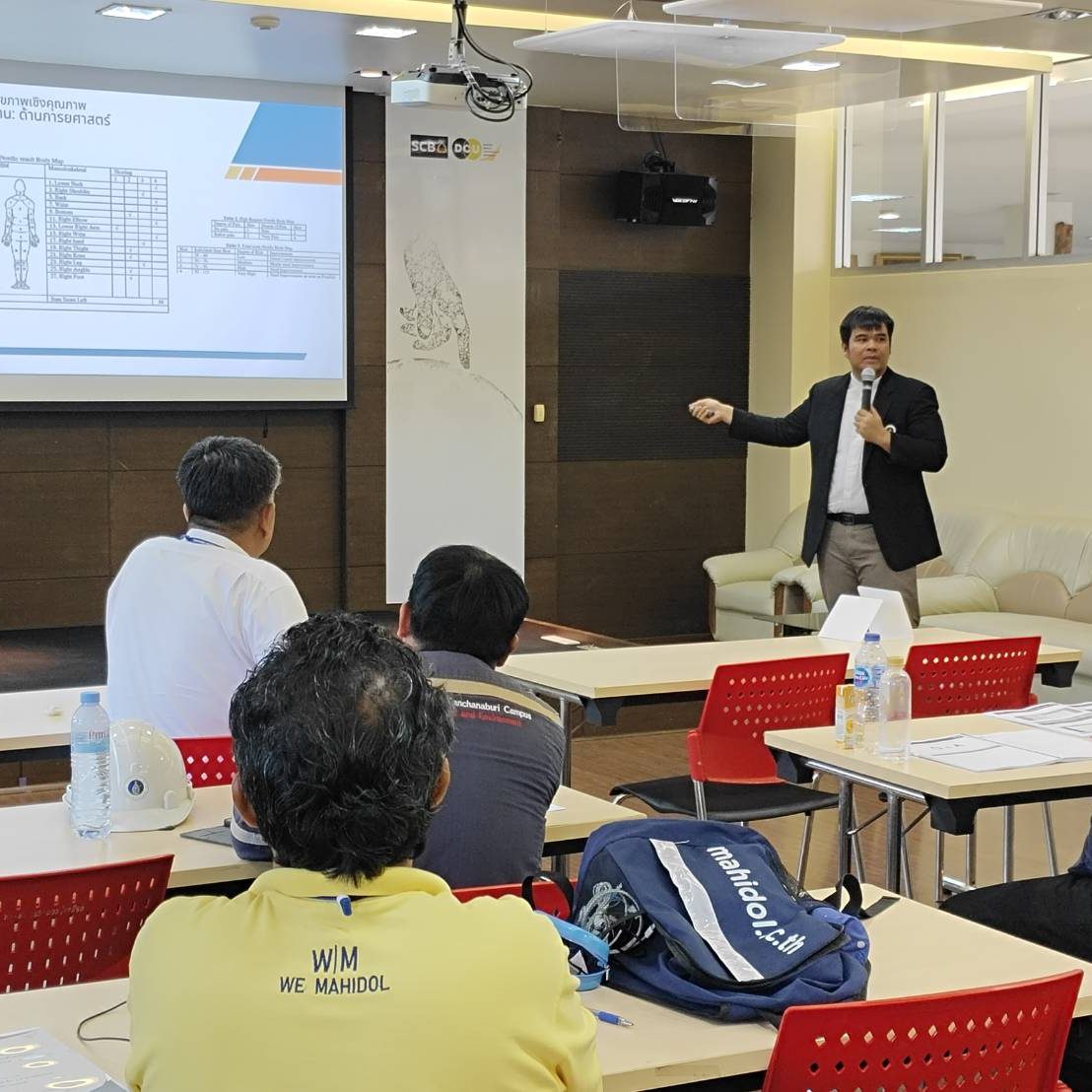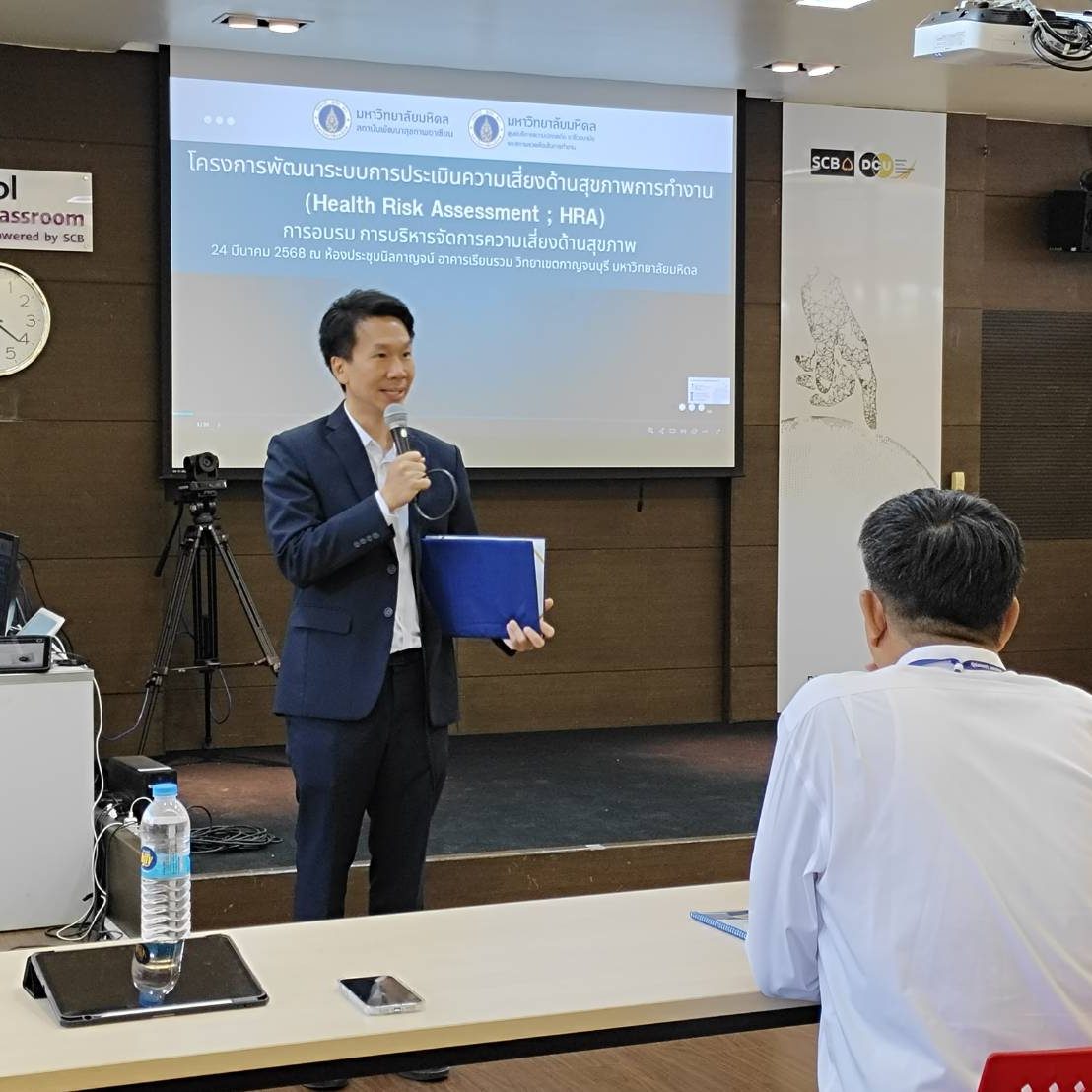 วันที่ 24 มีนาคม 2568 คุณกฤษณ์ ขาวบาง ผู้ช่วยอธิการบดีฝ่ายวิทยาเขตกาญจนบุรี กล่าวต้อนรับผู้ช่วยศาสตราจารย์ ดร.อิทธิโชติ จักรไพวงศ์ รองอธิการบดีฝ่ายกายภาพและสิ่งแวดล้อม รักษาการแทนผู้อำนวยการศูนย์บริหารความปลอดภัย อาชีวอนามัย และสภาพแวดล้อมในการทำงาน ในโอกาสเป็นประธานเปิดกิจกรรมการอบรมในหัวข้อ “การบริหารจัดการความเสี่ยงด้านสุขภาพ” ครั้งที่ 4 ภายใต้โครงการพัฒนาระบบการประเมินความเสี่ยงด้านสุขภาพการทำงาน (Health Risk Assessment ; HRA) มหาวิทยาลัยมหิดล โดยการจัดอบรมในครั้งนี้ ได้รับเกียรติจากผู้ช่วยศาสตราจารย์ ดร.วรกมล บุณยโยธิน ภาควิชาอาชีวอนามัยและความปลอดภัย คณะสาธารณสุขศาสตร์ และดร.ฤทธิรงค์ พันธ์ดี ประธานหลักสูตรสาธารณสุขศาสตรบัณฑิต สาขาวิชาสาธารณสุขชุมชน โครงการจัดตั้งวิทยาเขตนครสวรรค์ พร้อมทีมวิทยากรจากศูนย์บริหารความปลอดภัยฯ (COSHEHEM) ร่วมเป็นวิทยากรบรรยาย โดยมีวัตถุประสงค์เพื่อให้ผู้เข้าร่วมอบรมมีความรู้ความเข้าใจในกระบวนการประเมินความเสี่ยงด้านสุขภาพ สามารถวิเคราะห์และประเมินความเสี่ยงผ่านการฝึกปฏิบัติ และทราบถึงหลักเกณฑ์การลดความเสี่ยงและวิธีการตรวจสุขภาพตามปัจจัยเสี่ยงต่างๆ พร้อมผลักดันให้มหาวิทยาลัยมหิดลก้าวสู่มหาวิทยาลัยสุขภาวะที่ดีต่อไป ณ ห้องประชุมนิลกาญจน์ ชั้น 3 อาคารเรียนรวม วิทยาเขตกาญจนบุรี