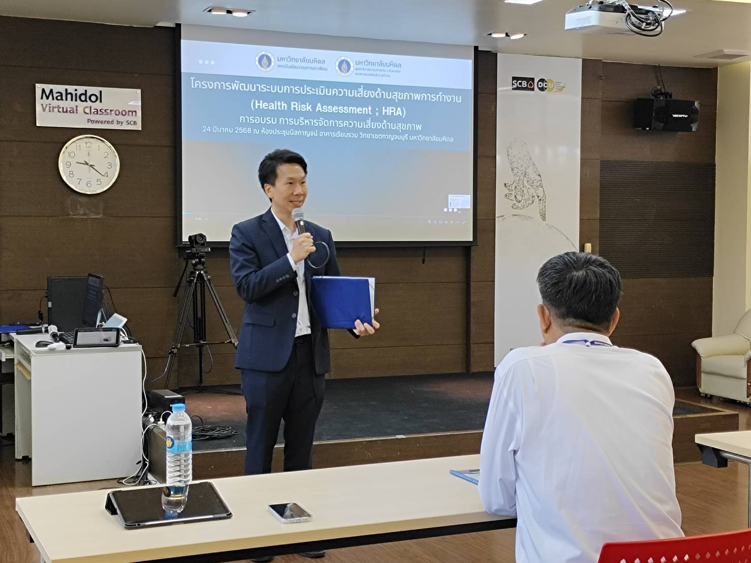 วันที่ 24 มีนาคม 2568 คุณกฤษณ์ ขาวบาง ผู้ช่วยอธิการบดีฝ่ายวิทยาเขตกาญจนบุรี กล่าวต้อนรับผู้ช่วยศาสตราจารย์ ดร.อิทธิโชติ จักรไพวงศ์ รองอธิการบดีฝ่ายกายภาพและสิ่งแวดล้อม รักษาการแทนผู้อำนวยการศูนย์บริหารความปลอดภัย อาชีวอนามัย และสภาพแวดล้อมในการทำงาน ในโอกาสเป็นประธานเปิดกิจกรรมการอบรมในหัวข้อ “การบริหารจัดการความเสี่ยงด้านสุขภาพ” ครั้งที่ 4 ภายใต้โครงการพัฒนาระบบการประเมินความเสี่ยงด้านสุขภาพการทำงาน (Health Risk Assessment ; HRA) มหาวิทยาลัยมหิดล โดยการจัดอบรมในครั้งนี้ ได้รับเกียรติจากผู้ช่วยศาสตราจารย์ ดร.วรกมล บุณยโยธิน ภาควิชาอาชีวอนามัยและความปลอดภัย คณะสาธารณสุขศาสตร์ และดร.ฤทธิรงค์ พันธ์ดี ประธานหลักสูตรสาธารณสุขศาสตรบัณฑิต สาขาวิชาสาธารณสุขชุมชน โครงการจัดตั้งวิทยาเขตนครสวรรค์ พร้อมทีมวิทยากรจากศูนย์บริหารความปลอดภัยฯ (COSHEHEM) ร่วมเป็นวิทยากรบรรยาย โดยมีวัตถุประสงค์เพื่อให้ผู้เข้าร่วมอบรมมีความรู้ความเข้าใจในกระบวนการประเมินความเสี่ยงด้านสุขภาพ สามารถวิเคราะห์และประเมินความเสี่ยงผ่านการฝึกปฏิบัติ และทราบถึงหลักเกณฑ์การลดความเสี่ยงและวิธีการตรวจสุขภาพตามปัจจัยเสี่ยงต่างๆ พร้อมผลักดันให้มหาวิทยาลัยมหิดลก้าวสู่มหาวิทยาลัยสุขภาวะที่ดีต่อไป ณ ห้องประชุมนิลกาญจน์ ชั้น 3 อาคารเรียนรวม วิทยาเขตกาญจนบุรี