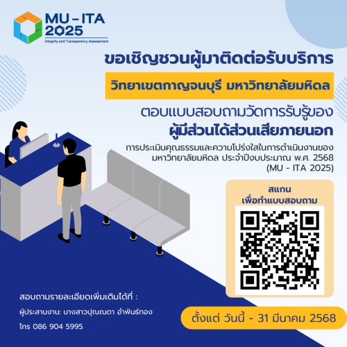 เพื่อเปิดโอกาสให้ผู้มารับบริการหรือผู้มาติดต่อวิทยาเขตกาญจนบุรี มหาวิทยาลัยมหิดล ได้มีโอกาสสะท้อนและแสดงความคิดเห็นต่อการดำเนินงานวิทยาเขตกาญจนบุรี มหาวิทยาลัยมหิดล ซึ่งจะสอบถามเกี่ยวกับการรับรู้และความคิดเห็นใน 3 ตัวชี้วัด ได้แก่