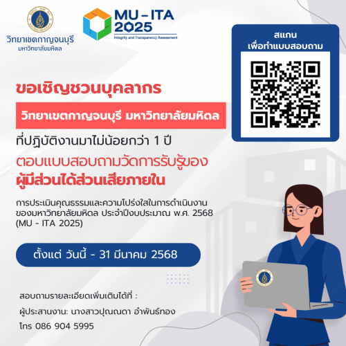 เพื่อเปิดโอกาสให้บุคลากรทุกระดับที่ปฏิบัติงานไม่น้อยกว่า 1 ปี ได้มีโอกาสสะท้อนและแสดงความคิดเห็นต่อคุณธรรมและความโปร่งใสของวิทยาเขตกาญจนบุรี มหาวิทยาลัยมหิดล โดยแบบสอบถามการรับรู้และความคิดเห็นจะสอบถามใน 5 ตัวชี้วัด ได้แก่