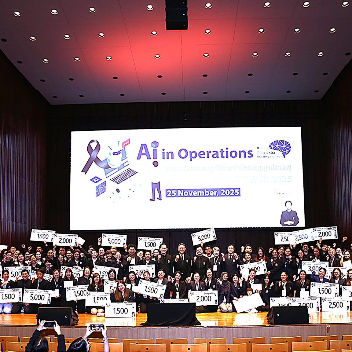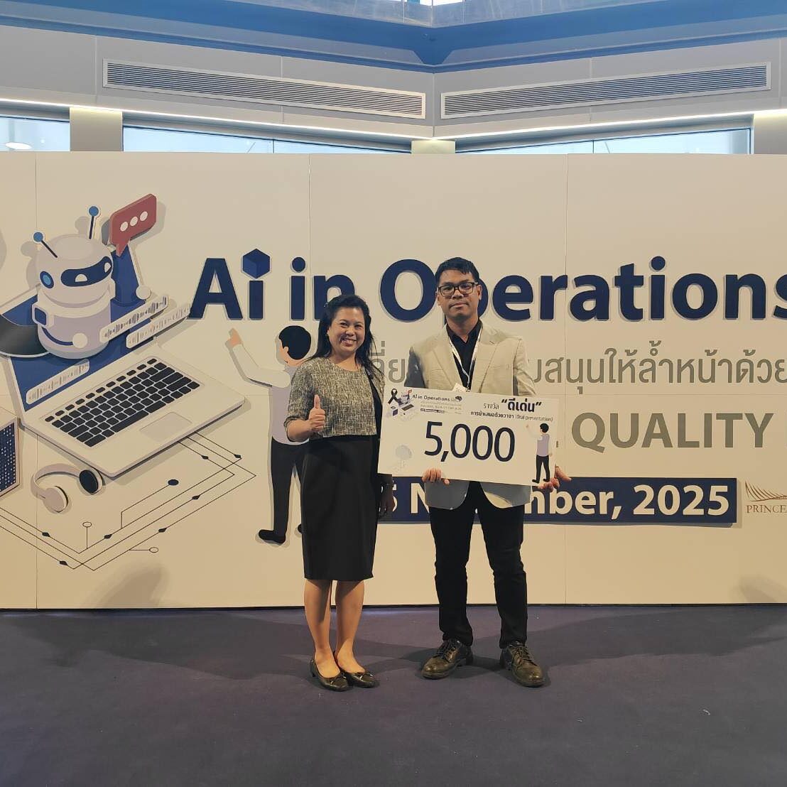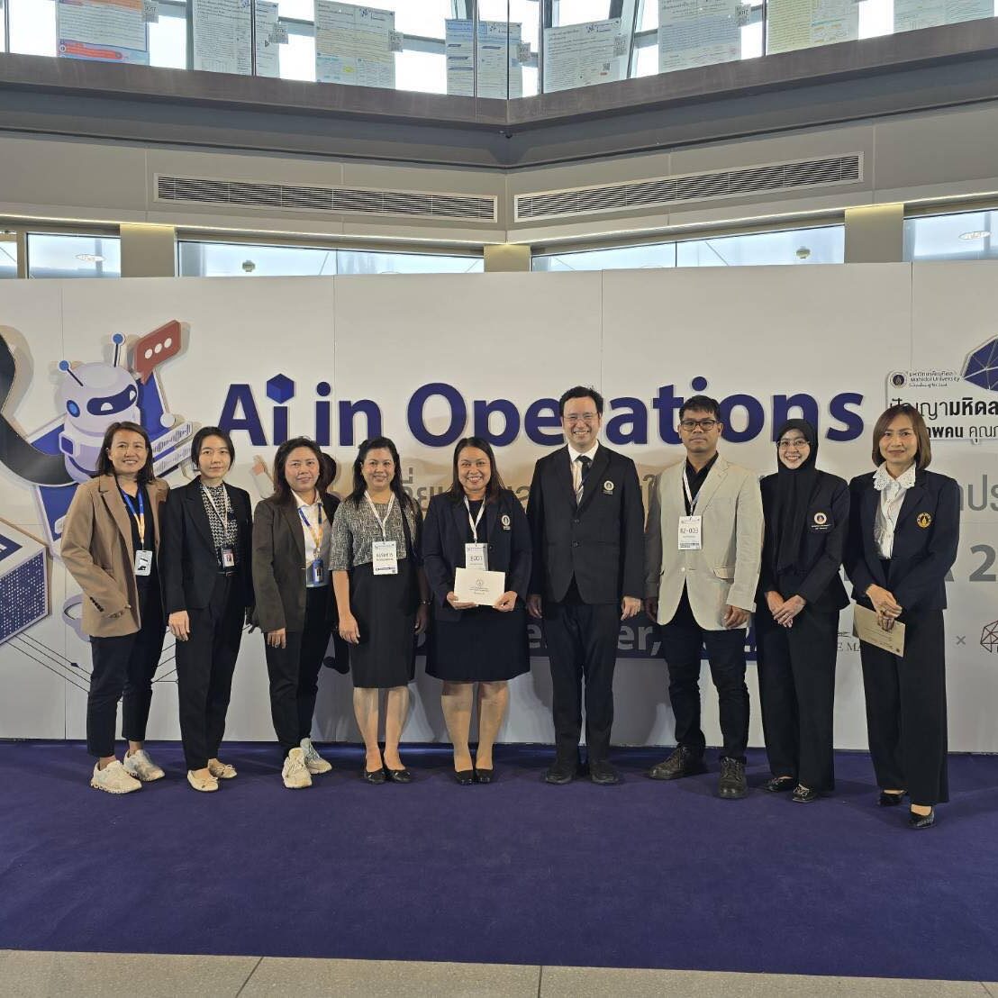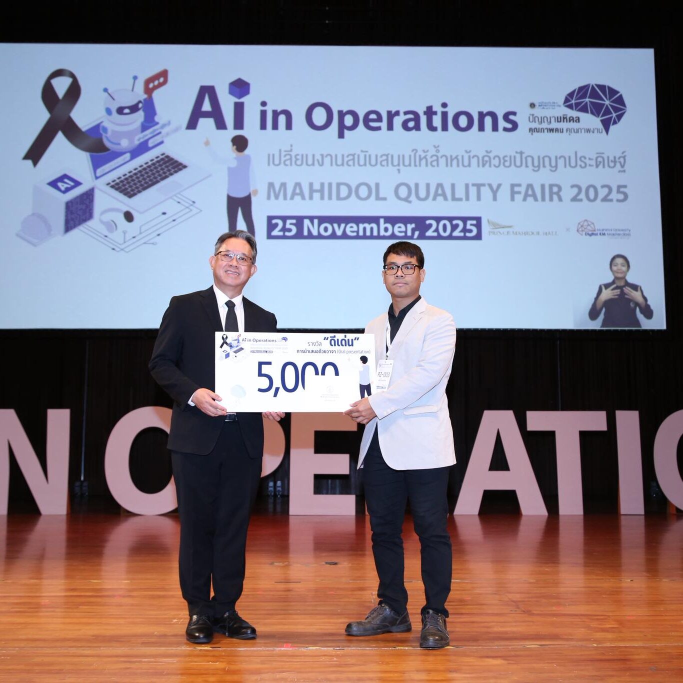 วันที่ 25 พฤศจิกายน 2568 ผู้ช่วยศาสตราจารย์ ดร.ธัชวีร์ ลีละวัฒน์ รองอธิการบดีฝ่ายวิทยาเขตกาญจนบุรี พร้อมด้วยผู้ช่วยศาสตราจารย์ ดร.วราภรณ์ ตรีพรหม ผู้ช่วยรองอธิการบดีฝ่ายวิทยาเขตกาญจนบุรี ด้านแผนและวิจัย และบุคลากรวิทยาเขตกาญจนบุรี เข้าร่วมงานมหกรรมคุณภาพประจำปี 2568 จัดภายใต้หัวข้อ “AI in Operations : เปลี่ยนงานสนับสนุนให้ล้ำหน้าด้วยปัญญาประดิษฐ์” และในโอกาสนี้ได้ร่วมแสดงความยินดีกับนายธีรศักดิ์ ศรีสันต์ นักวิชาการศึกษา สังกัดงานกายภาพและสิ่งแวดล้อม ที่ร่วมนำเสนอผลงานในหัวข้อ “การพัฒนาเว็บแอปพลิเคชันด้วย Generative AI: กรณีศึกษาการพัฒนาระบบจองห้องประชุมมหาวิทยาลัยมหิดล วิทยาเขตกาญจนบุรี” และได้รับรางวัล “ดีเด่น” ในการนำเสนอประเภท Oral Presentation โดยเป็นผลงานระดับพัฒนางานประจำสู่งานวิจัย (Routine to Research, R2R) หรือนวัตกรรมในการพัฒนาคุณภาพ (Innovation in Quality Development, InQD) ซึ่งมหาวิทยาลัยมหิดล ได้ให้ความสำคัญกับบุคลากรและการพัฒนาบุคลากรอย่างต่อเนื่อง และเป็นพื้นที่ให้บุคลากรเกิดความคิดริเริ่มพัฒนาด้านต่างๆ เพื่อสร้างสรรค์ผลงานที่มีคุณภาพ พัฒนาตน พัฒนางาน นำไปสู่สิ่งที่ดีขึ้นอย่างต่อเนื่องให้กับมหาวิทยาลัยต่อไป โดยจัดกิจกรรมรูปแบบ Hybrid Conference ณ มหิดลสิทธาคาร มหาวิทยาลัยมหิดล ศาลายา