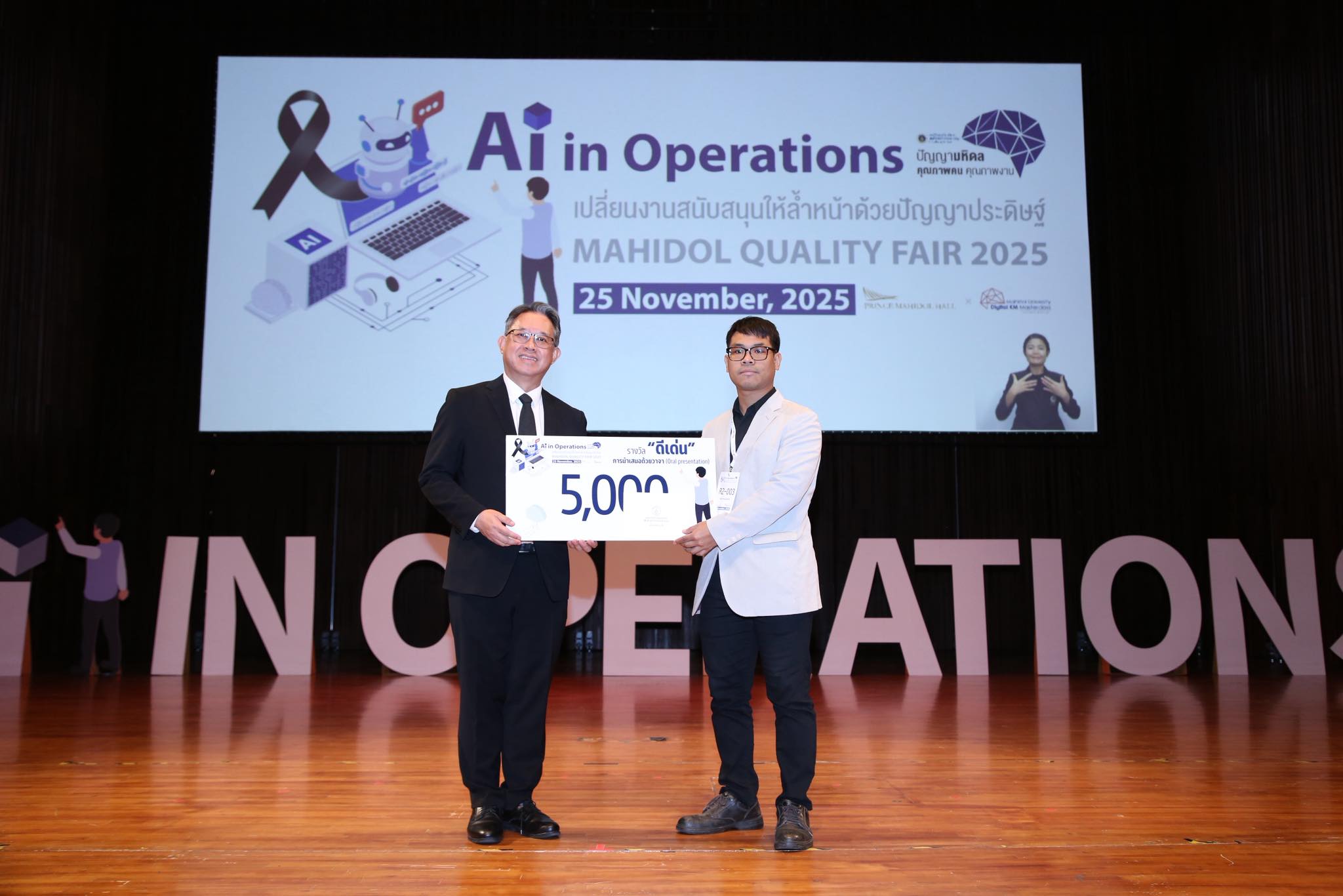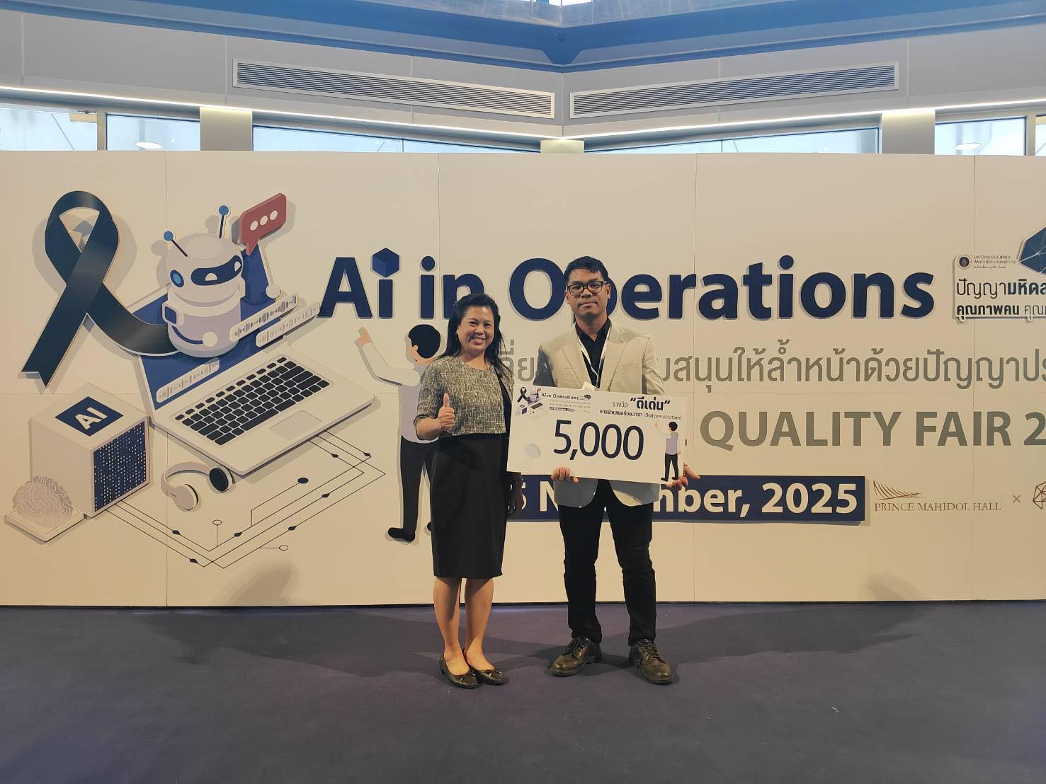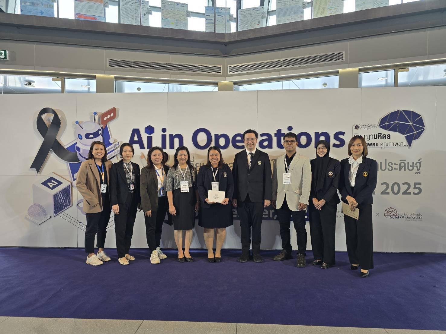 วันที่ 25 พฤศจิกายน 2568 ผู้ช่วยศาสตราจารย์ ดร.ธัชวีร์ ลีละวัฒน์ รองอธิการบดีฝ่ายวิทยาเขตกาญจนบุรี พร้อมด้วยผู้ช่วยศาสตราจารย์ ดร.วราภรณ์ ตรีพรหม ผู้ช่วยรองอธิการบดีฝ่ายวิทยาเขตกาญจนบุรี ด้านแผนและวิจัย และบุคลากรวิทยาเขตกาญจนบุรี เข้าร่วมงานมหกรรมคุณภาพประจำปี 2568 จัดภายใต้หัวข้อ “AI in Operations : เปลี่ยนงานสนับสนุนให้ล้ำหน้าด้วยปัญญาประดิษฐ์” และในโอกาสนี้ได้ร่วมแสดงความยินดีกับนายธีรศักดิ์ ศรีสันต์ นักวิชาการศึกษา สังกัดงานกายภาพและสิ่งแวดล้อม ที่ร่วมนำเสนอผลงานในหัวข้อ “การพัฒนาเว็บแอปพลิเคชันด้วย Generative AI: กรณีศึกษาการพัฒนาระบบจองห้องประชุมมหาวิทยาลัยมหิดล วิทยาเขตกาญจนบุรี” และได้รับรางวัล “ดีเด่น” ในการนำเสนอประเภท Oral Presentation โดยเป็นผลงานระดับพัฒนางานประจำสู่งานวิจัย (Routine to Research, R2R) หรือนวัตกรรมในการพัฒนาคุณภาพ (Innovation in Quality Development, InQD) ซึ่งมหาวิทยาลัยมหิดล ได้ให้ความสำคัญกับบุคลากรและการพัฒนาบุคลากรอย่างต่อเนื่อง และเป็นพื้นที่ให้บุคลากรเกิดความคิดริเริ่มพัฒนาด้านต่างๆ เพื่อสร้างสรรค์ผลงานที่มีคุณภาพ พัฒนาตน พัฒนางาน นำไปสู่สิ่งที่ดีขึ้นอย่างต่อเนื่องให้กับมหาวิทยาลัยต่อไป โดยจัดกิจกรรมรูปแบบ Hybrid Conference ณ มหิดลสิทธาคาร มหาวิทยาลัยมหิดล ศาลายา