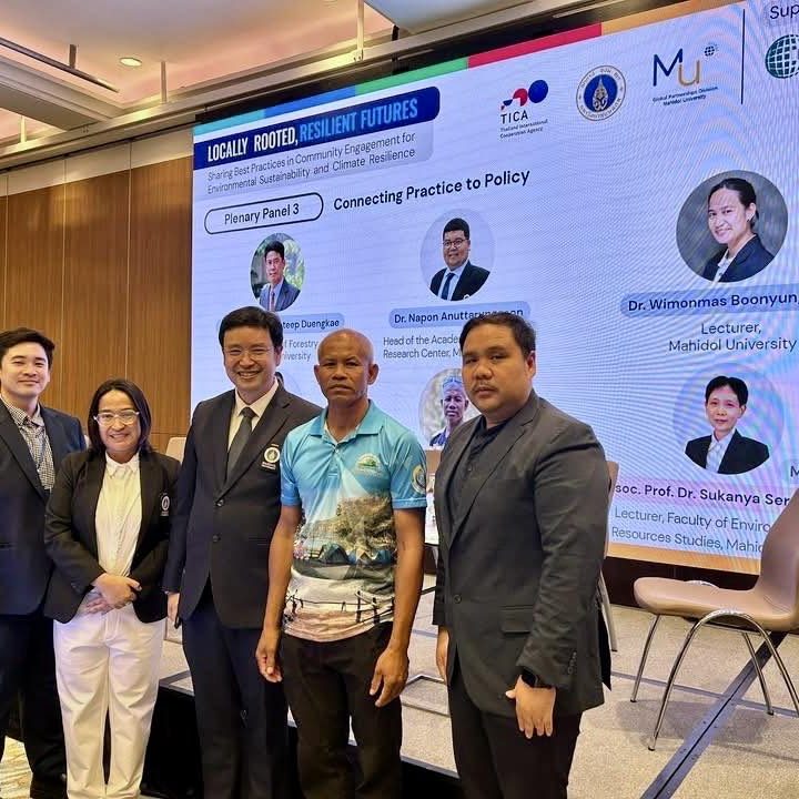วันที่ 21 สิงหาคม 2568 ศาสตราจารย์ นายแพทย์ปิยะมิตร ศรีธรา อธิการบดีมหาวิทยาลัยมหิดล กล่าวต้อนรับผู้เข้าร่วมงาน พร้อมด้วย Mr. Eric Arndt Director, Asia Regional Office, The Rockefeller Foundation กล่าวเปิดงานสัมมนา “รากฐานท้องถิ่นสู่อนาคตที่ยั่งยืน: การแบ่งปันแนวปฏิบัติในการมีส่วนร่วมของชุมชนเพื่อความยั่งยืนด้านสิ่งแวดล้อมและการรับมือต่อการเปลี่ยนแปลงสภาพภูมิอากาศ (Locally Rooted, Resilient Futures: Sharing Best Practices in Community Engagement for Sustainable Development and Climate Resilience)” ในโอกาสนี้ ผู้ช่วยศาสตราจารย์ ดร.ธัชวีร์ ลีละวัฒน์ รองอธิการบดีฝ่ายวิทยาเขตกาญจนบุรี เข้าร่วมพิธีเปิดงานสัมมนา และร่วมการเสวนาในหัวข้อ ธุรกิจเพื่อสังคม : วิสาหกิจและ NGOs ที่สร้างผลกระทบในระดับชุมชน (Enterprise with Purpose: Social Businesses and NGOs Driving Local Impact) และอาจารย์ ดร.วิมลมาศ บุญยั่งยืน อาจารย์ประจำสาขาวิชาวิศวกรรมสิ่งแวดล้อมและการจัดการภัยพิบัติ, นายทิวาห์ สุดประเสริฐ ผู้ช่วยผู้ใหญ่บ้าน ชุมชนบ้านสามัคคีธรรม จังหวัดกาญจนบุรี ร่วมการเสวนาในหัวข้อ เชื่อมโยงการปฏิบัติสู่นโยบาย : สร้างระบบนิเวศเพื่อการพัฒนาโดยชุมชน (Connecting Practice to Policy : Ecosystem for Community-Based Development) โดยมีคณาจารย์วิทยาเขตกาญจนบุรีเข้าร่วมงาน ณ ห้องบอลรูม โรงแรมเดอะเวสทิน แกรนด์ สุขุมวิท กรุงเทพฯ การจัดสัมมนาครั้งนี้โดยกองวิเทศสัมพันธ์ และกองแผนงาน มหาวิทยาลัยมหิดล เพื่อเป็นเวทีแลกเปลี่ยนประสบการณ์ ทั้งในภาคการศึกษา ภาควิชาสหกิจเพื่อสังคม และ NGOs ของไทย ในการทำงานร่วมกับชุมชน การแบ่งปันแนวปฏิบัติที่ดีและประสบการณ์จริงในการทำงานร่วมกับชุมชน และการรับมือต่อการเปลี่ยนแปลงสภาพภูมิอากาศ โดยมีผู้เชี่ยวชาญหลากหลายภาคส่วน ทั้งภาครัฐ ภาคเอกชน ภาคประชาชน ภาคสังคม ร่วมสะท้อนถึงความท้าทายหรืออุปสรรค เพื่อให้เกิดการพัฒนาอย่างยั่งยืนให้กับสังคมและชุมชนต่อไป