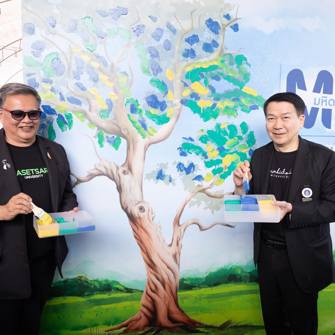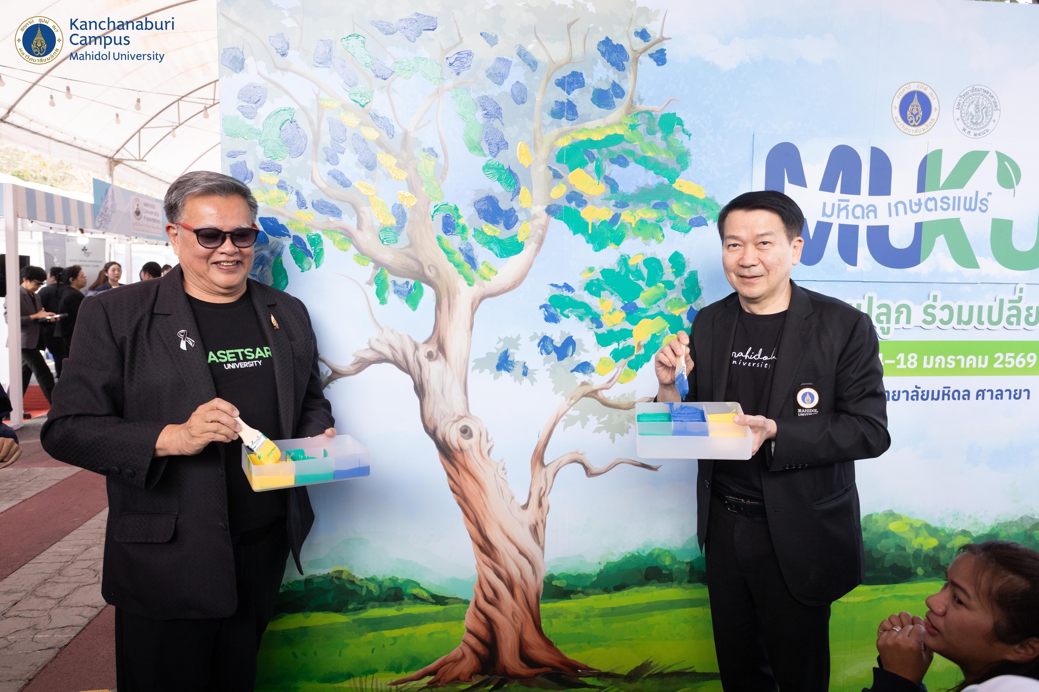 วันที่ 14 มกราคม 2569 ศาสตราจารย์ นายแพทย์ปิยะมิตร ศรีธรา อธิการบดีมหาวิทยาลัยมหิดล และ ดร.ดำรงค์ ศรีพระราม รักษาการแทนอธิการบดีมหาวิทยาลัยเกษตรศาสตร์ เป็นประธานเปิดงาน “มหิดล – เกษตรแฟร์ 2569” (MU x KU Fair 2026) ภายใต้แนวคิด “ร่วมปลูก ร่วมเปลี่ยน” (Grow Together, Change Together) โดยผู้ช่วยศาสตราจารย์ ดร.ธัชวีร์ ลีละวัฒน์ รองอธิการบดีฝ่ายวิทยาเขตกาญจนบุรี พร้อมด้วยคณะผู้บริหาร บุคลากร และนักศึกษามหาวิทยาลัยมหิดล วิทยาเขตกาญจนบุรี เข้าร่วมในพิธีเปิด “มหิดล – เกษตรแฟร์ 2569” (MU x KU Fair 2026) จัดขึ้นในระหว่างวันที่ 14–18 มกราคม 2569 ในโอกาสนี้ สาขาวิชาวิทยาศาสตร์การเกษตร วิทยาเขตกาญจนบุรี และบริษัท MU Greenovation จำกัด เข้าร่วมจัดแสดงนิทรรศการ ผลงาน นวัตกรรม และสินค้าทางเกษตร ซึ่งภายในงานจัดในรูปแบบ“ห้องเรียนไร้กำแพง” (Learning Outside the Classroom) เปิดพื้นที่การเรียนรู้และการมีส่วนร่วมของประชาชนทุกช่วงวัย ผ่านกิจกรรมหลัก ได้แก่ ด้านวิชาการ (Academic & Future) ด้านสุขภาพ (Holistic Health) ด้านนันทนาการ (Happiness & Recreation) ด้านเศรษฐกิจ (Economy & Innovation) และด้านสิ่งแวดล้อม (Eco-Friendly) ซึ่งเป็นความร่วมมือระหว่าง มหาวิทยาลัยมหิดล และมหาวิทยาลัยเกษตรศาสตร์ เพื่อร่วมกันขับเคลื่อนแนวคิด Health Ecosystem หรือระบบนิเวศสุขภาพแบบองค์รวม ครอบคลุมตั้งแต่ต้นน้ำ คือแหล่งอาหารที่ปลอดภัยและเป็นมิตรต่อสิ่งแวดล้อม ไปจนถึงปลายน้ำ คือคุณภาพชีวิตและสุขภาพที่ดีของประชาชน พร้อมมุ่งสู่เป้าหมาย สังคมคาร์บอนต่ำ (Carbon Neutrality) อย่างยั่งยืน สะท้อนบทบาท ของสถาบันอุดมศึกษาในการเป็นพลังสำคัญในการขับเคลื่อนสังคมตามแนวคิด “ร่วมปลูก ร่วมเปลี่ยน” อย่างเป็นรูปธรรม ณ มหาวิทยาลัยมหิดล ศาลายา