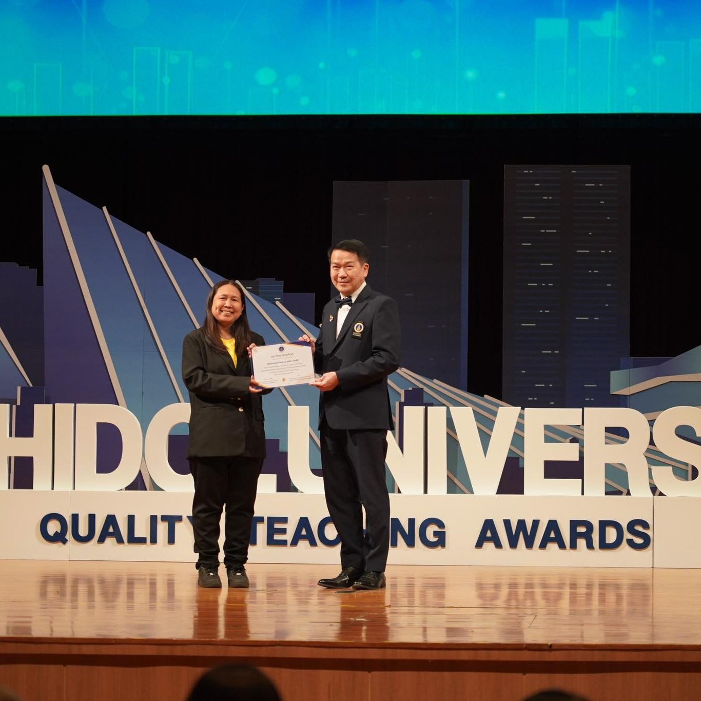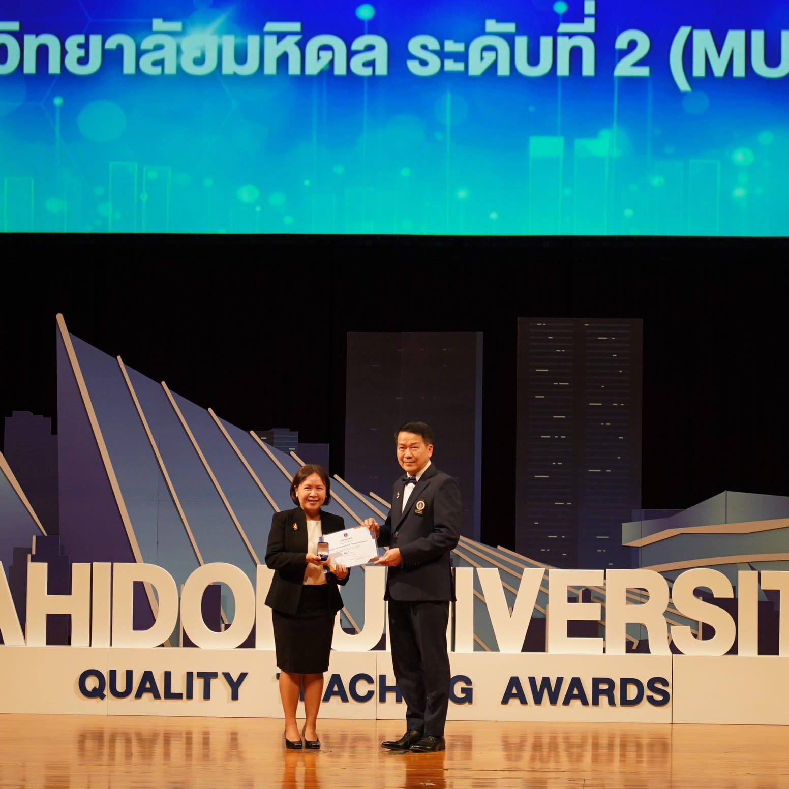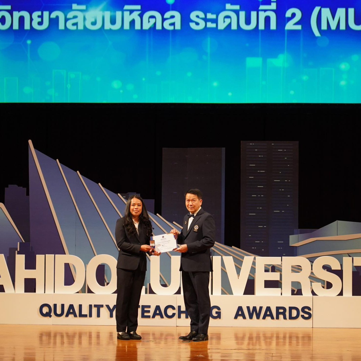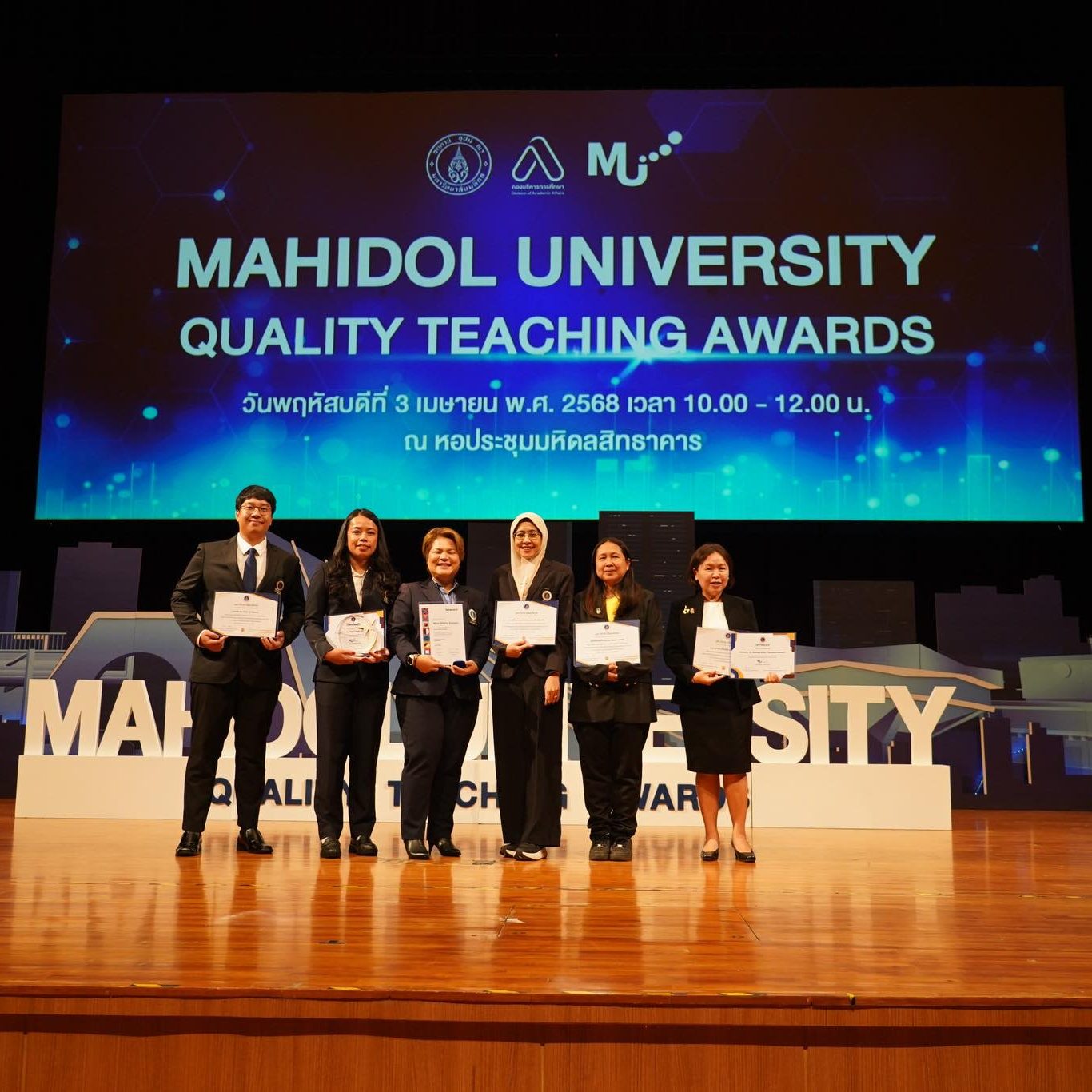 วันที่ 3 เมษายน 2568 ศาสตราจารย์ นายแพทย์ปิยะมิตร ศรีธรา อธิการบดี มหาวิทยาลัยมหิดล เป็นประธานเปิดงานในพิธีมอบรางวัลและประกาศนียบัตร พร้อมร่วมแสดงความยินดีกับคณาจารย์ที่ได้รับรางวัลประเภทต่างๆ ในงาน “Mahidol University Quality Teaching Awards” ตามที่มหาวิทยาลัยมหิดล ดำเนินงานสนับสนุนการประเมินระดับการจัดการเรียนการสอนตามเกณฑ์มาตรฐานคุณภาพอาจารย์ของมหาวิทยาลัยมหิดล (Mahidol University Professional Standards Framework : MUPSF) รวมทั้งสนับสนุนให้อาจารย์มหาวิทยาลัยมหิดล พัฒนาตนเองในด้านการจัดการเรียนการสอนอย่างต่อเนื่อง และเพื่อเป็นการยกย่อง อาจารย์ที่มีความโดดเด่นในด้านการจัดการเรียนการสอน โดยคณาจารย์วิทยาเขตกาญจนบุรี ร่วมเข้ารับรางวัลและรับประกาศนียบัตร ดังนี้