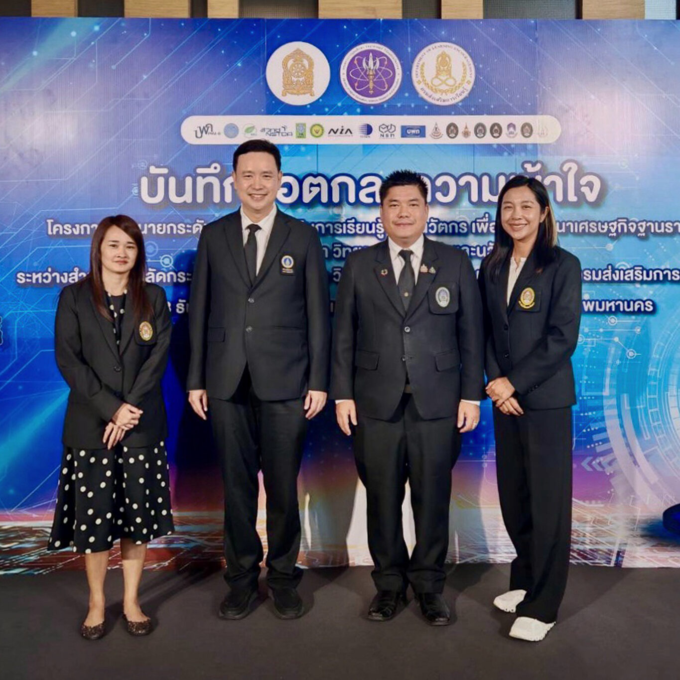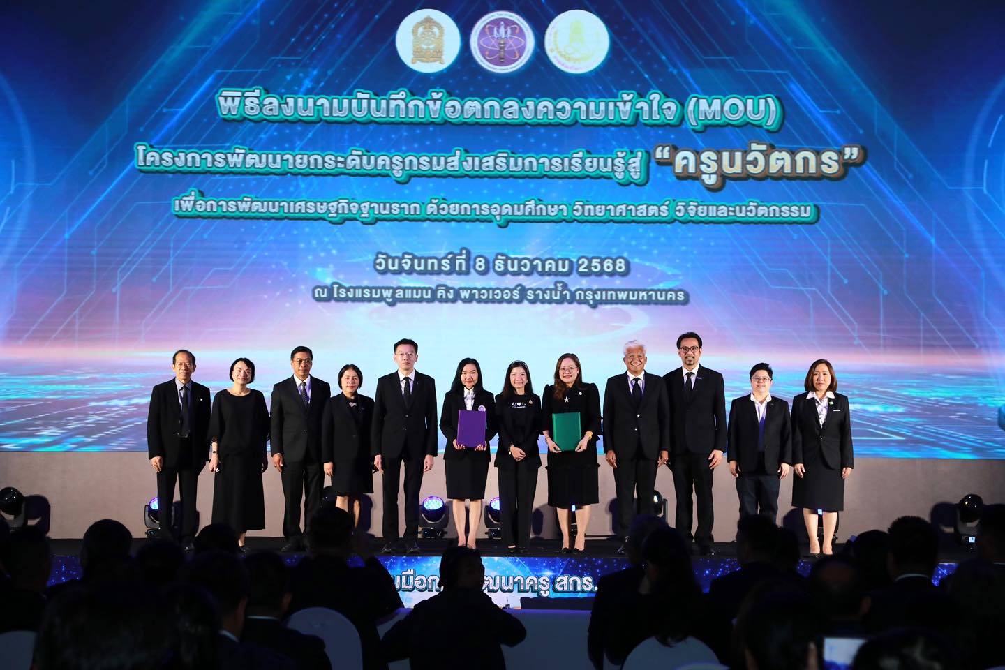 วันที่ 8 ธันวาคม 2568 ผู้ช่วยศาสตราจารย์ ดร.ธัชวีร์ ลีละวัฒน์ รองอธิการบดีฝ่ายวิทยาเขตกาญจนบุรี เข้าร่วมพิธีลงนามบันทึกข้อตกลงความเข้าใจ (MOU) โครงการพัฒนายกระดับครูกรมส่งเสริมการเรียนรู้สู่ครูนวัตกร เพื่อการพัฒนาเศรษฐกิจฐานรากด้วย อววน. สำหรับ “โครงการพัฒนายกระดับครูกรมส่งเสริมการเรียนรู้สู่ครูนวัตกร” มีเป้าหมายหลักเพื่อบูรณาการทรัพยากรและสร้างเครือข่ายความร่วมมือด้าน อววน. โดยมุ่งเน้นการบ่มเพาะครูกรมส่งเสริมการเรียนรู้ (สกร.) ให้มีความพร้อมทั้งองค์ความรู้และการปฏิบัติจริง เพื่อก้าวสู่การเป็น “ครูนวัตกร” ที่มีทักษะแห่งศตวรรษที่ 21