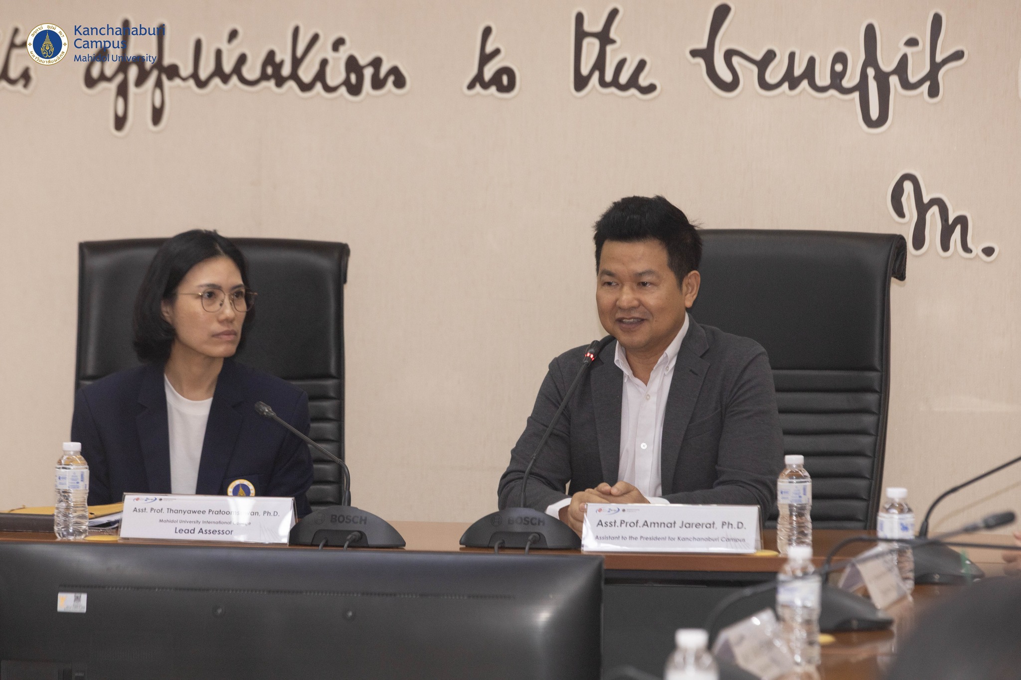 วันที่ 19 สิงหาคม 2568 ผู้ช่วยศาสตราจารย์ ดร.อำนาจ เจรีรัตน์ ผู้ช่วยอธิการบดีฝ่ายวิทยาเขตกาญจนบุรี พร้อมด้วยคณาจารย์วิทยาเขตกาญจนบุรี ร่วมให้การต้อนรับคณะกรรมการตรวจประเมินคุณภาพการศึกษาระดับหลักสูตรตามเกณฑ์ AUN-QA มหาวิทยาลัยมหิดล (MU AUN-QA Assessment) ประจำปี 2568 ของหลักสูตรบริหารธุรกิจบัณฑิต และหลักสูตรบัญชีบัณฑิต ในระหว่างวันที่ 19-20 สิงหาคม 2568 ซึ่งคณะกรรมการตรวจประเมินฯหลักสูตรบริหารธุรกิจบัณฑิต โดยผู้ช่วยศาสตราจารย์ ดร.ธัญวี ประทุมสุวรรณ์ วิทยาลัยนานาชาติ ประธานตรวจประเมินฯ(Lead) พร้อมด้วยอาจารย์ ดร.ศุภชัย ชาญวรรณกุล คณะศิลปศาสตร์ กรรมการ (Assessor) และคณะกรรมการตรวจประเมินฯหลักสูตรบัญชีบัณฑิต โดยรองศาสตราจารย์ ดร.ธีระพงศ์ ศิริบูรณ์พิพัฒนา คณะแพทยศาสตร์โรงพยาบาลรามาธิบดี ประธานตรวจประเมิน(Lead) พร้อมด้วยอาจารย์ ดร.น.สพ.ไกรพิชญ์ สุธรรมมาภรณ์ คณะสัตวแพทยศาสตร์ กรรมการ(Assessor) โดยคณะกรรมการผู้ตรวจประเมินฯ รับฟังการบรรยายสรุปข้อมูลของหลักสูตรบริหารธุรกิจบัณฑิต และหลักสูตรบัญชีบัณฑิต พร้อมกับสัมภาษณ์ คณะกรรมการบริหารหลักสูตร บุคลากร นักศึกษา ศิษย์เก่าและผู้ใช้บัณฑิต และเยี่ยมชมสถานที่ต่างๆ ภายในวิทยาเขต สิ่งอำนวยความสะดวกในการจัดการเรียนการสอน โดยคณะกรรมการให้ข้อเสนอแนะ เพื่อปรับปรุงแก้ไขและสรุปผลการตรวจประเมินด้วยวาจา ณ ห้องประชุมสกุลกันภัย มหาวิทยาลัยมหิดล วิทยาเขตกาญจนบุรี