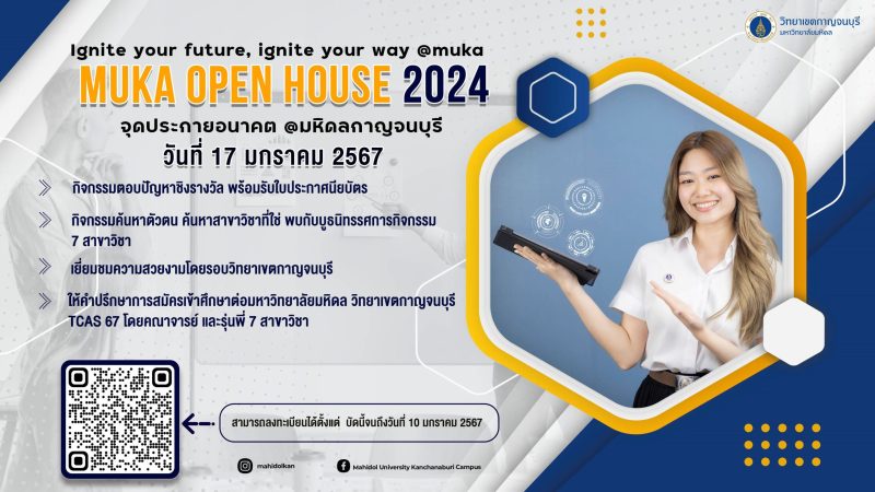 ขอเชิญชวน นักเรียน นักศึกษา คณาจารย์ และผู้สนใจ เข้าร่วมงานเปิดบ้าน มหาวิทยาลัยมหิดล วิทยาเขตกาญจนบุรี 2567 (MUKA Open House 2024)
