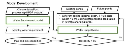 A specific pond capacity for the Pond Construction Project provided by the Thai government was planned and started in the Chao Phraya River Basin without considering the local conditions, water requirement, and overflow protection. This research aims to construct pond modelling based on those factors, provide pond information (designs, pond management, and the number of future ponds), and estimate the impacts on the flow regime. In the pond management model driven by water requirement, water budget and economic models, three classified types of ponds (public, private and future ponds) were simulated by different pond operation rules based on the monthly water demand and the flood and drought protection. The post-processing future climate data of the d4PDF model containing 1,800 years were proceeded to predict the daily pond inflow, release, and water level to estimate pond capacities. In the economic model, the cost-benefit ratio was used to optimize the numbers of future ponds. Future climate data were also included to consider long-term impacts. At greater than 80% of pond reliability, the minimum capacity of future ponds is suggested to be in the range of 1,000-3,000 m3 with a depth range of 2-4 m.