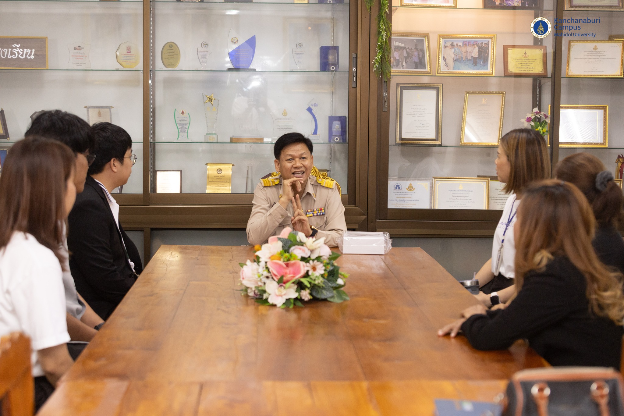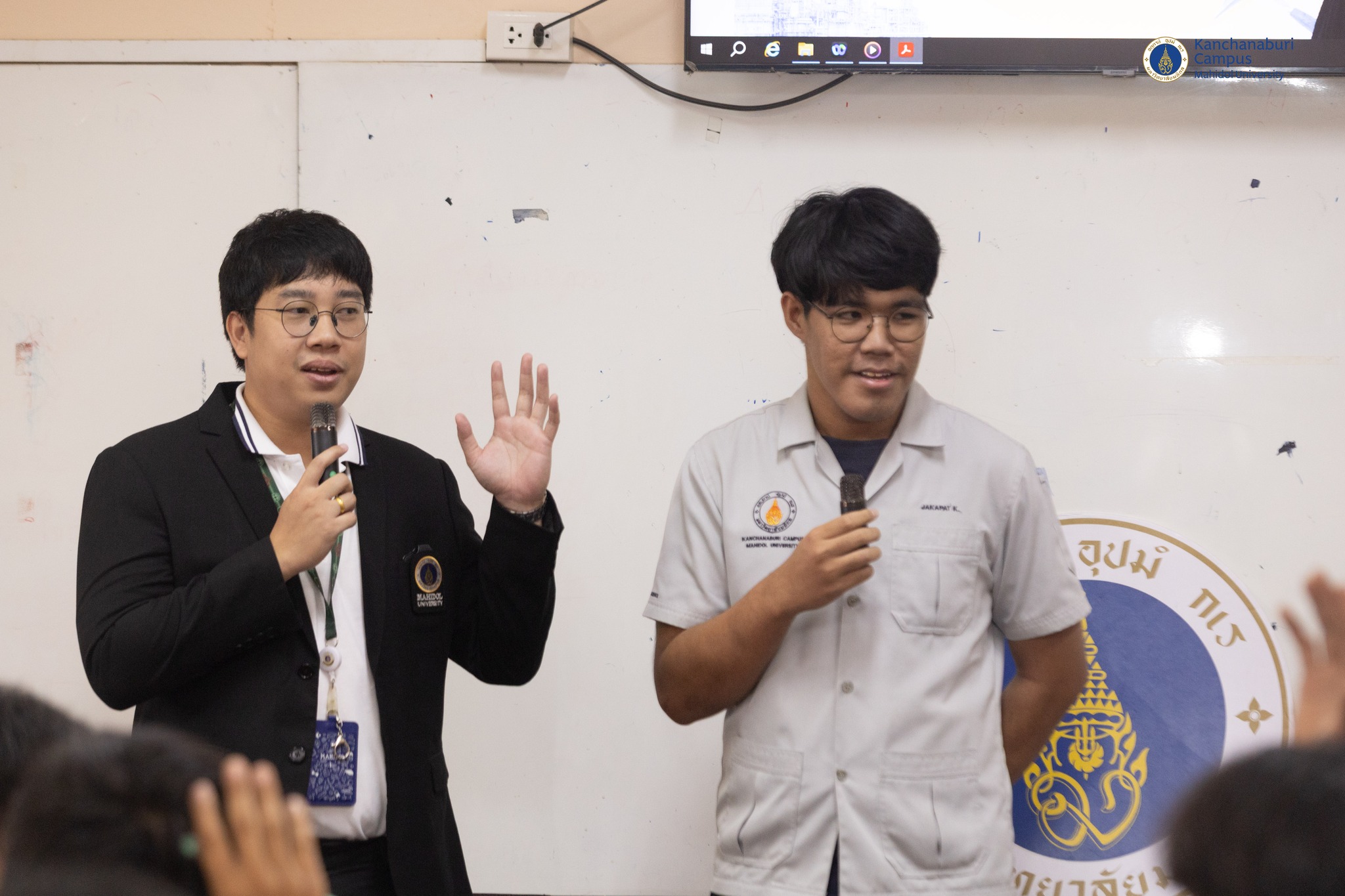 วันที่ 17 พฤศจิกายน 2568 อาจารย์และนักศึกษาสาขาวิชาวิทยาศาสตร์การเกษตร พร้อมด้วยบุคลากรงานวิเทศสัมพันธ์และสื่อสารองค์กร จัดกิจกรรมประชาสัมพันธ์หลักสูตร เพื่อแนะนำการเข้าศึกษาต่อระดับปริญญาตรีให้กับนักเรียนระดับชั้นมัธยมศึกษาปีที่ 6 โรงเรียนไทรโยคมณีกาญจน์วิทยา และเพื่อให้นักเรียนได้รับรู้เกี่ยวกับข้อมูล 7 สาขาวิชาที่เปิดการเรียนการสอนที่วิทยาเขตกาญจนบุรี ซึ่งจะเป็นแนวทางในการเตรียมความพร้อมและการตัดสินใจในการสมัครเรียนต่อในระดับปริญญาตรี โดยได้รับเกียรติจากอาจารย์ไชยพร มะลิลา ผู้อำนวยการโรงเรียนไทรโยคมณีกาญจน์ และอาจารย์สำลี สายหยุด หัวหน้ากลุ่มงานแนะแนว ให้การต้อนรับและอำนวยความสะดวกในการจัดกิจกรรม ณ โรงเรียนไทรโยคมณีกาญจน์วิทยา อำเภอไทรโยค จังหวัดกาญจนบุรี