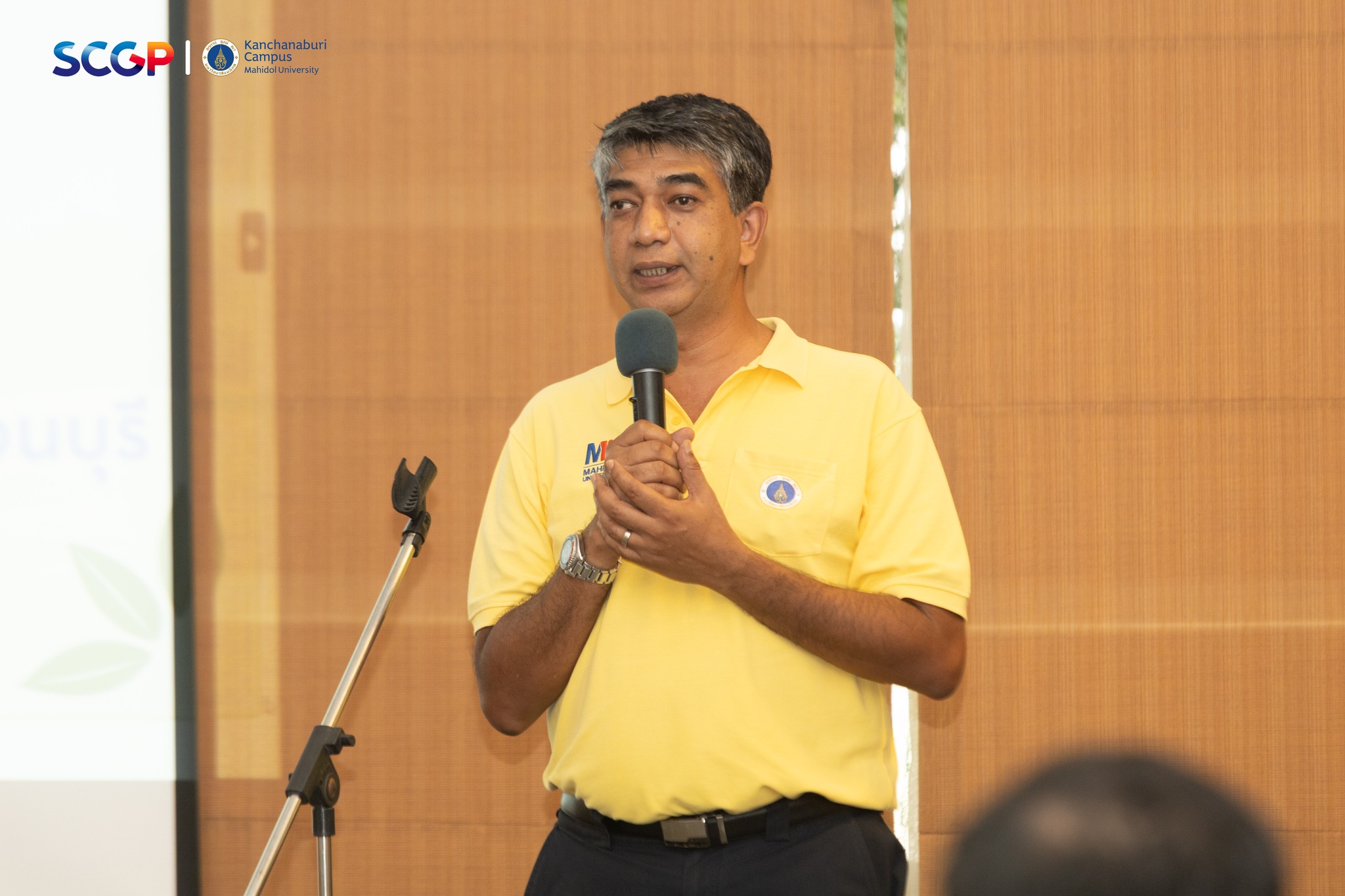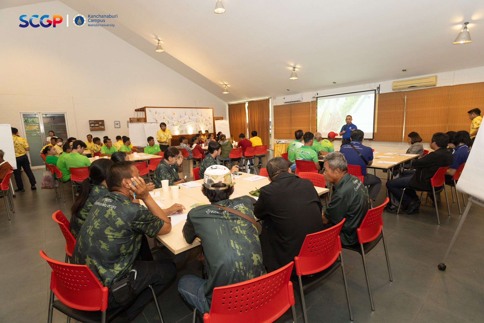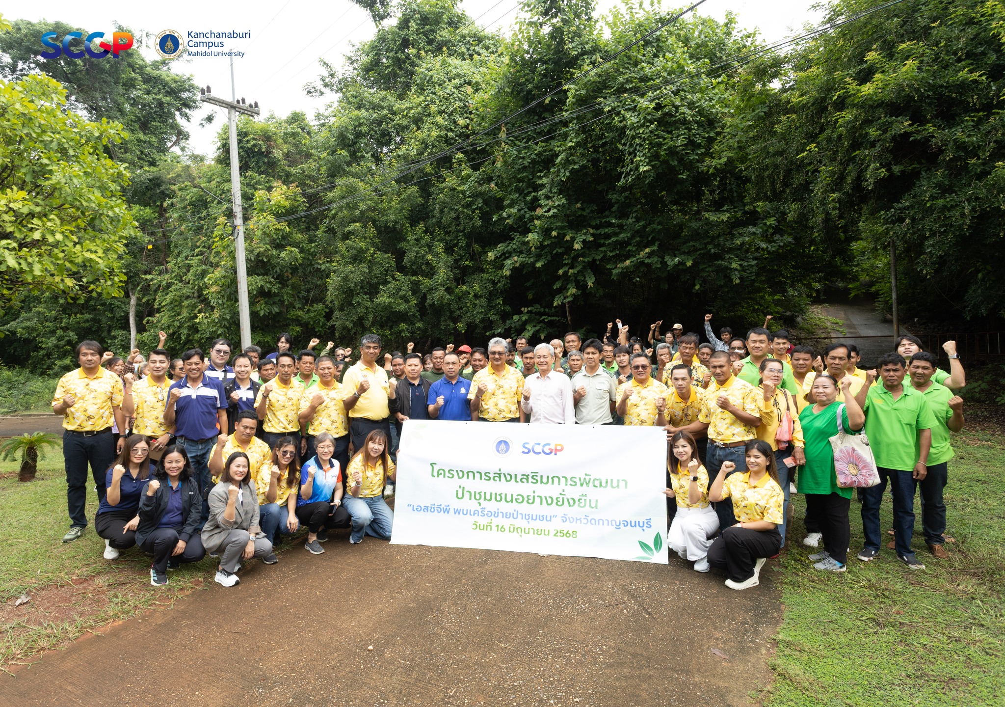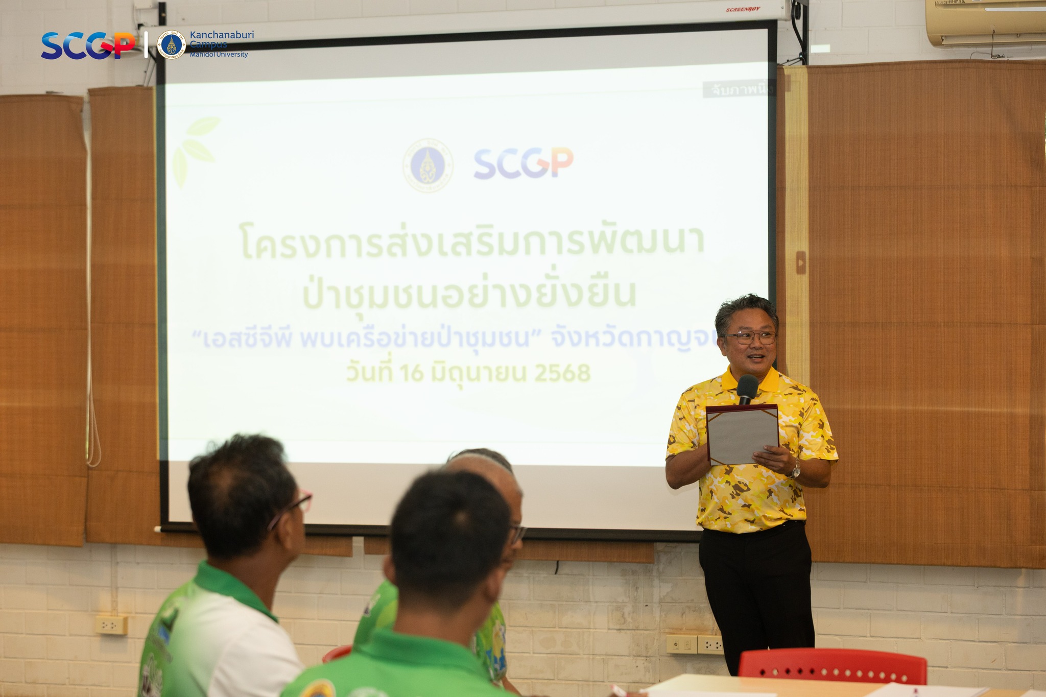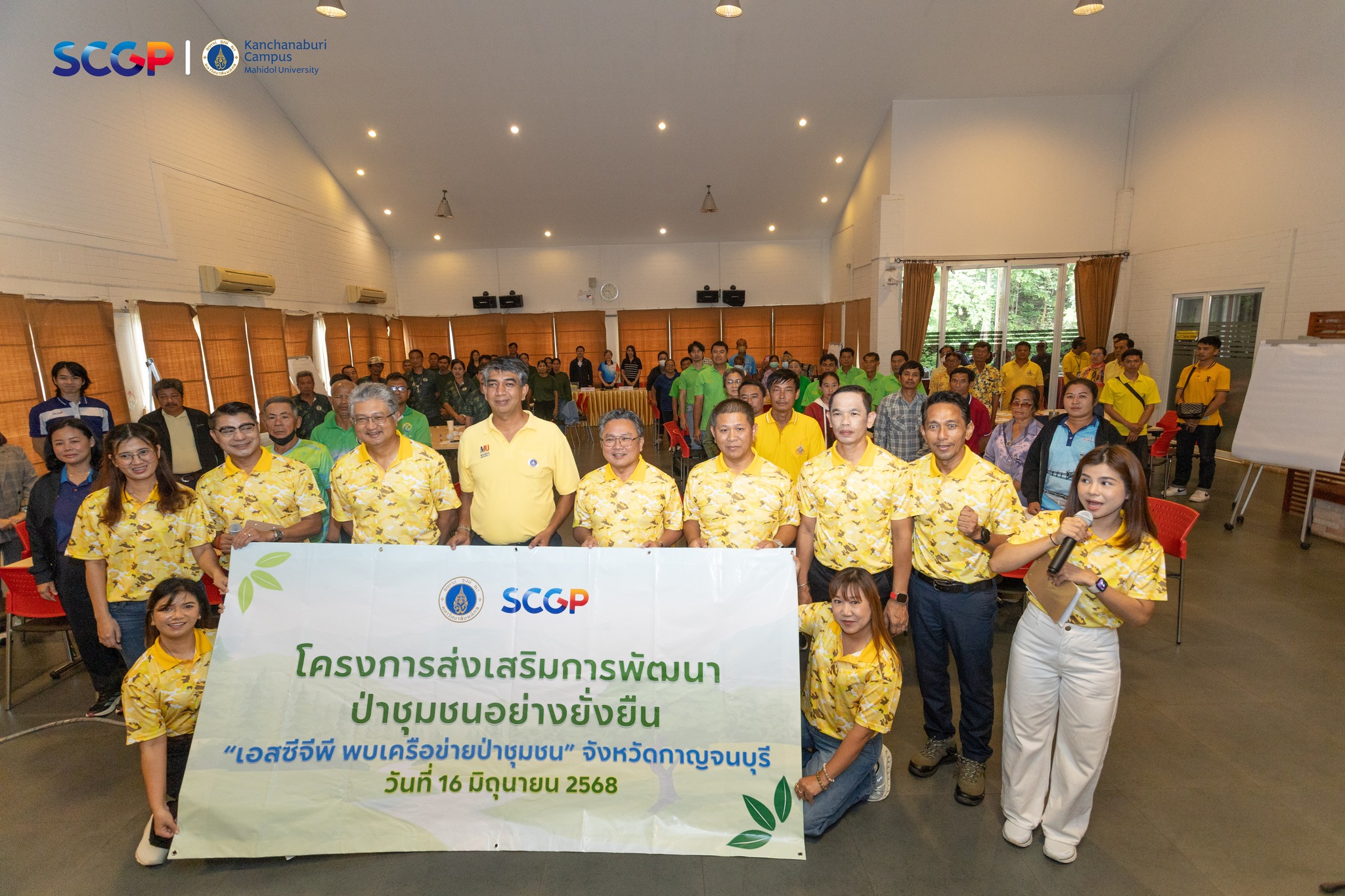 วันที่ 16 มิถุนายน 2568 คุณกฤษณ์ ขาวบาง ผู้ช่วยอธิการบดีฝ่ายวิทยาเขตกาญจนบุรี กล่าวต้อนรับคณะผู้บริหารและผู้เข้าร่วมโครงการ “ส่งเสริมการใช้ประโยชน์จากทรัพยากรป่าชุมชนอย่างยั่งยืน” จัดโดยบริษัท เอสซีจี แพคเกจจิ้ง (SCGP) ร่วมกับ มหาวิทยาลัยมหิดล วิทยาเขตกาญจนบุรี และมณฑลทหารบกที่ 17 ค่ายสุรสีห์ โดยคุณสหรัฐ พัฒนวิบูลย์ ผู้อำนวยการโรงงานวังศาลา บริษัทสยามคราฟท์อุตสาหกรรม จำกัด เป็นประธานเปิดงานและกล่าววัตถุประสงค์ของโครงการ กิจกรรมในโครงการประกอบด้วย การเสวนากลุ่มย่อย Faclitator การพัฒนาผลิตภัณฑ์จากป่าชุมชน, การอบรมในหัวข้อเรื่อง “หลักการและแนวคิดการใช้ประโยชน์จากป่าชุมชมชนอย่างยั่งยืน” โดยวิทยากรได้รับเกียรติจากรองศาสตราจารย์ ดร.ธรรมรัตน์ พุทธไทย และรองศาสตราจารย์ ดร.สุระ พัฒนเกียรติ คณะสิ่งแวดล้อมและทรัพยากรศาสตร์ มหาวิทยาลัยมหิดล และการอบรมในหัวข้อเรื่อง “กฎหมายและระเบียบที่เกี่ยวข้องกับการจัดการป่าชุมชน” ซึ่งวิทยากรได้รับเกียรติจากกรมป่าไม้ และกิจกรรมเชิงปฏิบัติการเรื่องการพัฒนาผลิตภัณฑ์จากป่าชุมชนโดยไม่ทำลายธรรมชาติ จัดขึ้นในระหว่างวันที่ 15-16 มิถุนายน 2568 ทั้งนี้ มีบุคลากรจากมหาวิทยาลัยมหิดล วิทยาเขตกาญจนบุรี, บริษัท เอสซีจี แพคเกจจิ้ง (SCGP) และกำลังพลจากมณฑลทหารบกที่ 17 เข้าร่วมกิจกรรม ณ ศูนย์พัฒนาและฝึกอบรมวิมานดิน มหาวิทยาลัยมหิดล วิทยาเขตกาญจนบุรี และในช่วงบ่ายเข้าร่วมกิจกรรมศึกษาดูงาน ณ ศูนย์การเรียนรู้ มณฑลทหารบกที่ 17 ด้านเศรษฐกิจพอเพียงและโครงการทหารพันธุ์ดี