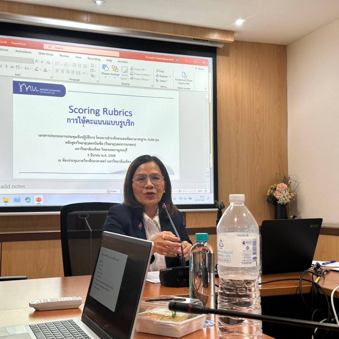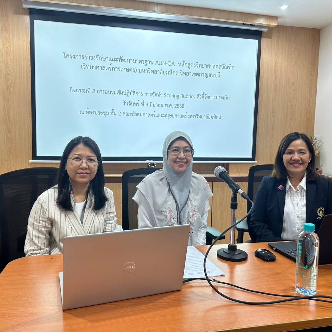 วันจันทร์ที่ 3 มีนาคม พ.ศ.2568 สาขาวิชาวิทยาศาสตร์การเกษตร มหาวิทยาลัยมหิดล วิทยาเขตกาญจนบุรี ได้จัดโครงการ “การอบรมเชิงปฏิบัติการและการจัดทำ Scoring Rubrics ตัวชี้วัดการประเมิน” ภายใต้โครงการธำรงรักษาและพัฒนามาตรฐาน AUN-QA วิทยาศาสตร์การเกษตร ณ ห้องประชุมคณะสังคมศาสตร์และมนุษยศาสตร์ มหาวิทยาลัยมหิดล ศาลายา