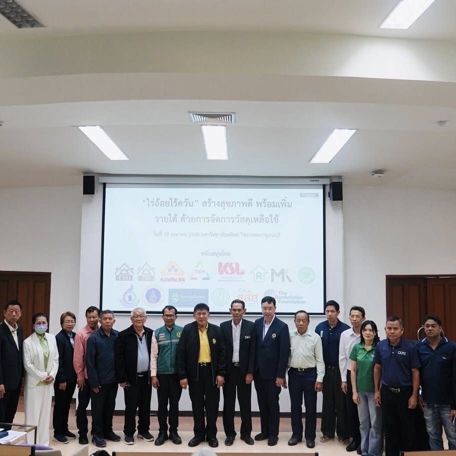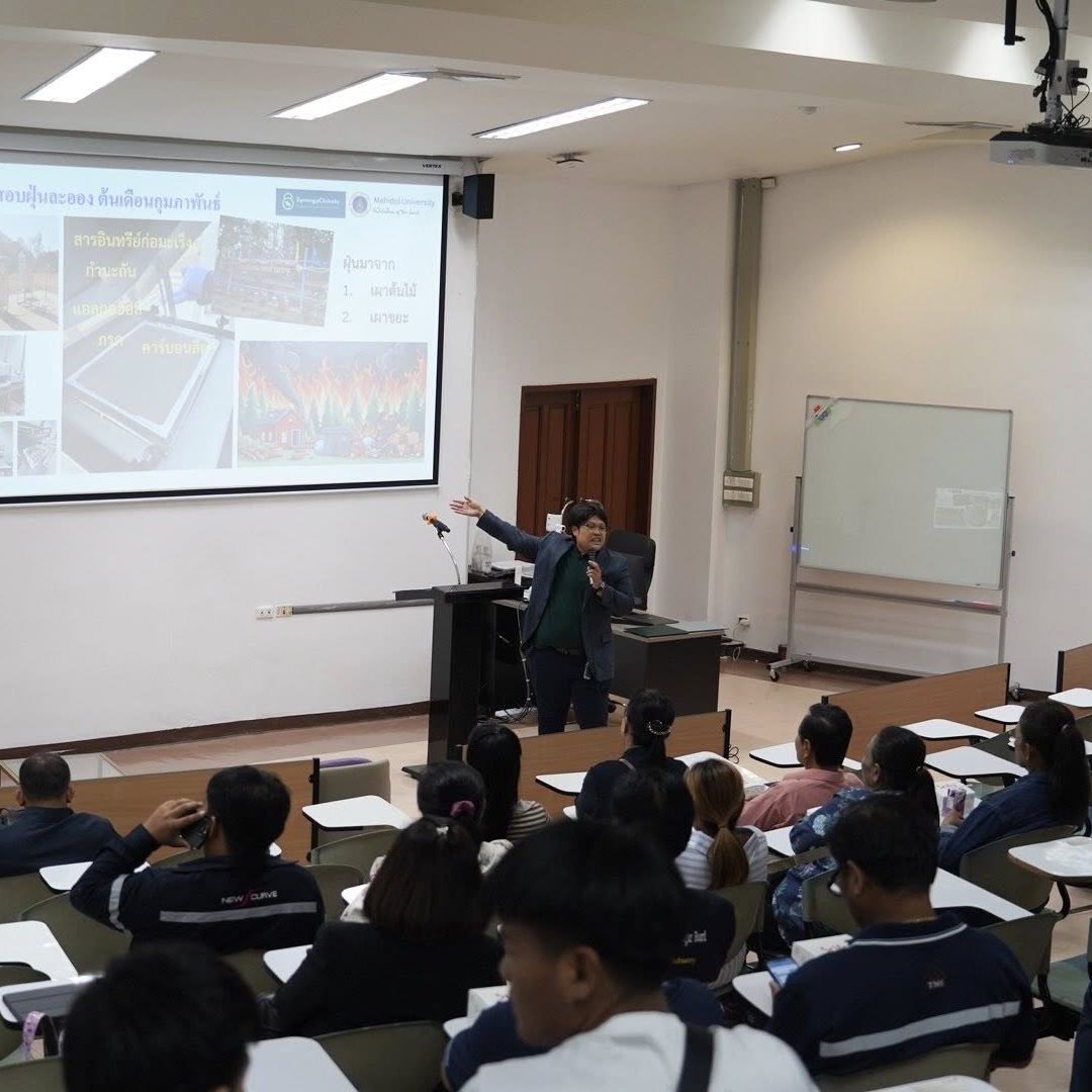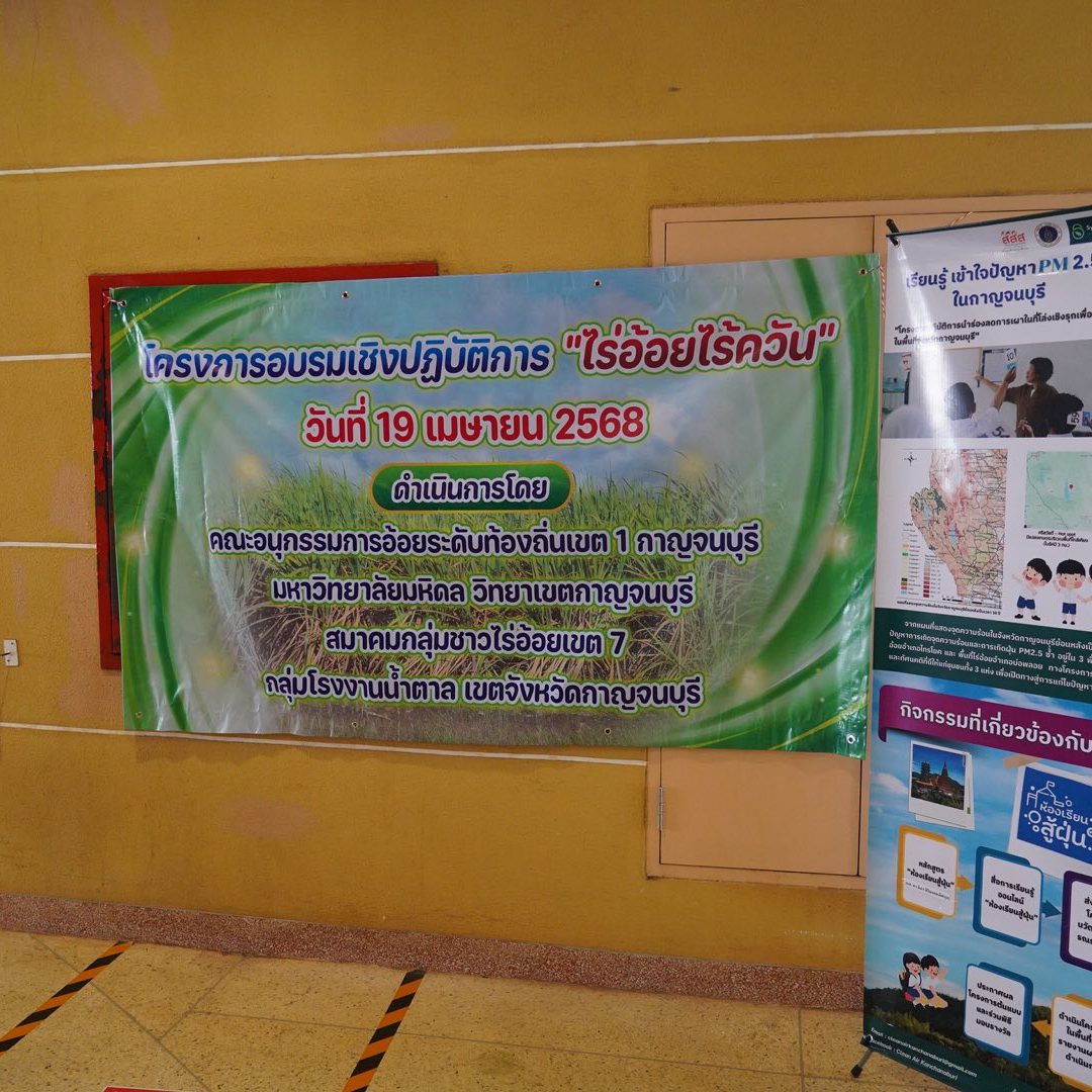วันที่ 19 เมษายน 2568 ผู้ช่วยศาสตราจารย์ ดร.ธัชวีร์ ลีละวัฒน์ รองอธิการบดีฝ่ายวิทยาเขตกาญจนบุรี กล่าวต้อนรับ ว่าที่ร้อยตรีศุภมงคล บูชาถ่ายเทศ รองผู้ว่าราชการจังหวัดกาญจนบุรี ในโอกาสเป็นประธานเปิดการอบรมเชิงปฏิบัติการตามแนวทางการเพิ่มมูลค่าในระบบอุตสาหกรรมอ้อยและน้ำตาลทราย เรื่อง “ไร่อ้อยไร้ควัน” โดยนายวีระศักดิ์ สุขทอง เกษตรจังหวัดกาญจนบุรี กล่าวรายงานวัตถุประสงค์ ซึ่งสำนักงานเกษตรจังหวัดกาญจนบุรีร่วมกับภาคีเครือข่ายภาครัฐและเอกชน ร่วมกันจัดการอบรมเชิงปฏิบัติการตามแนวทางการเพิ่มมูลค่าในระบบอุตสาหกรรมอ้อยและน้ำตาลทราย เรื่อง “ไร่อ้อยไร้ควัน” สร้างสุขภาพดี พร้อมเพิ่มรายได้ ด้วยการจัดการวัสดุเหลือใช้ มีวัตถุประสงค์เพื่อเพิ่มรายได้ให้แก่เกษตรกรและลดการเผาอ้อยอย่างยั่งยืน โดยมีผู้เข้าร่วมกิจกรรมมากกว่า 100 คน อาทิ เกษตรกรในจังหวัดกาญจนบุรี, เจ้าหน้าที่จากโรงงานน้ำตาล และหน่วยงานภาครัฐด้านการเกษตร โดยมีวิทยากรหลัก ได้แก่ อาจารย์ ดร.เนติยา การะเกตุ, อาจารย์ ดร.ประไพพิศ สุวิทย์ชยานนท์ อาจารย์ประจำสาขาวิชาวิทยาศาสตร์การเกษตร มหาวิทยาลัยมหิดล วิทยาเขตกาญจนบุรี และทีมงานกลุ่ม Cluster Synergy Climate ร่วมเป็นวิทยากรบรรยายและฝึกปฏิบัติการให้กับผู้เข้ารับการอบรม เช่น การเพิ่มมูลค่าวัสดุทางการเกษตร ใช้เศษวัสดุในการเพาะเห็ด, การทำปุ๋ยหมัก, การทำถ่าน Biochar และการเพิ่มมูลค่าน้ำอ้อย เป็นต้น ณ ห้อง L-316 และห้อง L-103 อาคารปฏิบัติการวิทยาศาสตร์ วิทยาเขตกาญจนบุรี